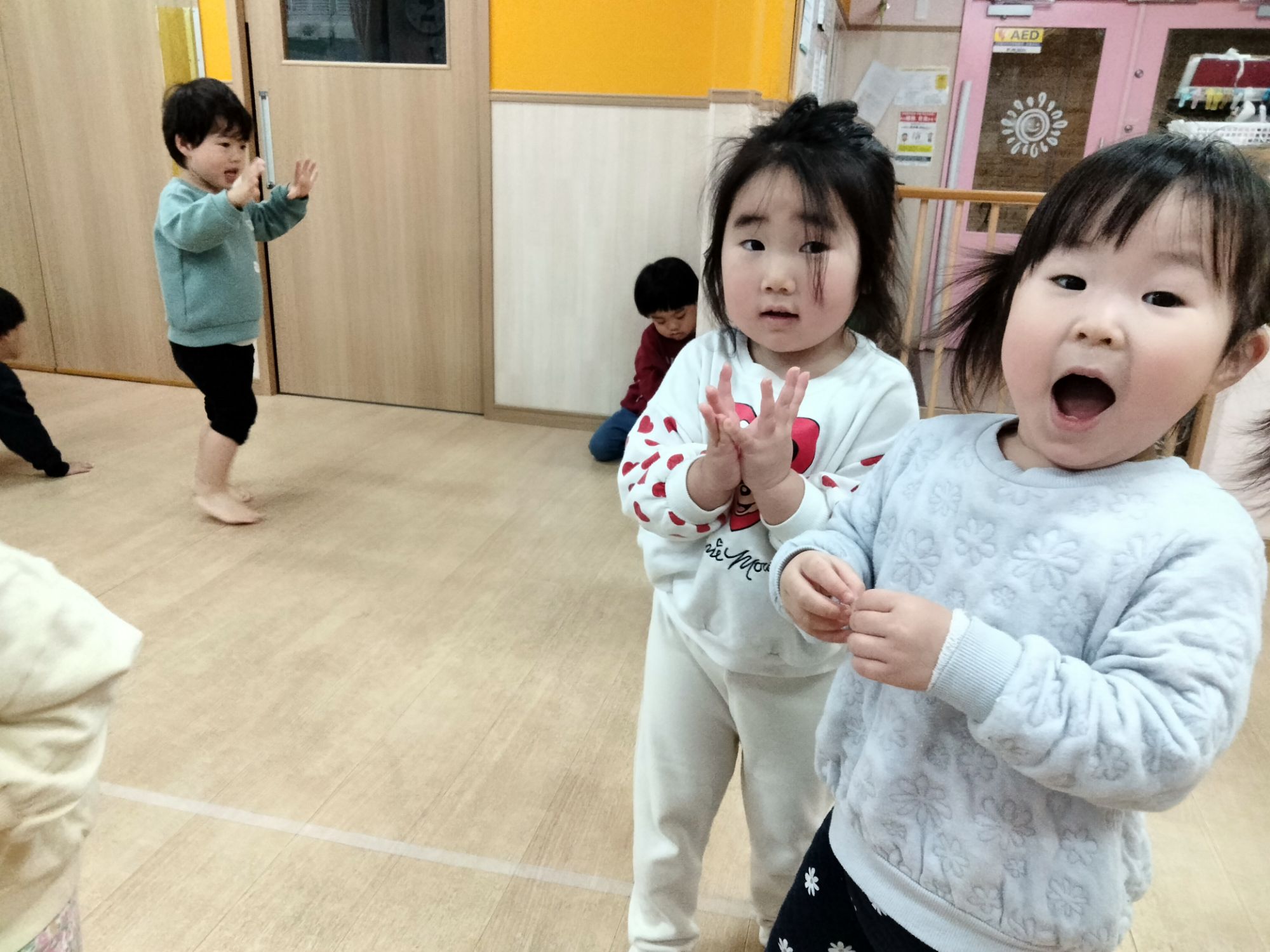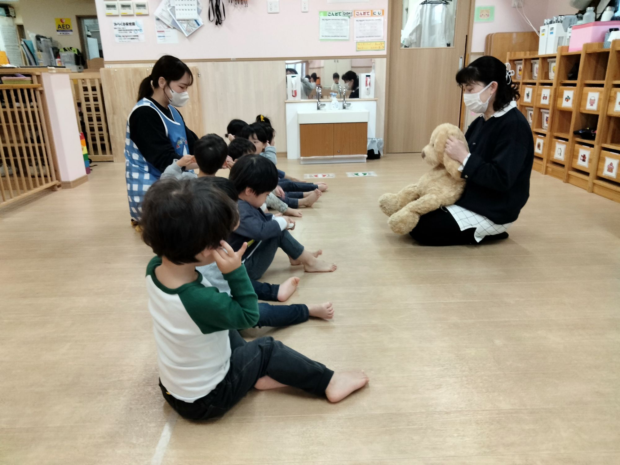 最初は手を叩いたり、耳を触ったりとリトミックの始まりのお歌を歌い1人ずつお名前シールをもらいます!