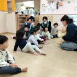4人1列で座りピアノのリズム・音を聴き分けて、前のお友だちの背中を撫でたり優しくタッチしたり指先でツンツン!