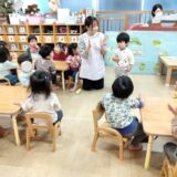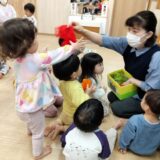 先生がこいのぼりの歌をうたい、子どもたちは1・2・3、1・2・3…と、ひとつずつおはじきに指を置いてリズムをとっていきます。3拍子のリズムの経験に繋がります。
