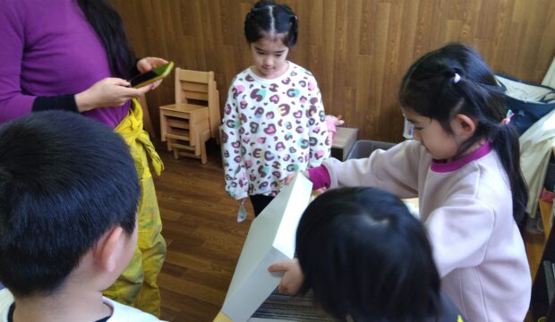イラストを見て、「オタマジャクシ!」「カエルだー!」などと次々に言っていく子どもたち…。