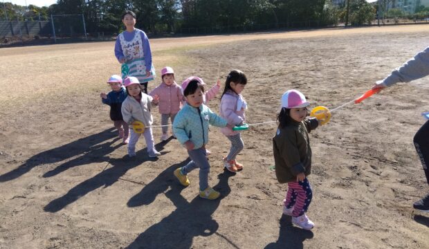 準備体操のダンス遊びでは、“どうぶつでんしゃがやってきた”という新しい曲でダンスをしました!うさぎ、さる、わに🐊など…色々な動物が電車に乗ってくる体操です☺