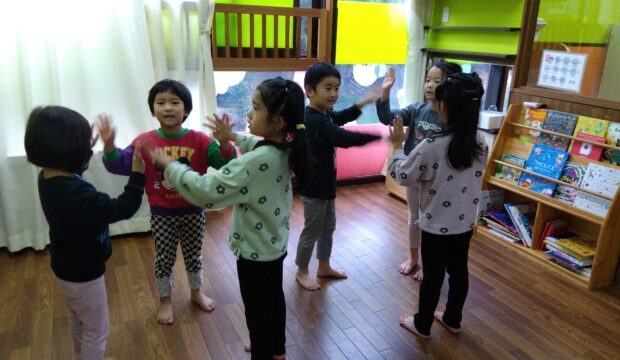 ゆったりとした音に合わせて向かい合って手を繋ぎ、ゆらゆらと揺れたり…