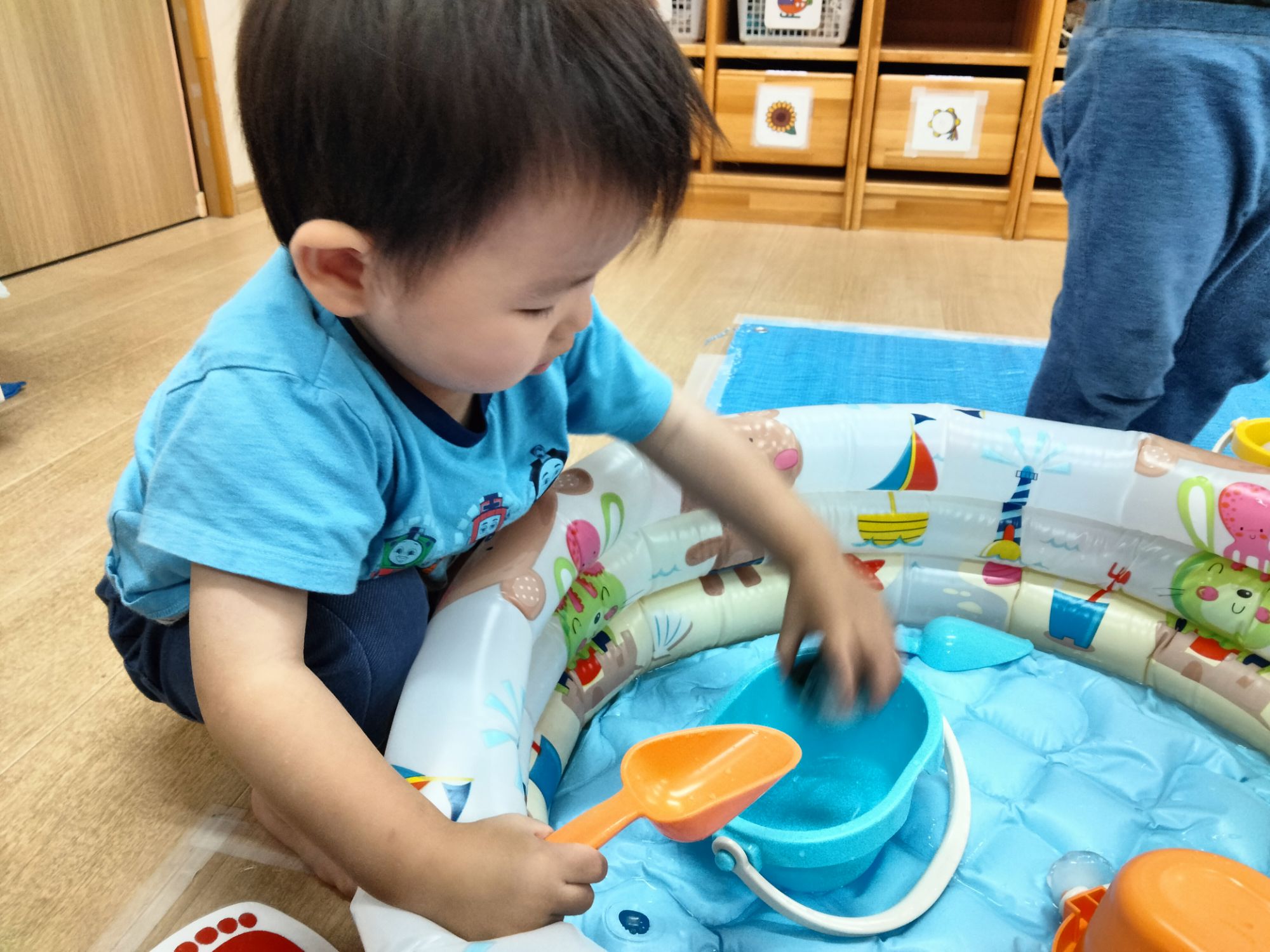 小さいショベルを使って上手にバケツに運びます🪣