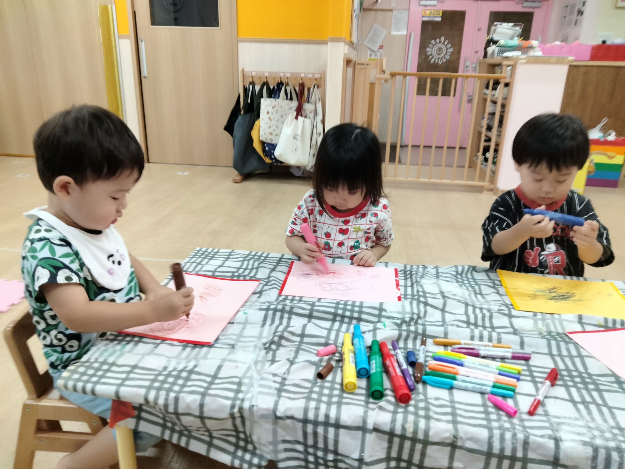 好きな色のカバンを選び、好きな色のペンで自由に模様を描いていました✨️「青がいいー」「ピンクで描くー」とお話しながら、黙々と描くこどもたち😁
