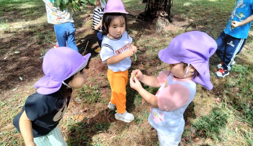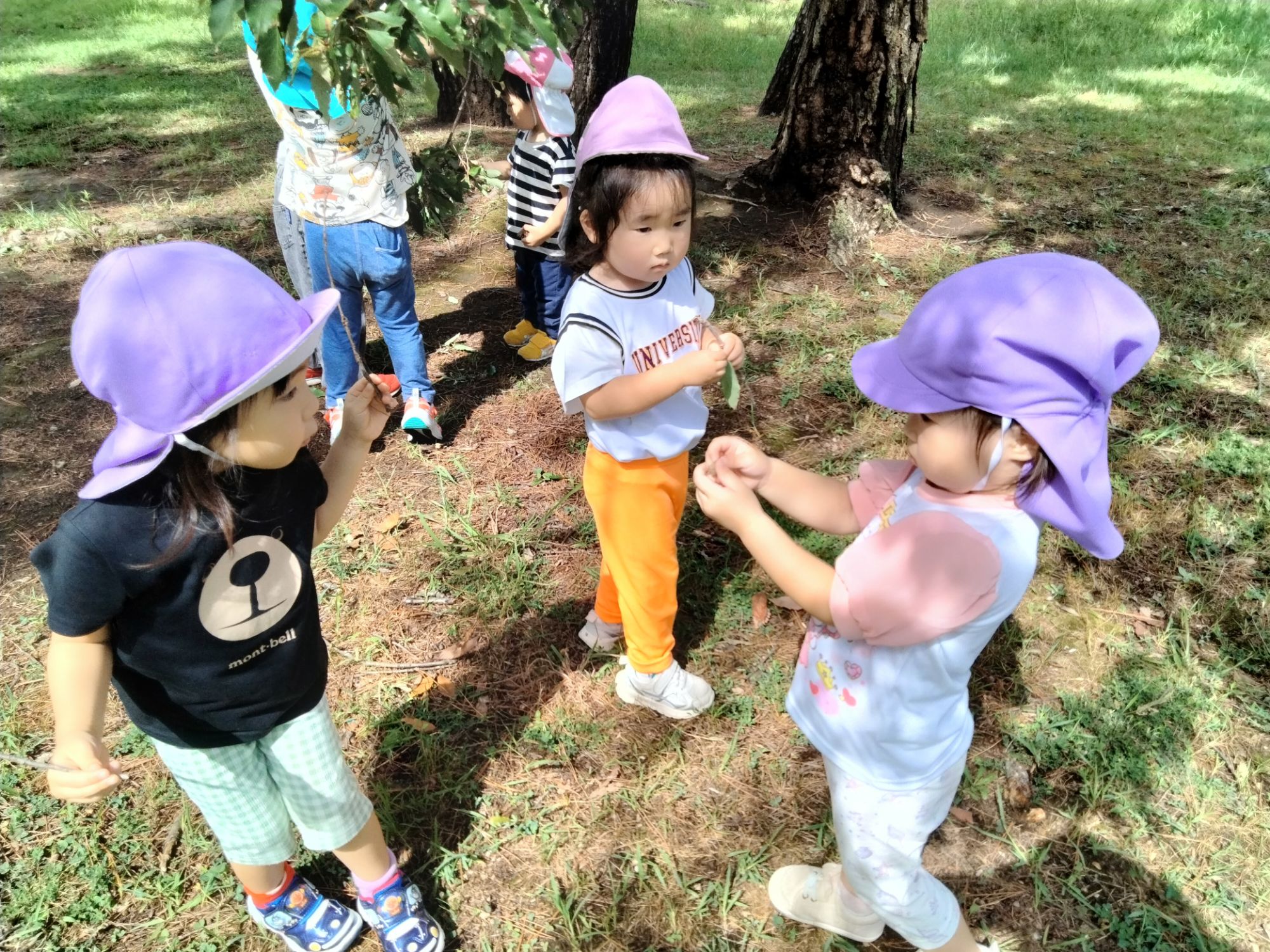 こちらは、女子会😆?をして、それぞれ見つけた葉っぱ、枝やどんぐりを見せ合いっこしていました\(^o^)/…「どこにあったのー?」「あっちだよー」としっかり会話をしていて、とっても微笑ましかったです😊