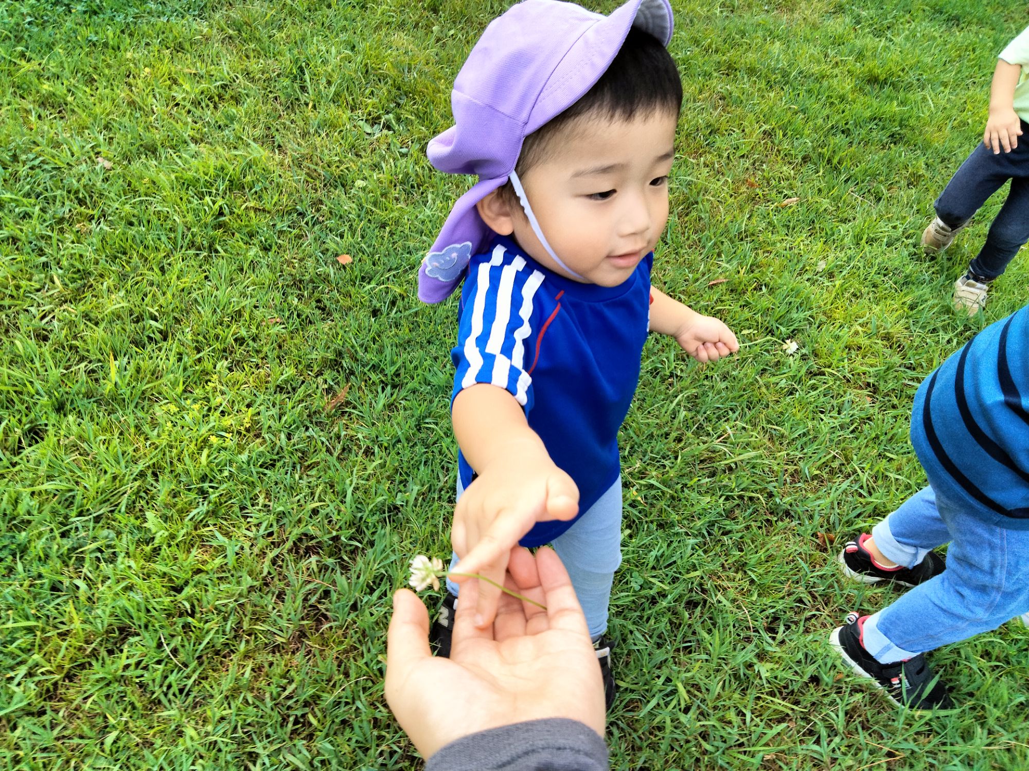シロツメクサを見つけると、「白いお花あったから、先生にあげるね」と保育者にくれる姿も見られました🌟