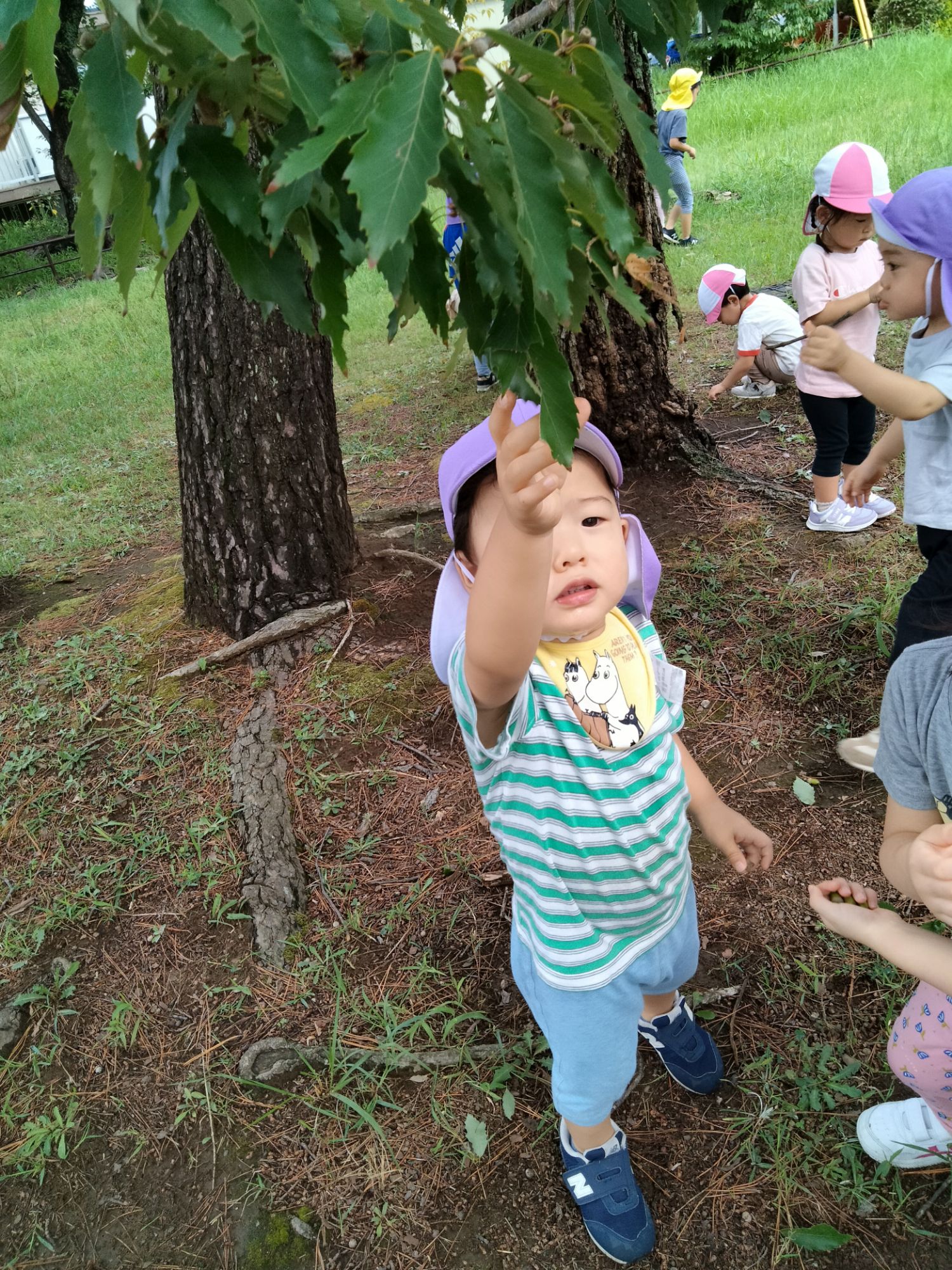 木になっている緑のどんぐりを見つけると、触りたくて手を伸ばしたり、背伸びしたりして頑張っていました!