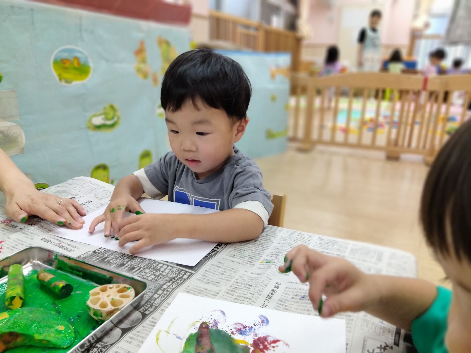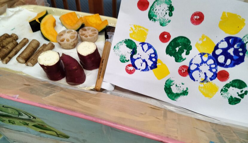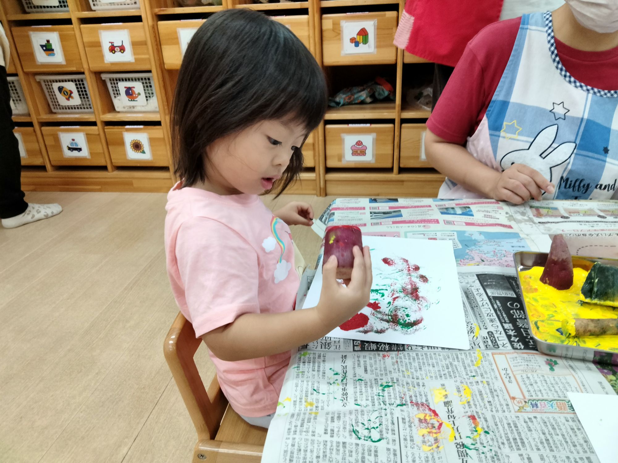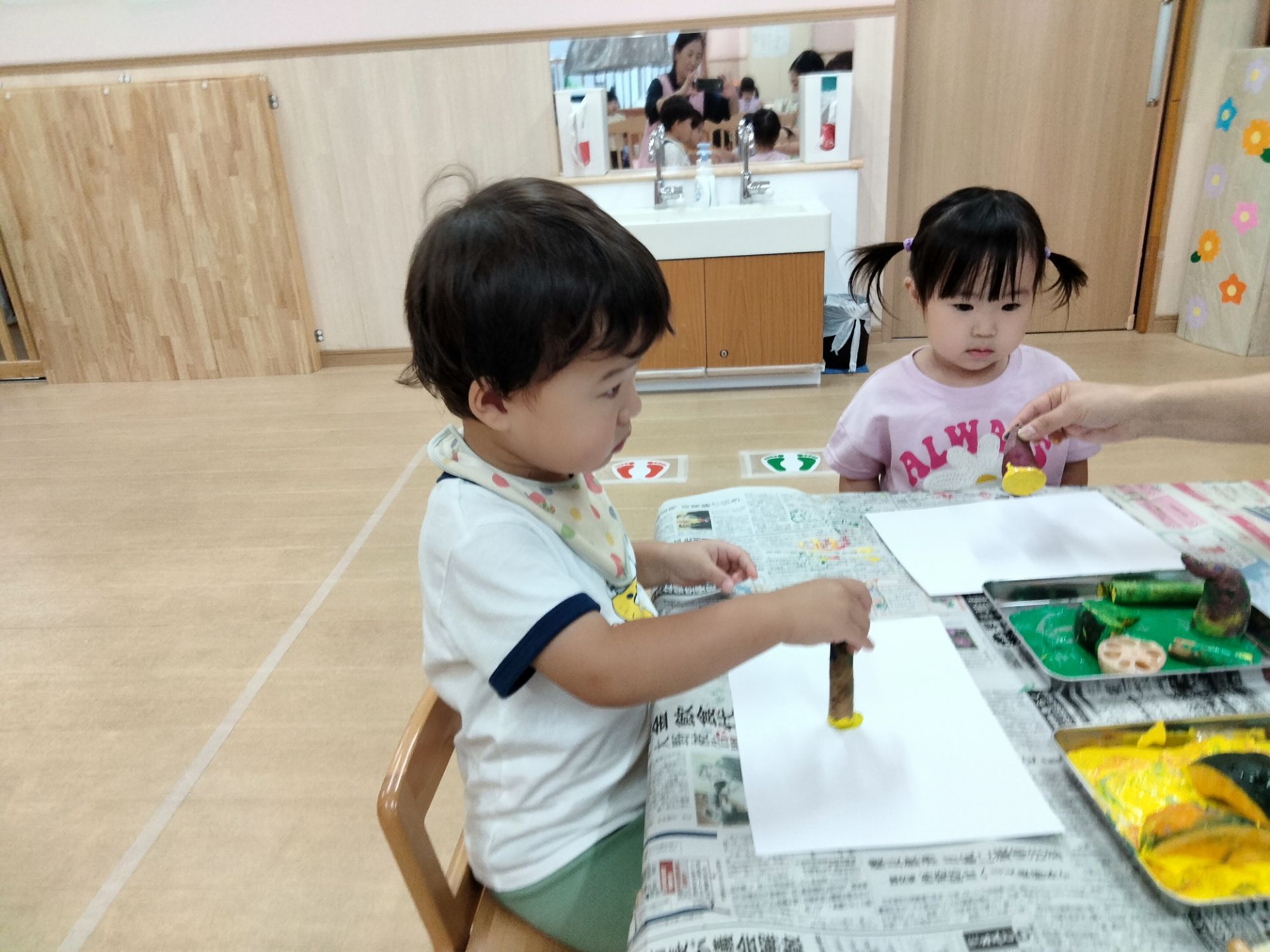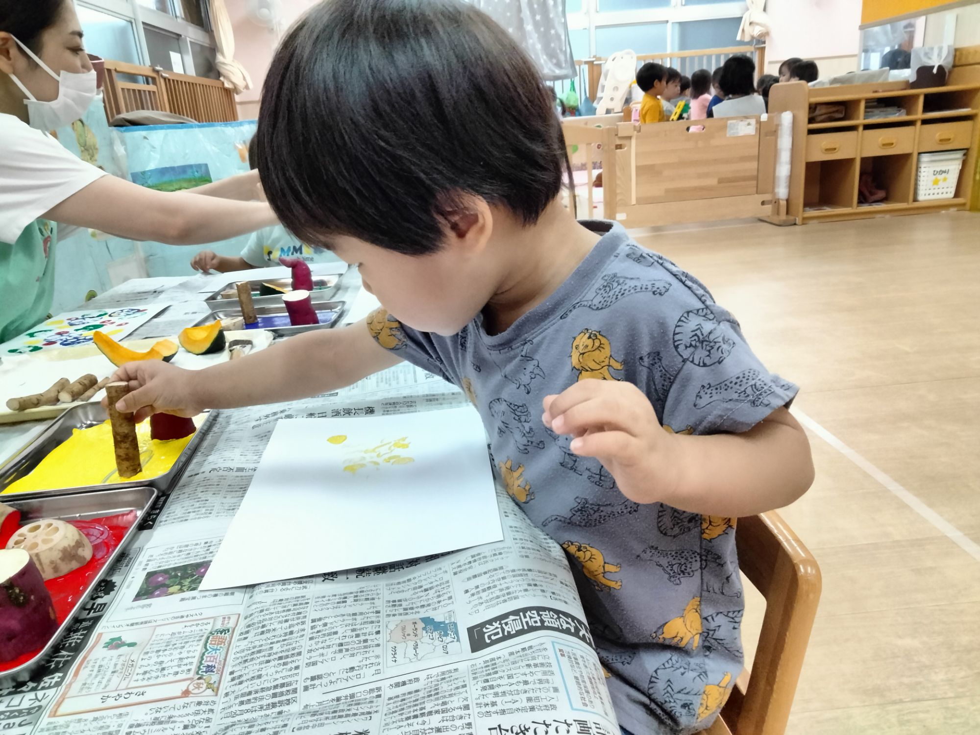 切った断面を見て、スタンプしたらどんな形になるか、よく見ていたこどもたち😀たくさん押して、色んな作品が完成\(^o^)/✨️