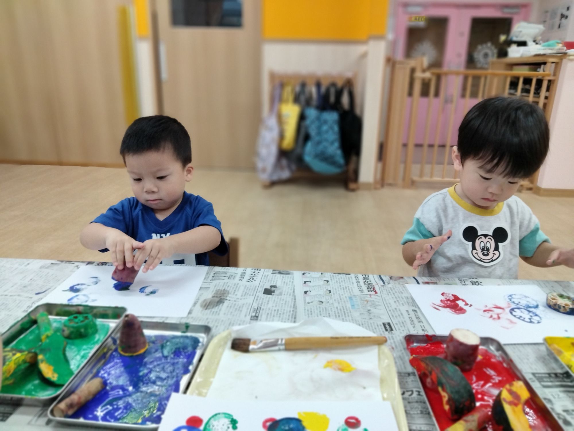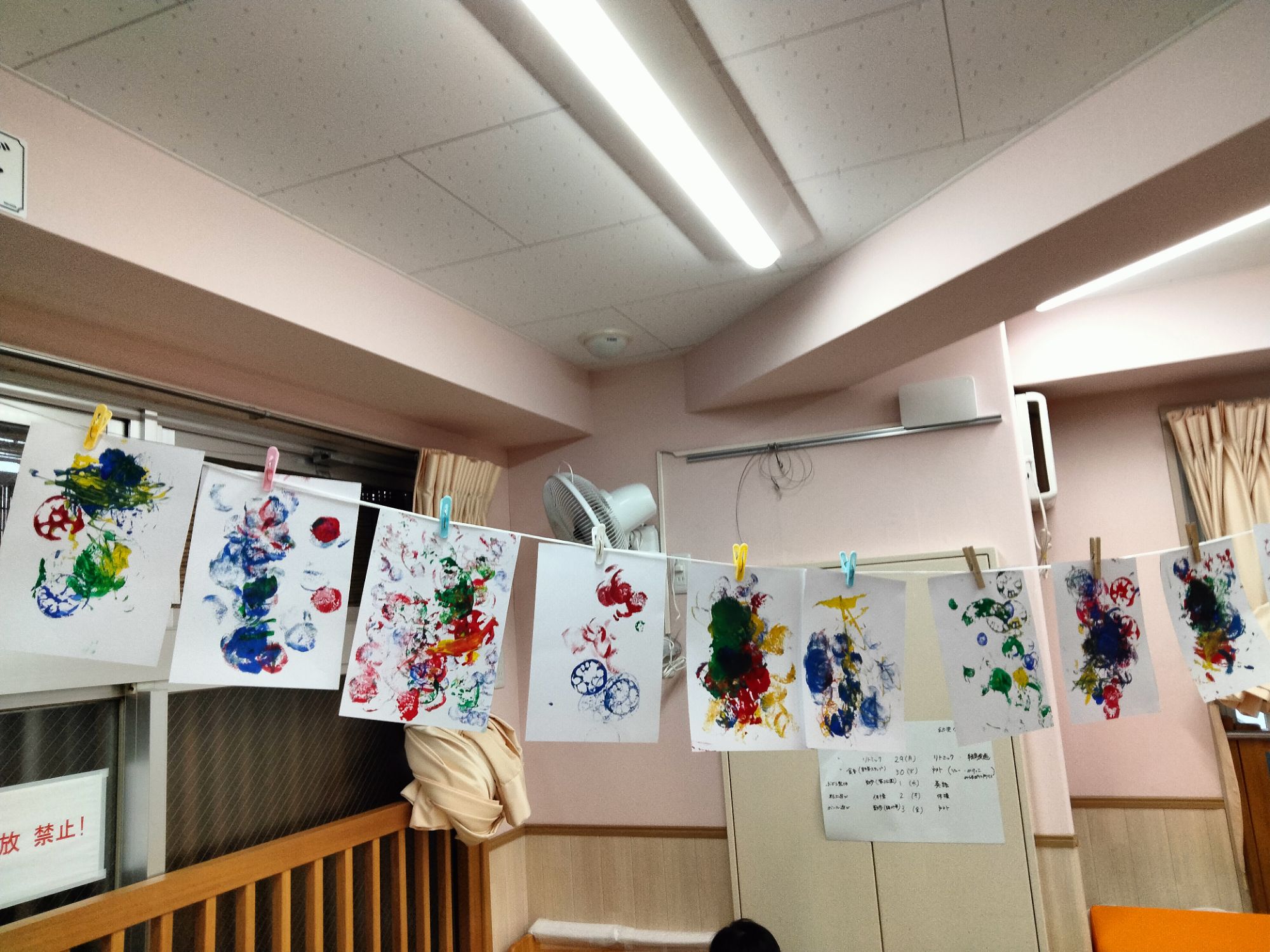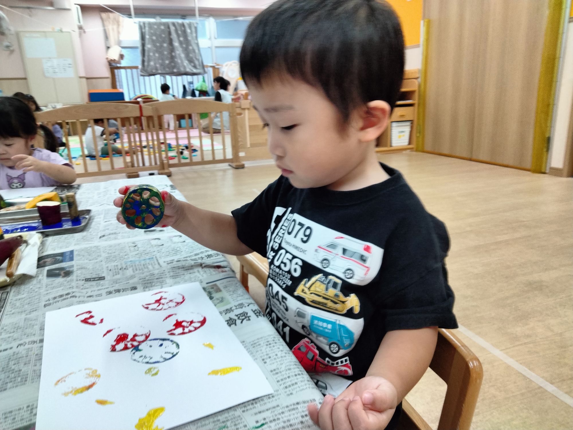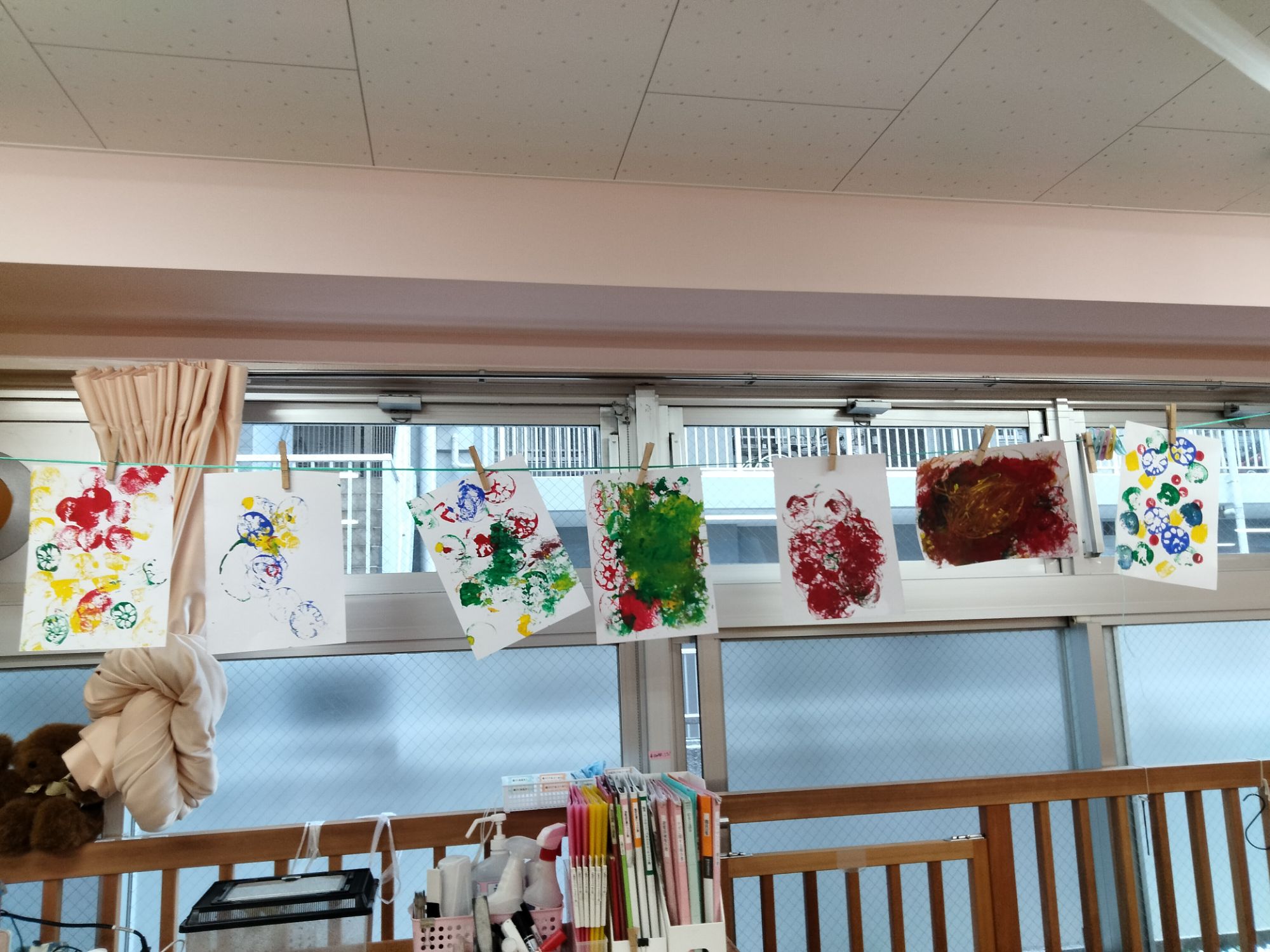 押した後は、どんな形になったか観察したり、保育者や友だちにお話する姿も見られて、手が絵の具だらけになるくらい楽しんでいました\(^o^)/✨️