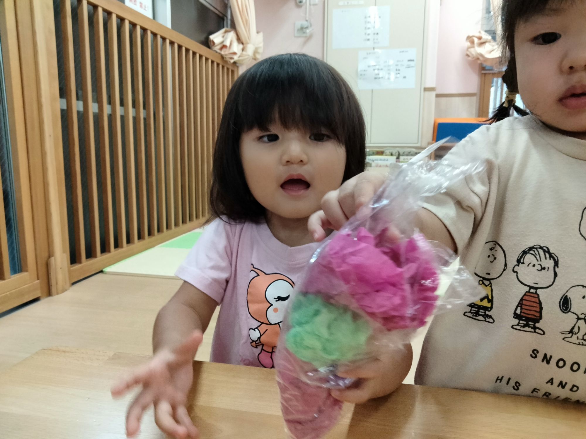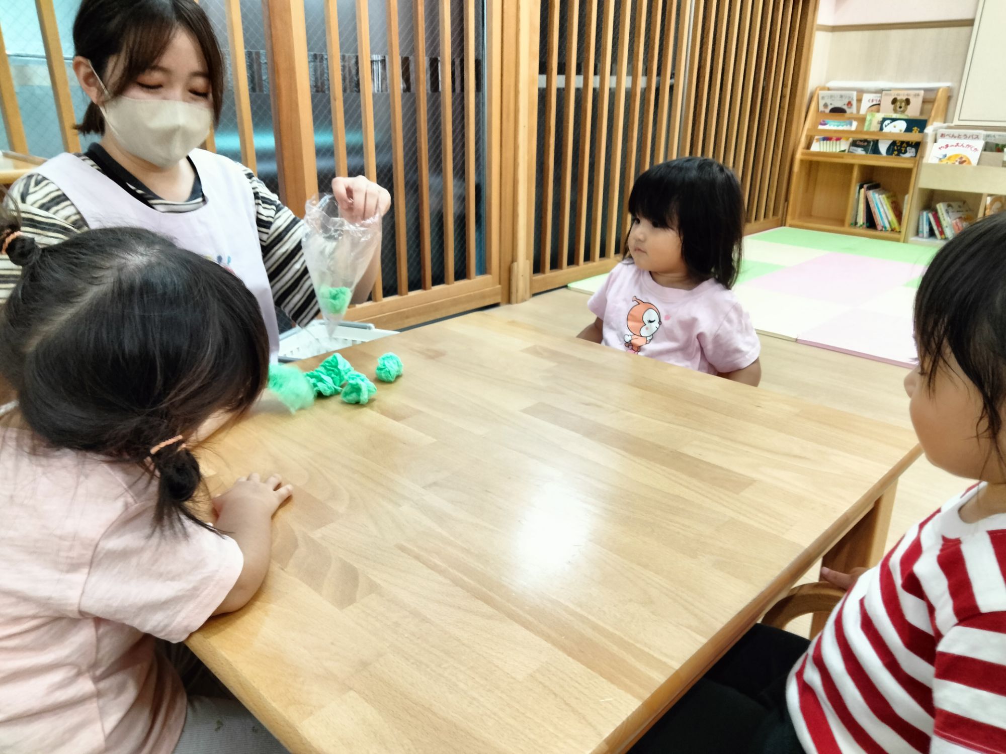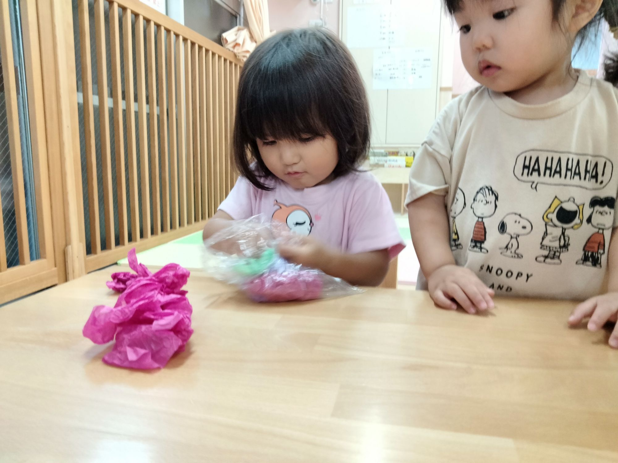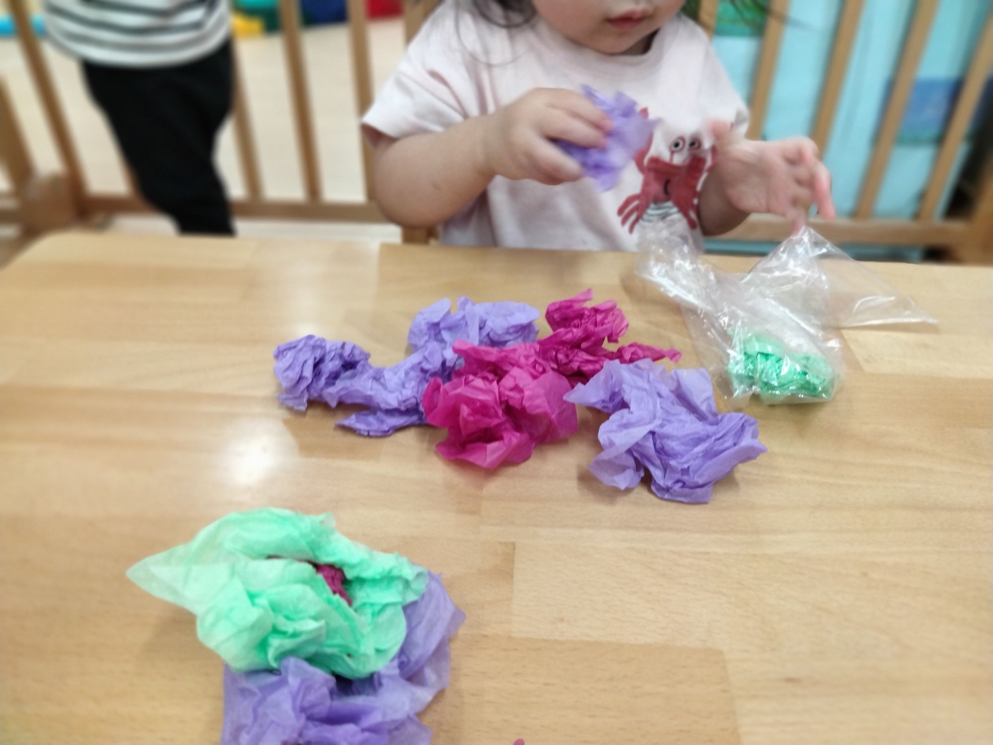 自分で丸めたものを袋に入れる達成感や、色が重なり合ってきれいに見えることを発見する子もいて、それぞれに楽しみながら取り組むことができました!