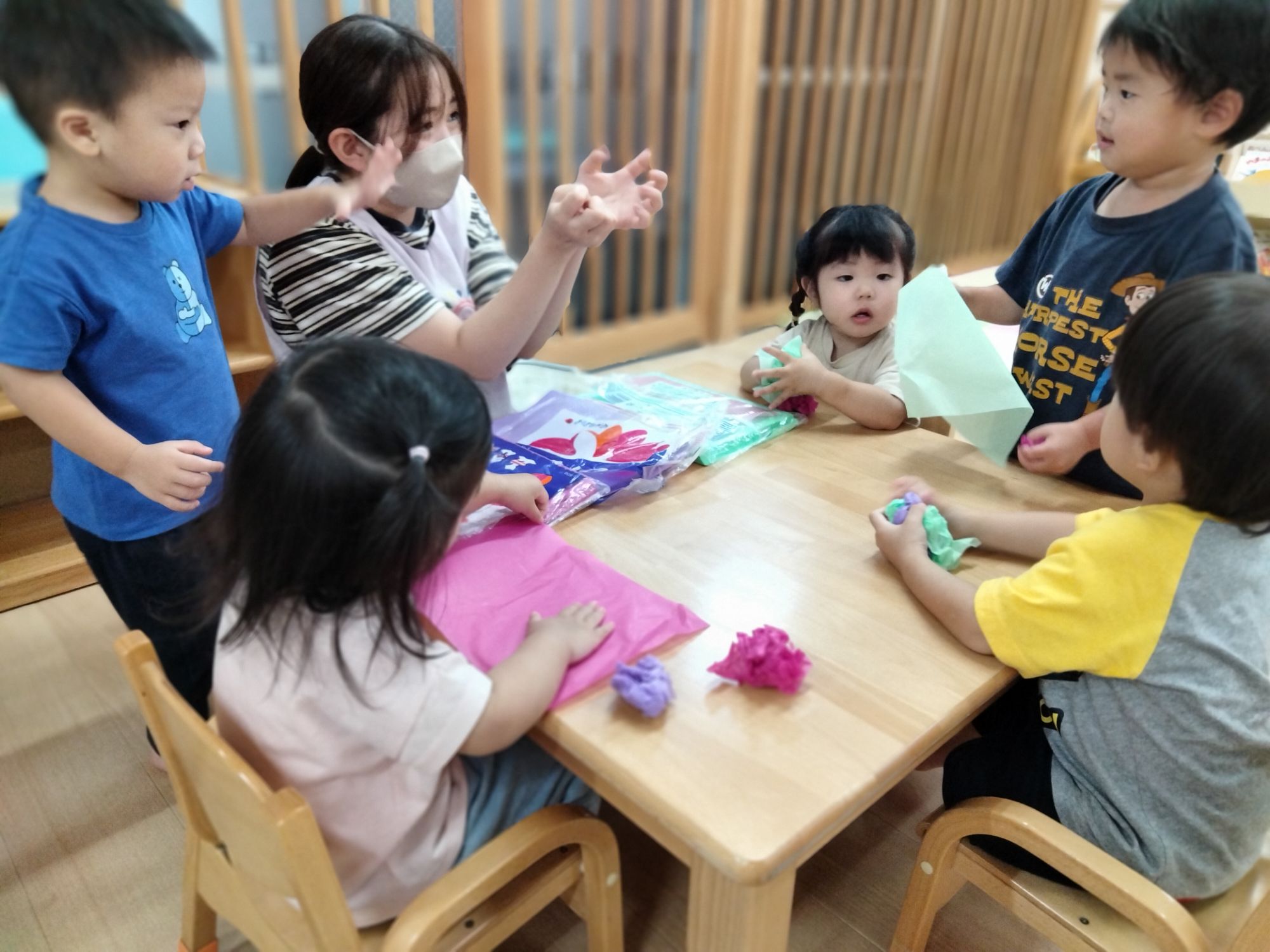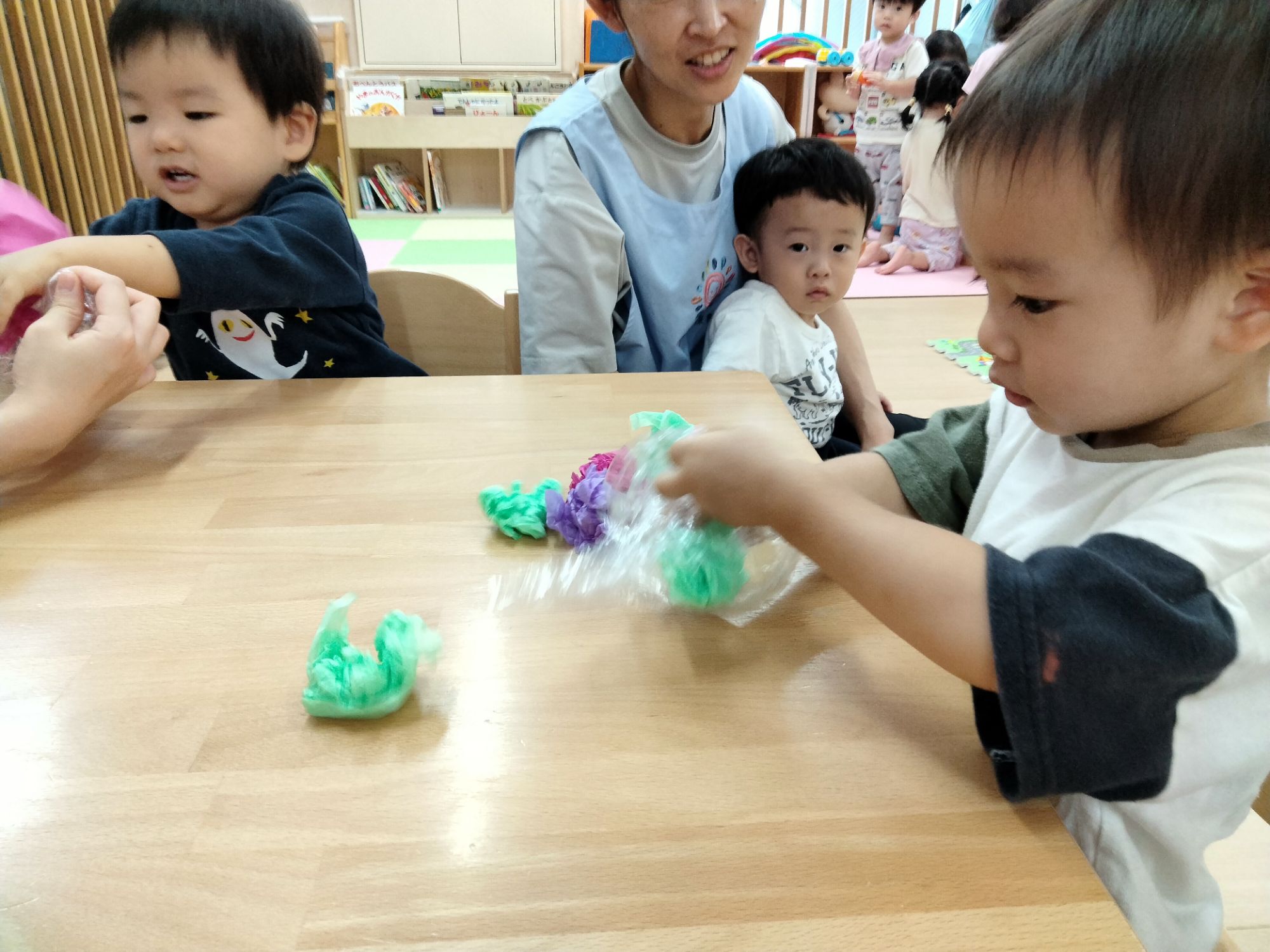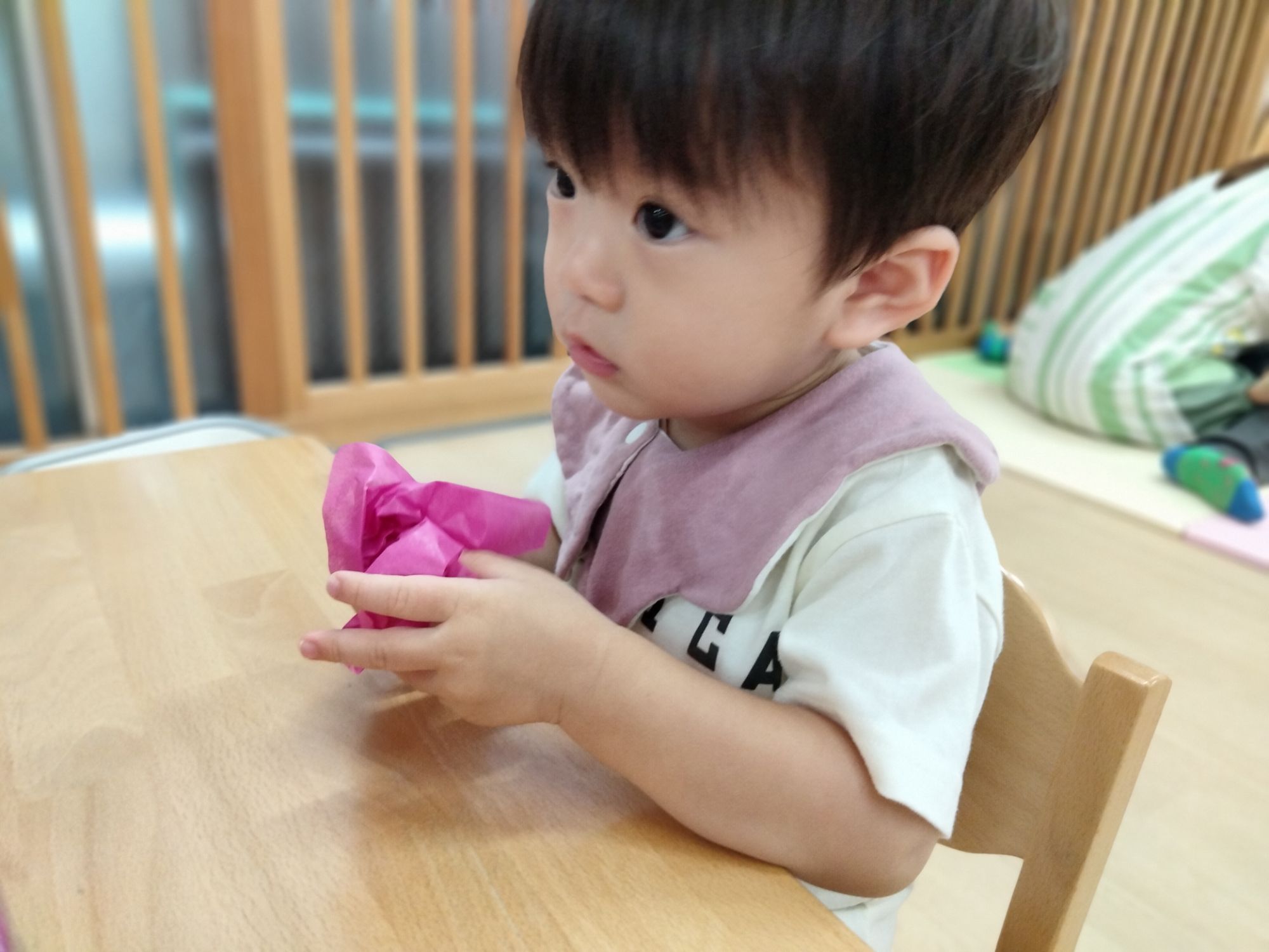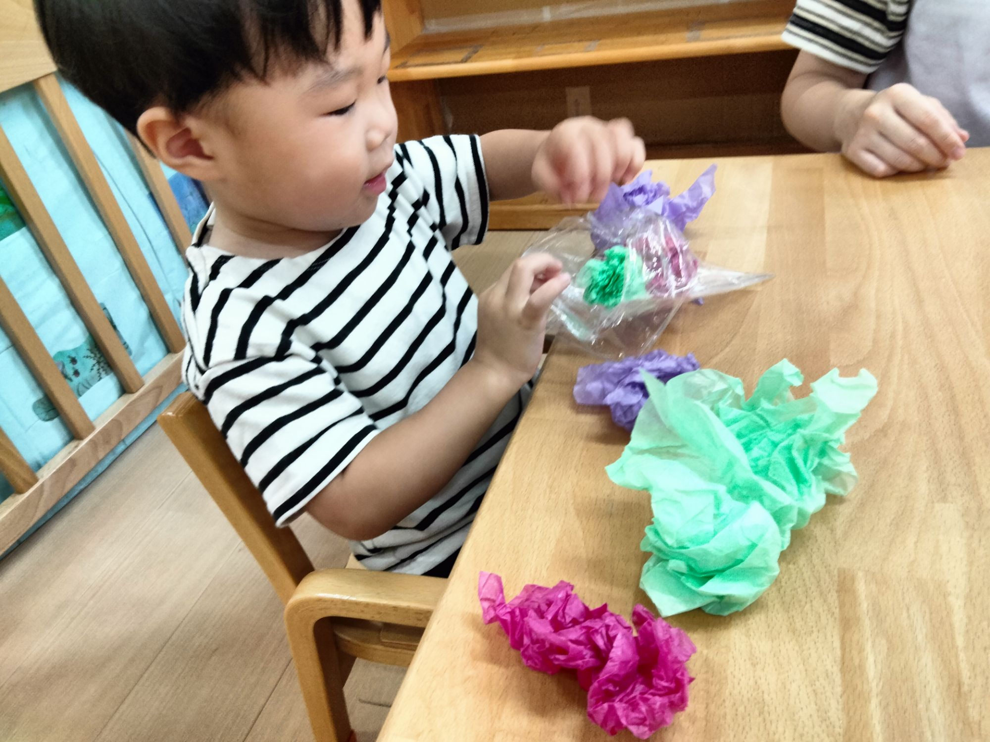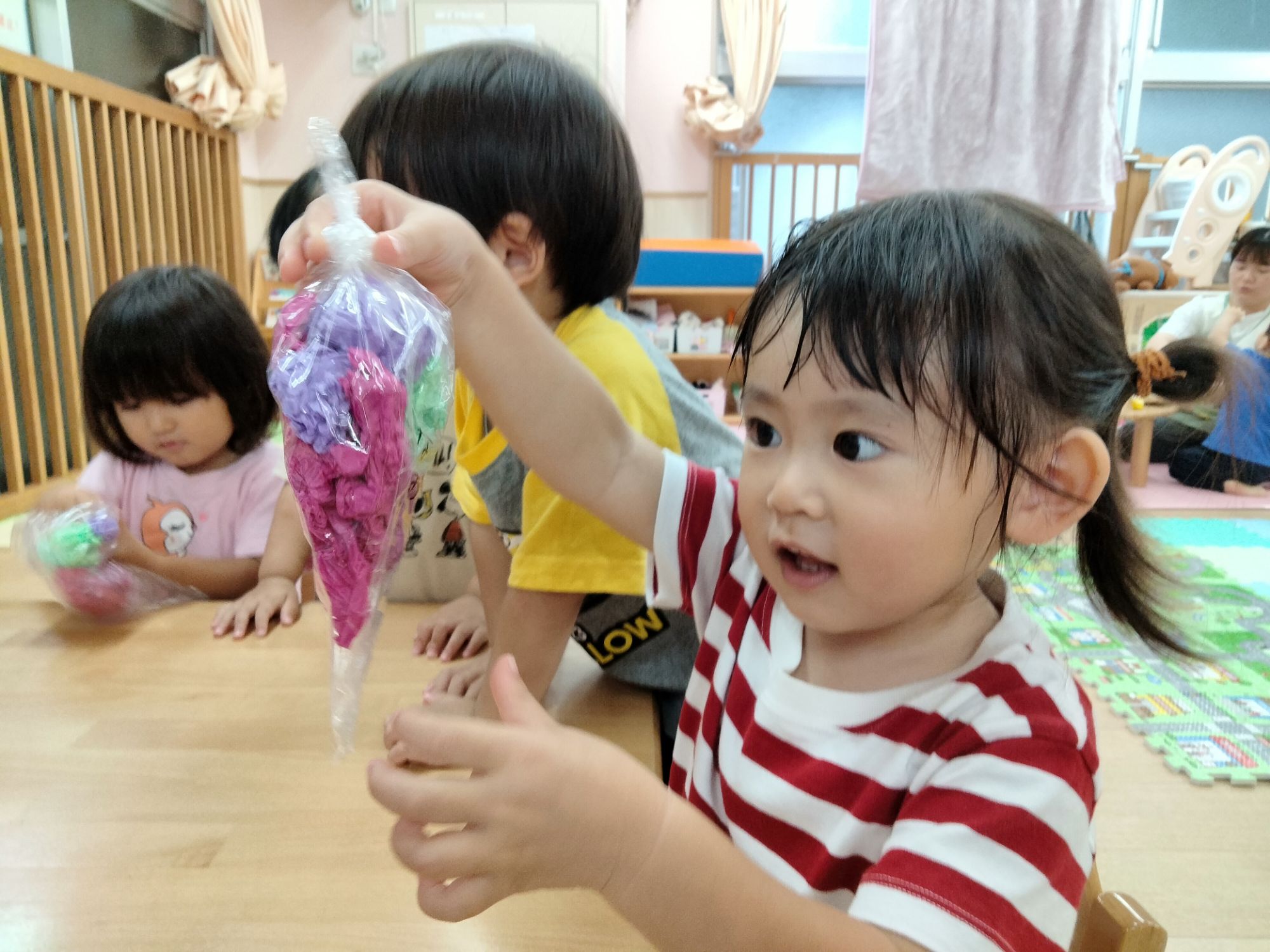 自分で丸めたものを袋に入れる達成感や、色が重なり合ってきれいに見えることを発見する子もいて、それぞれに楽しみながら取り組むことができました!