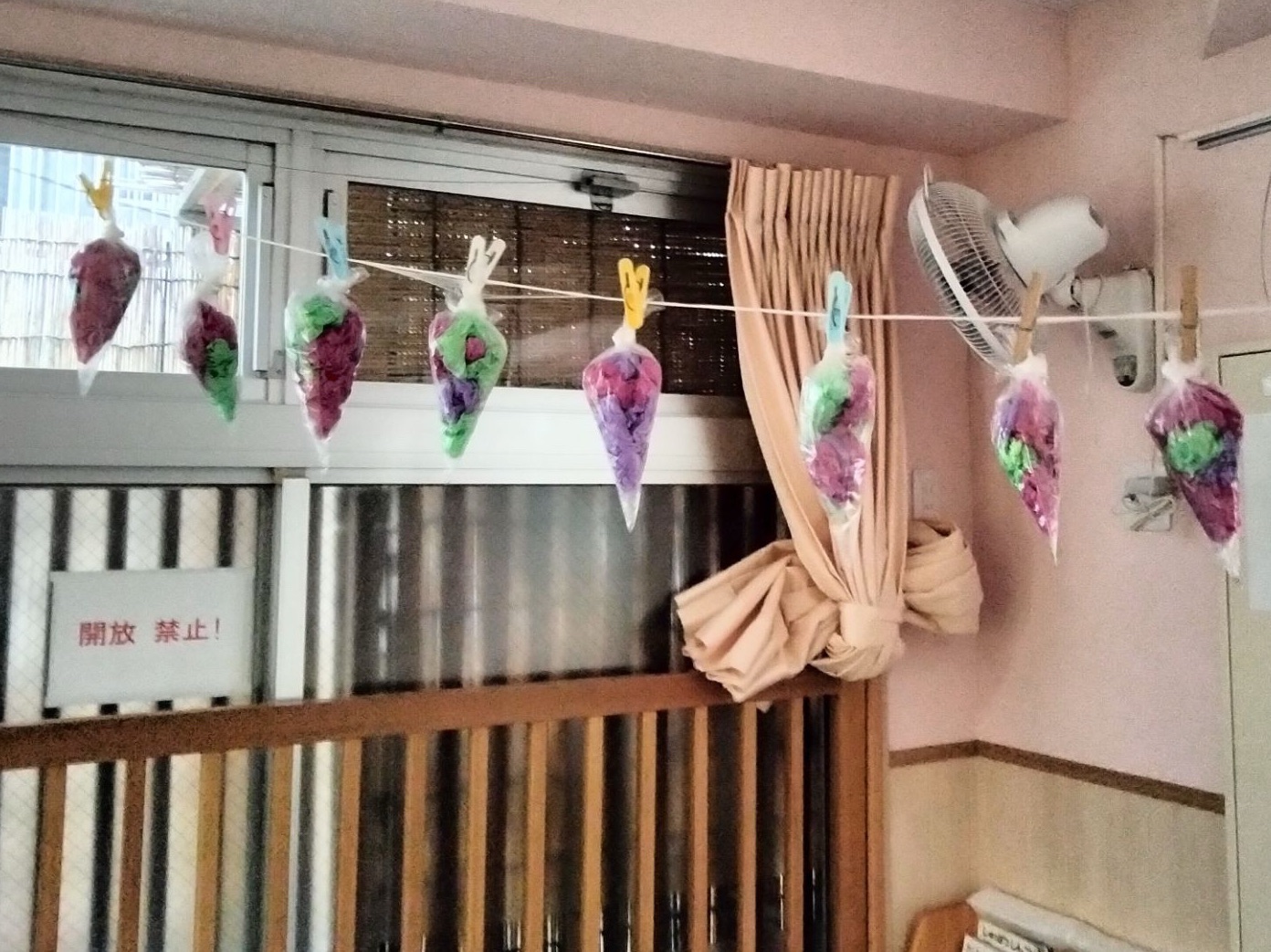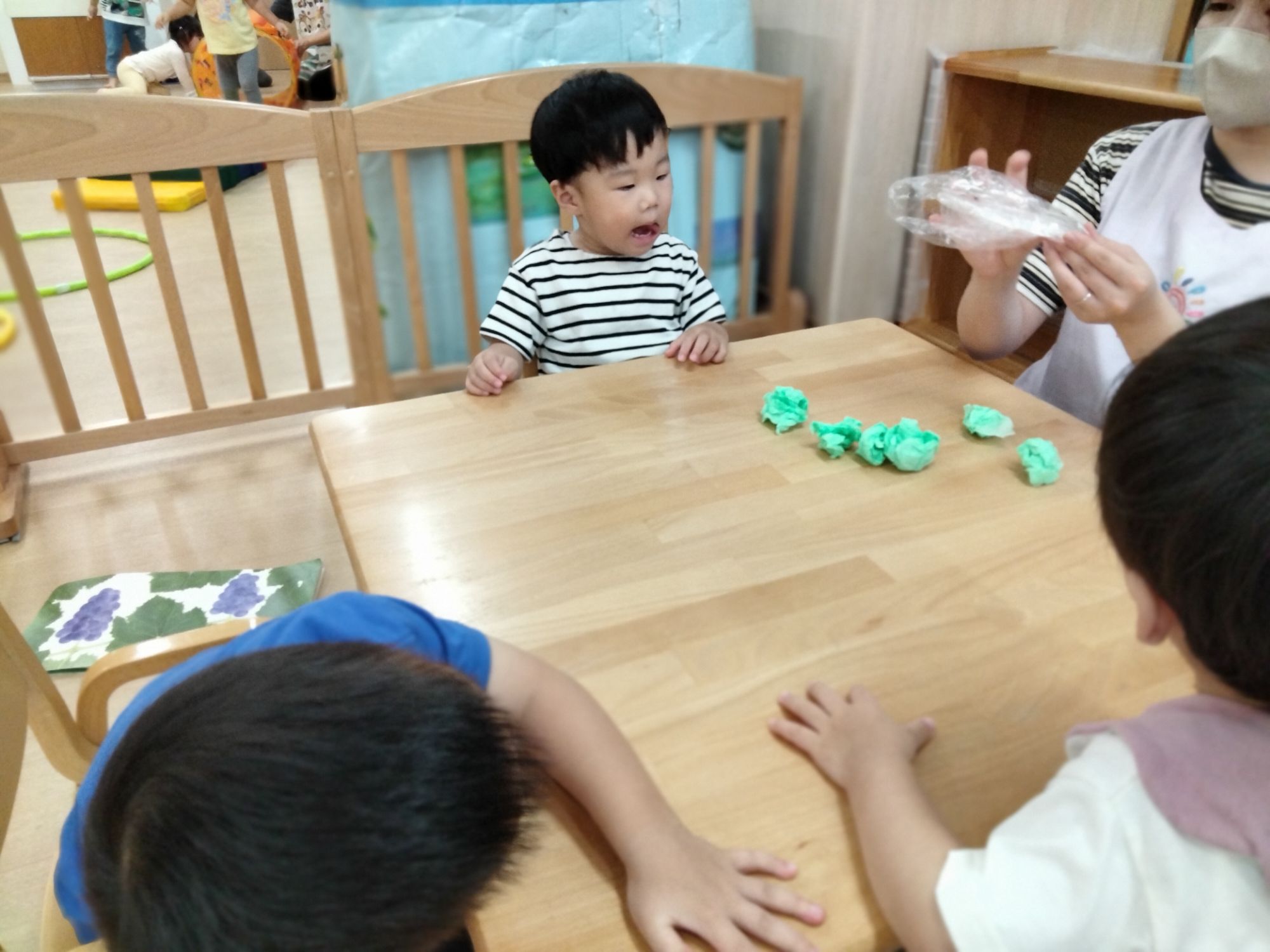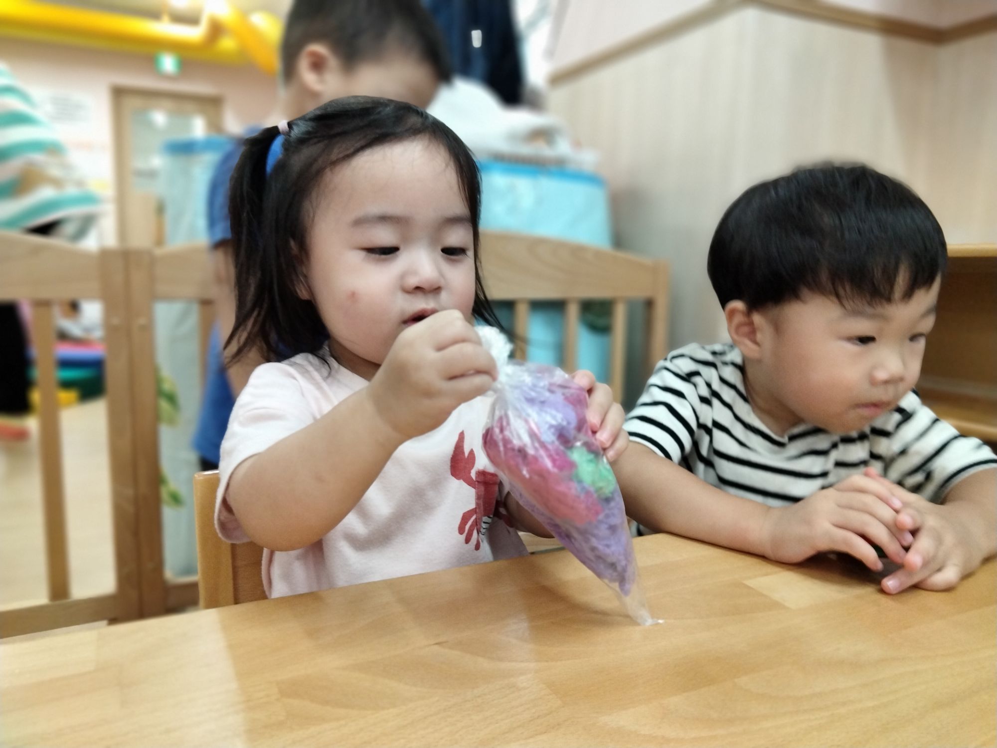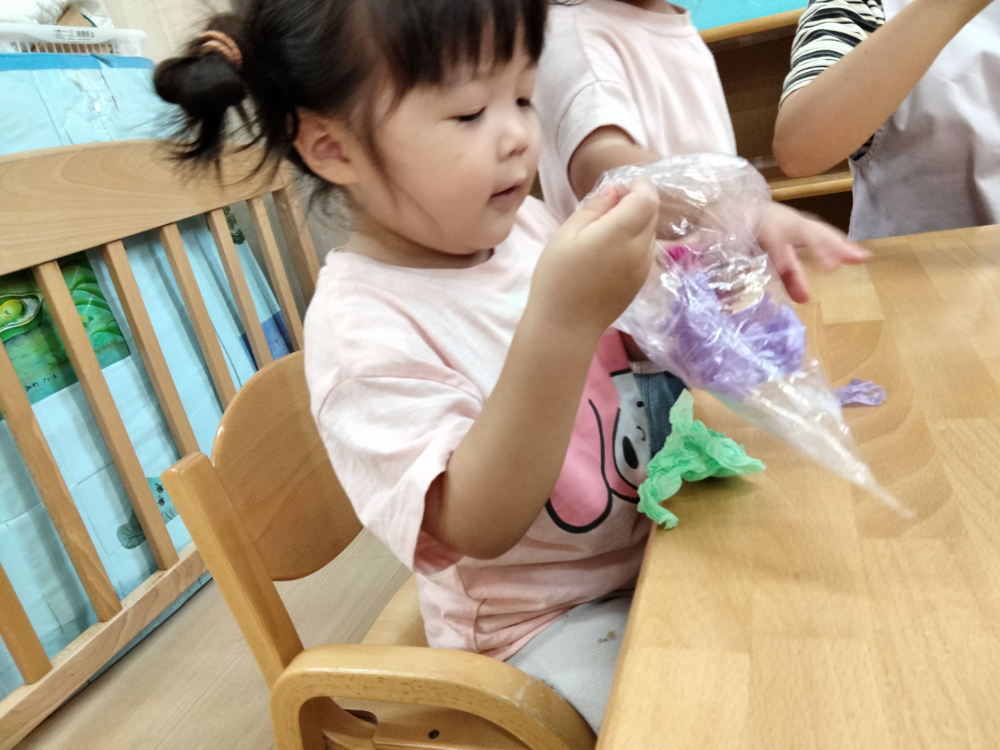 自分で丸めたものを袋に入れる達成感や、色が重なり合ってきれいに見えることを発見する子もいて、それぞれに楽しみながら取り組むことができました!