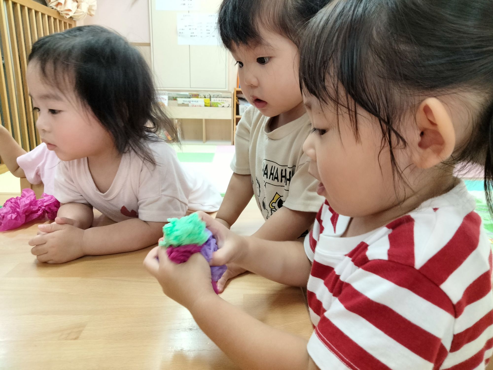 色とりどりのお花紙を手にとって感触を楽しみながらくしゃくしゃと丸めていきます。