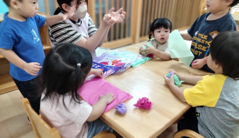 自分で丸めたものを袋に入れる達成感や、色が重なり合ってきれいに見えることを発見する子もいて、それぞれに楽しみながら取り組むことができました!