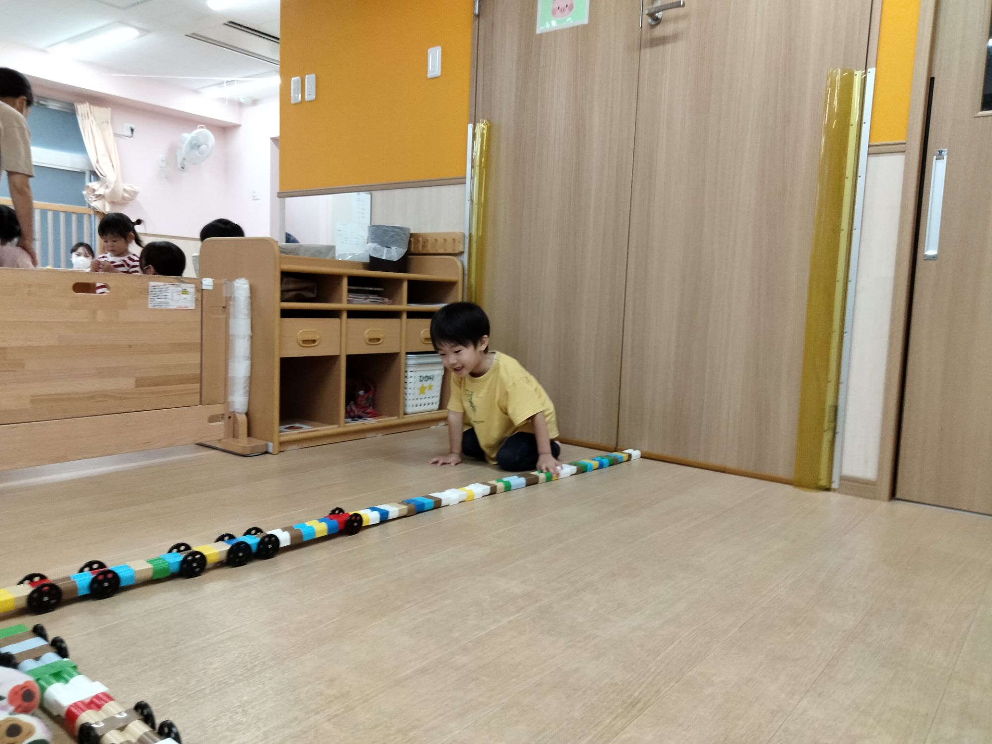 たくさんの数のBブロックを繋げて、長い電車ができてご満悦の様子😁