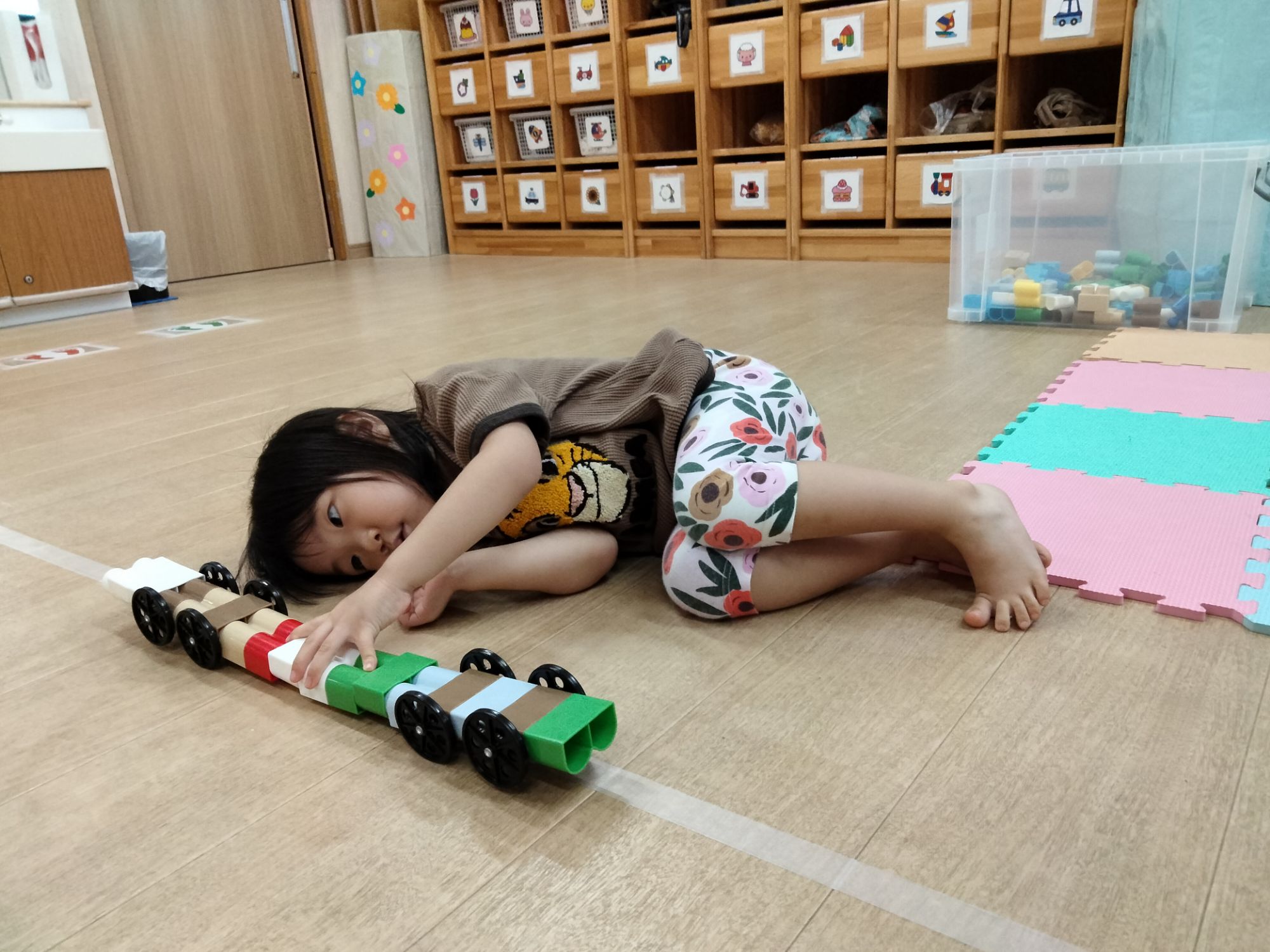 赤のブロックだけを集めて、長く繋げては、「先生、赤のブロックまだあるかなー?」「ながーくなったよー」と😙