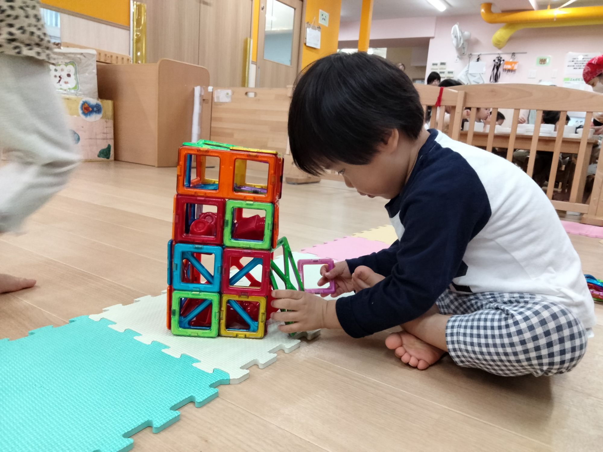 マグフォーマーで2階建てのお家を作っている姿🏘️