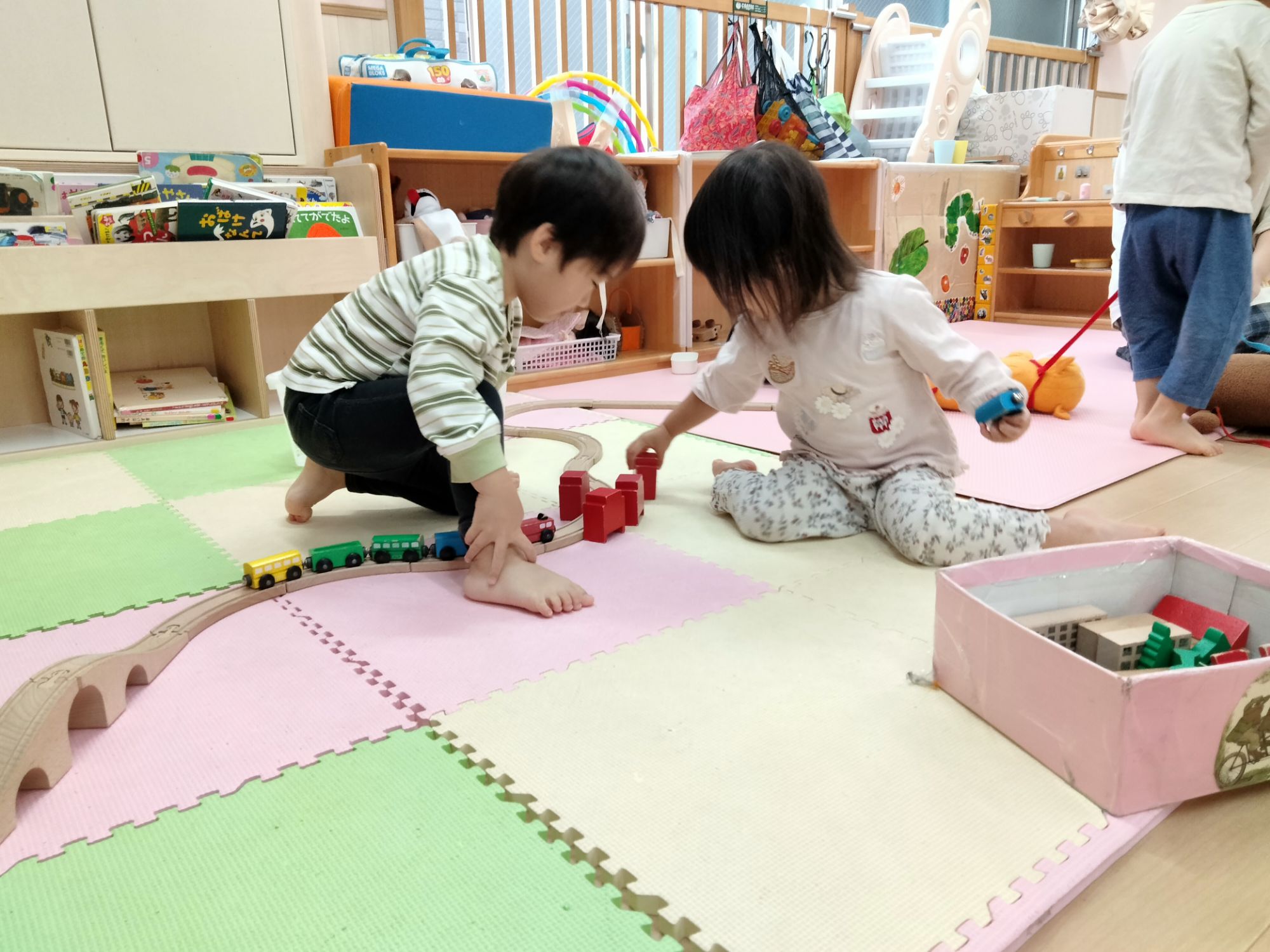 友だちと一緒に線路をながーく繋げて、一緒に電車を走らせて楽しんでいる様子も🚃