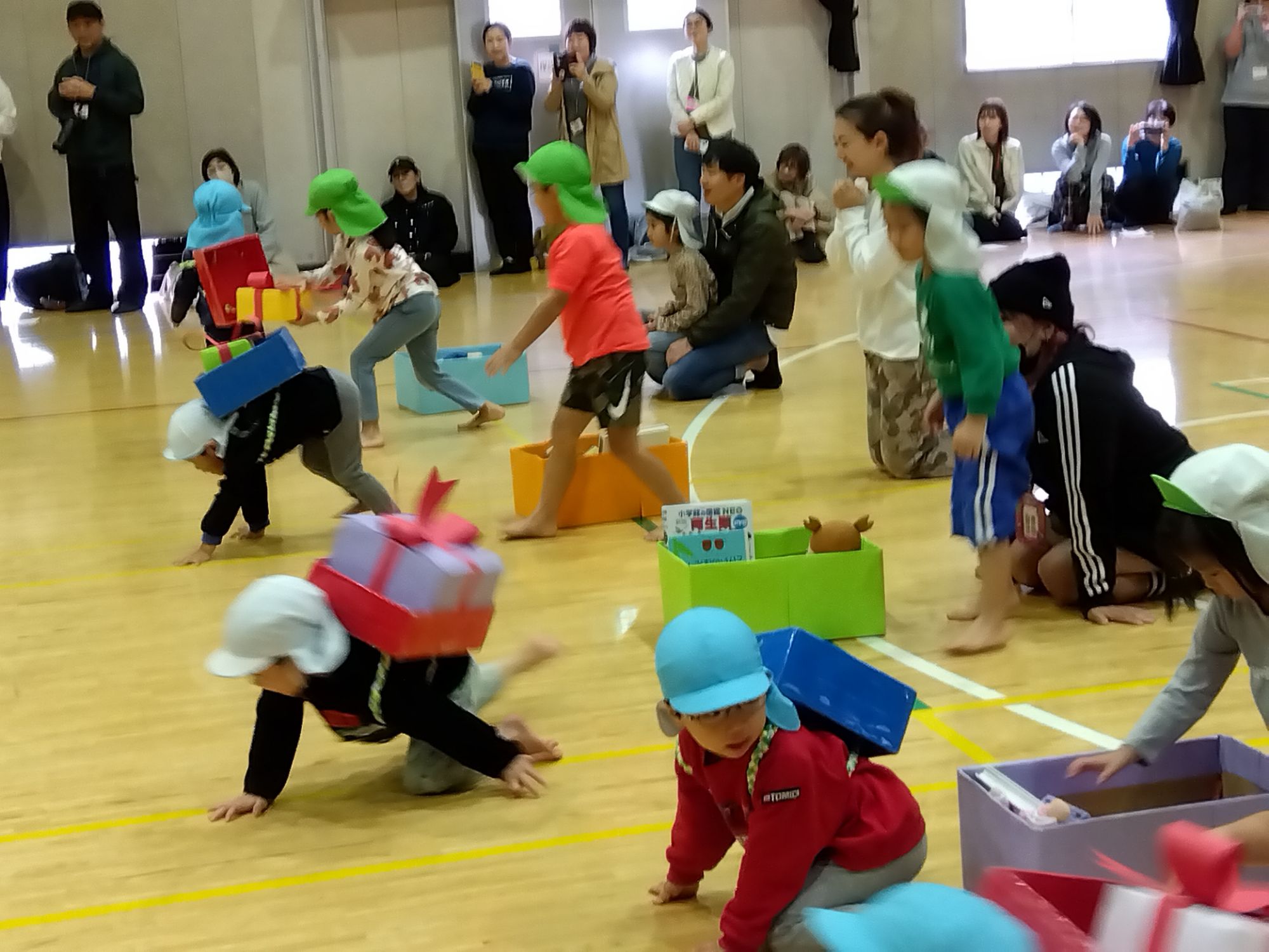 あおぞら組さんは、みらい組さんにお手伝いをしてもらいながら、落とさないようにお荷物を大事に運びます🎁