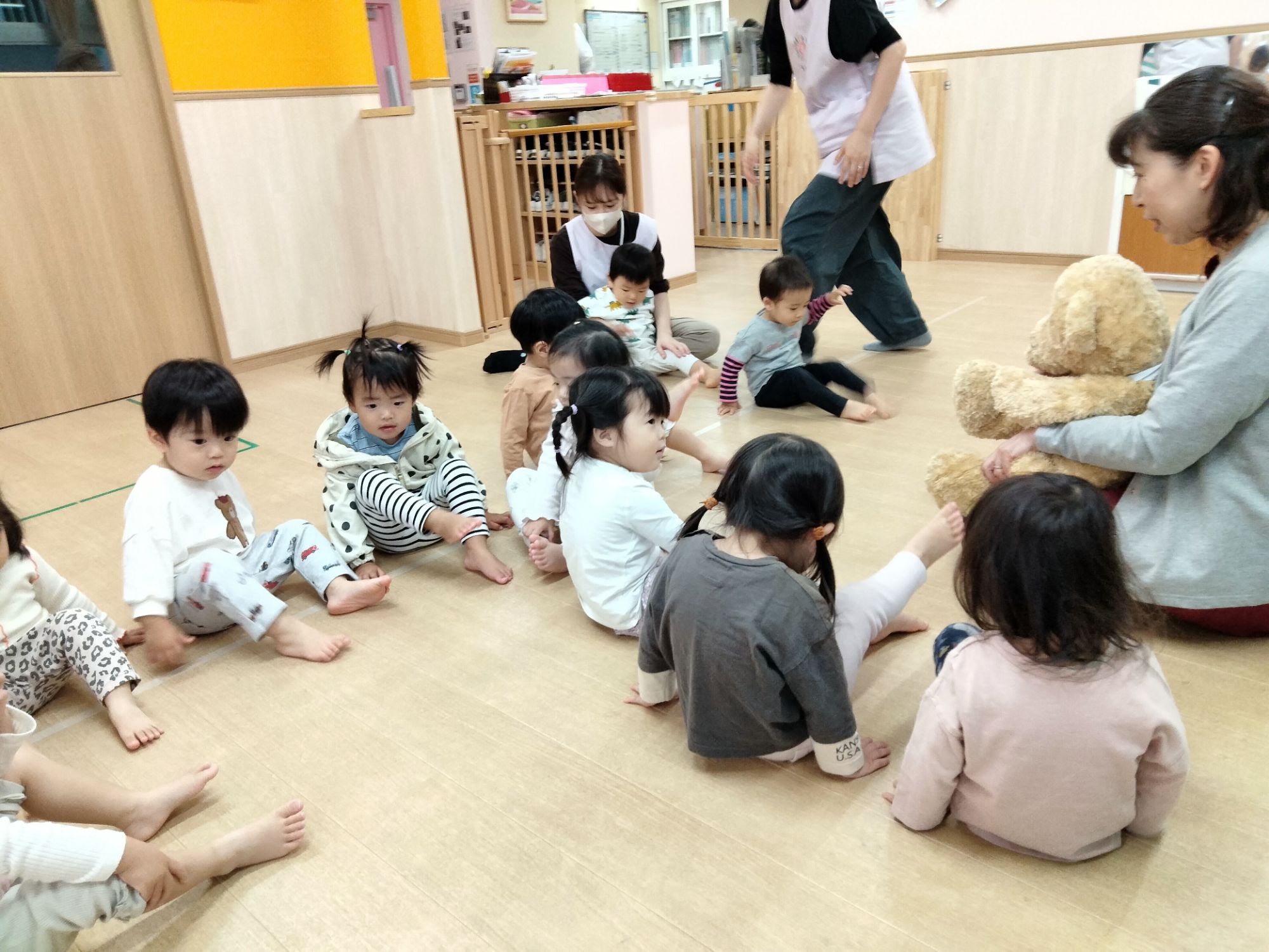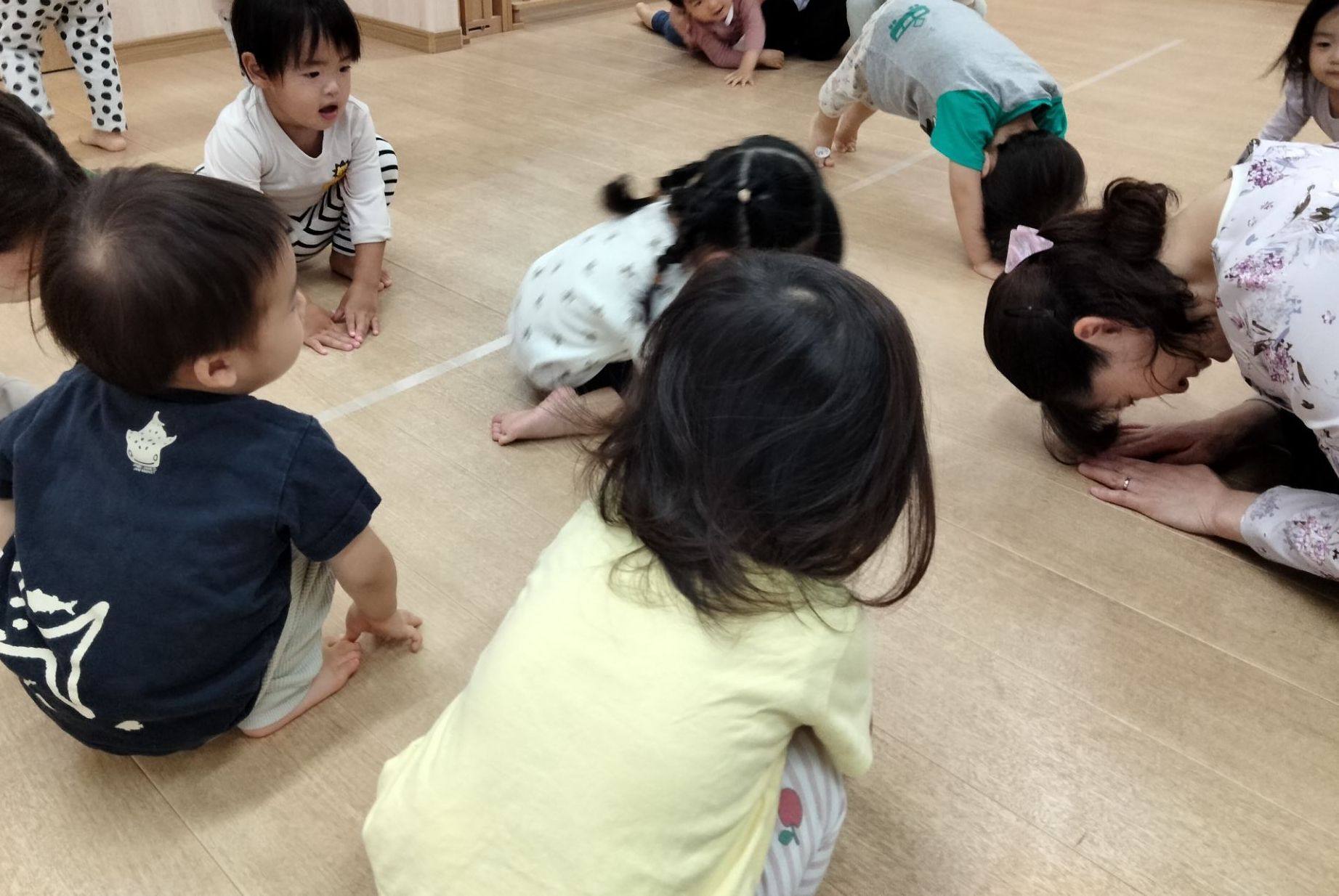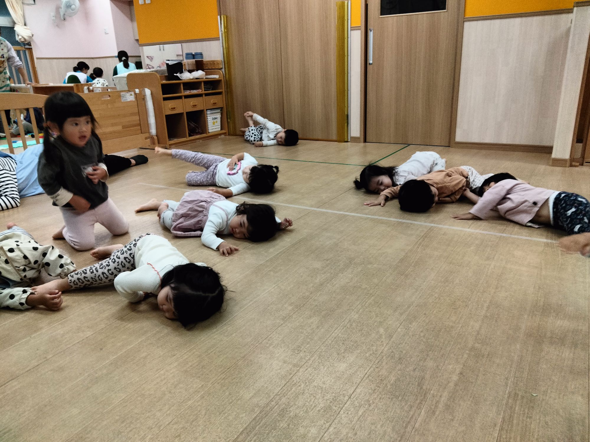 リトミックが始まると先生の前に行ったり、白い線の上に集まるひかり組の子ども達✨️