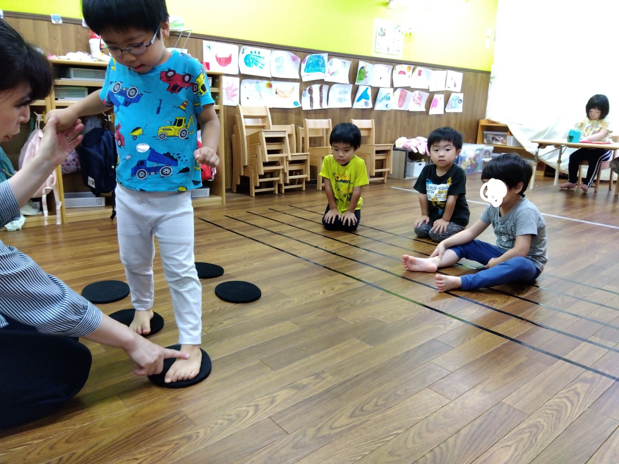 音符の上に乗ってリズムよく歩きます。最後の音符でストップ!…リズムをピタッと止めるって難しい…💦