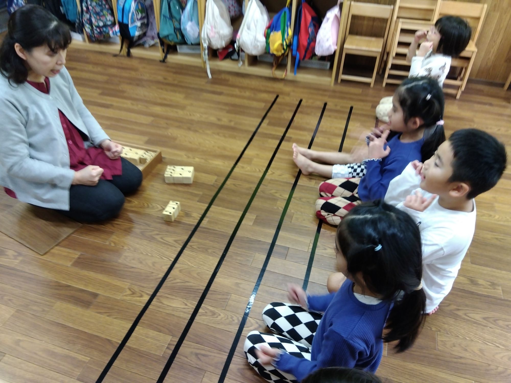 音符の積み木を見てリズム打ち。音符と長さが理解していないとできないのですが、上手にできています。