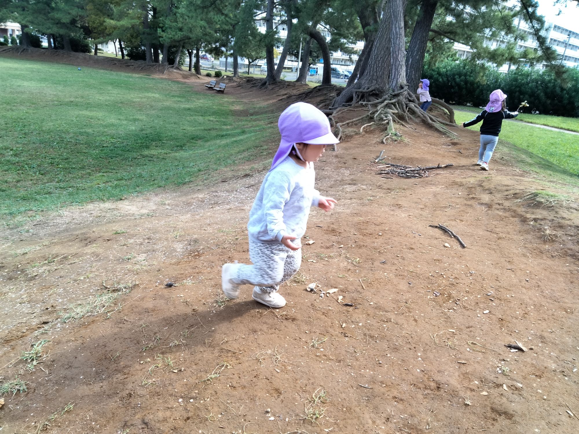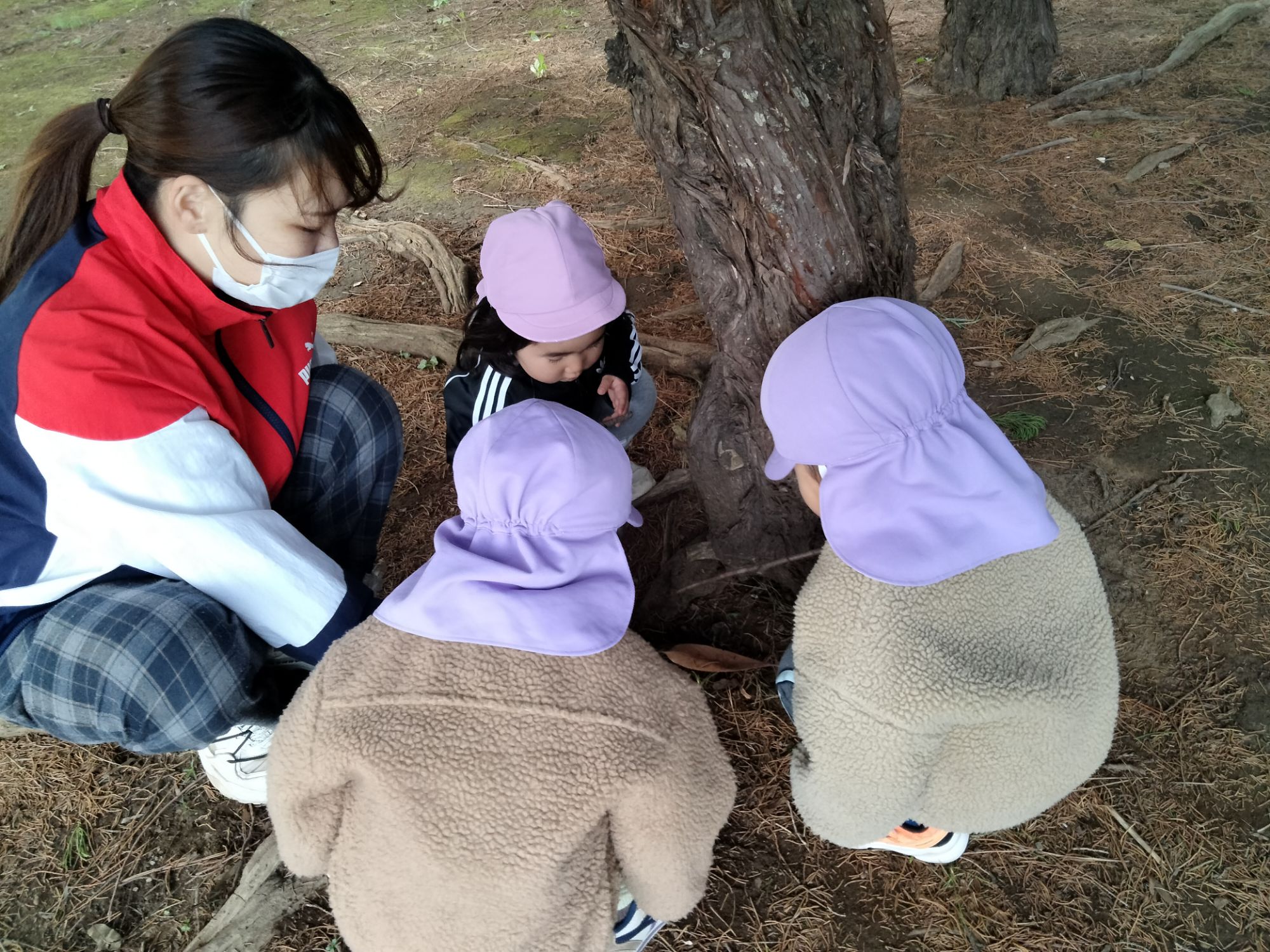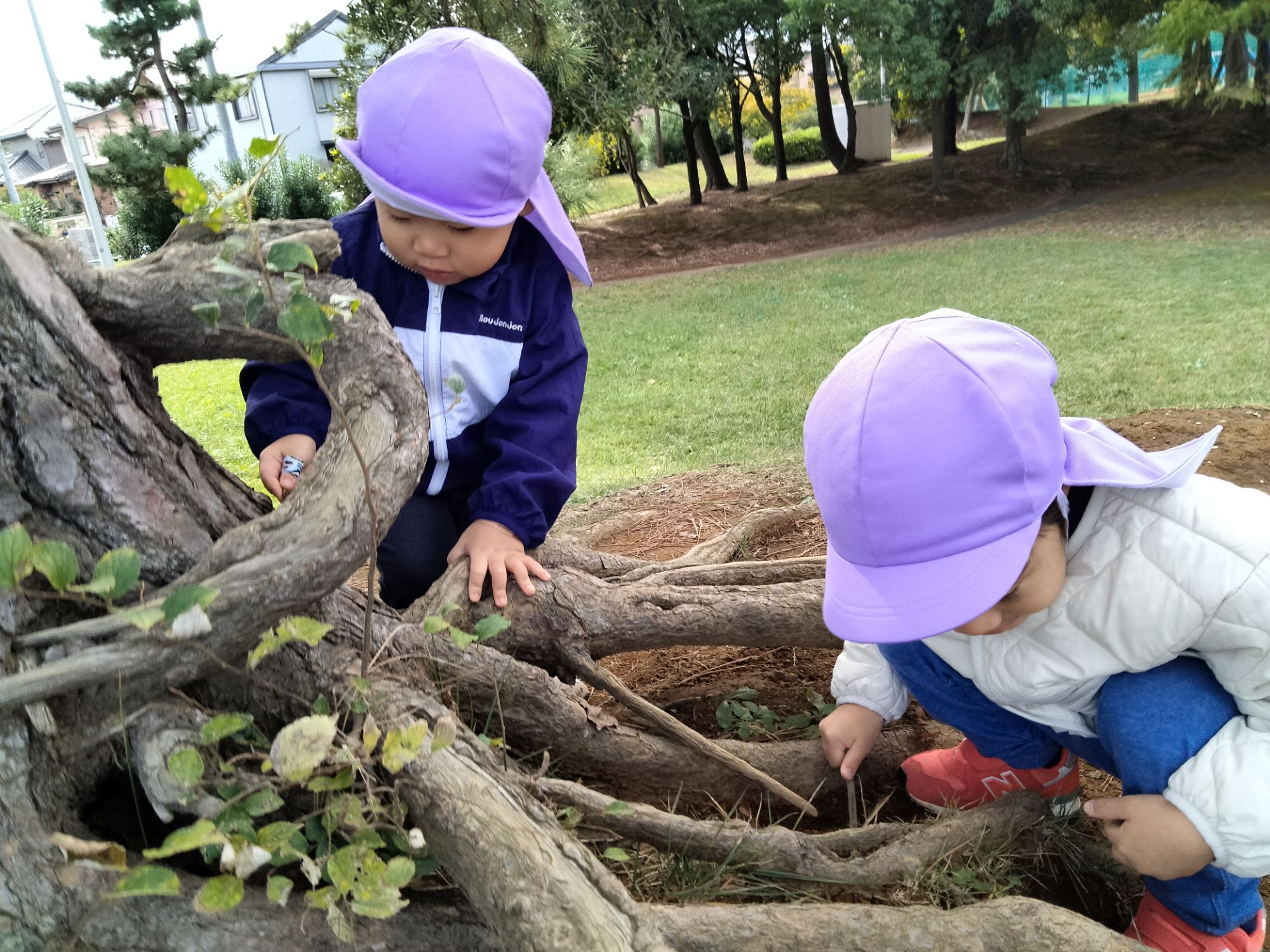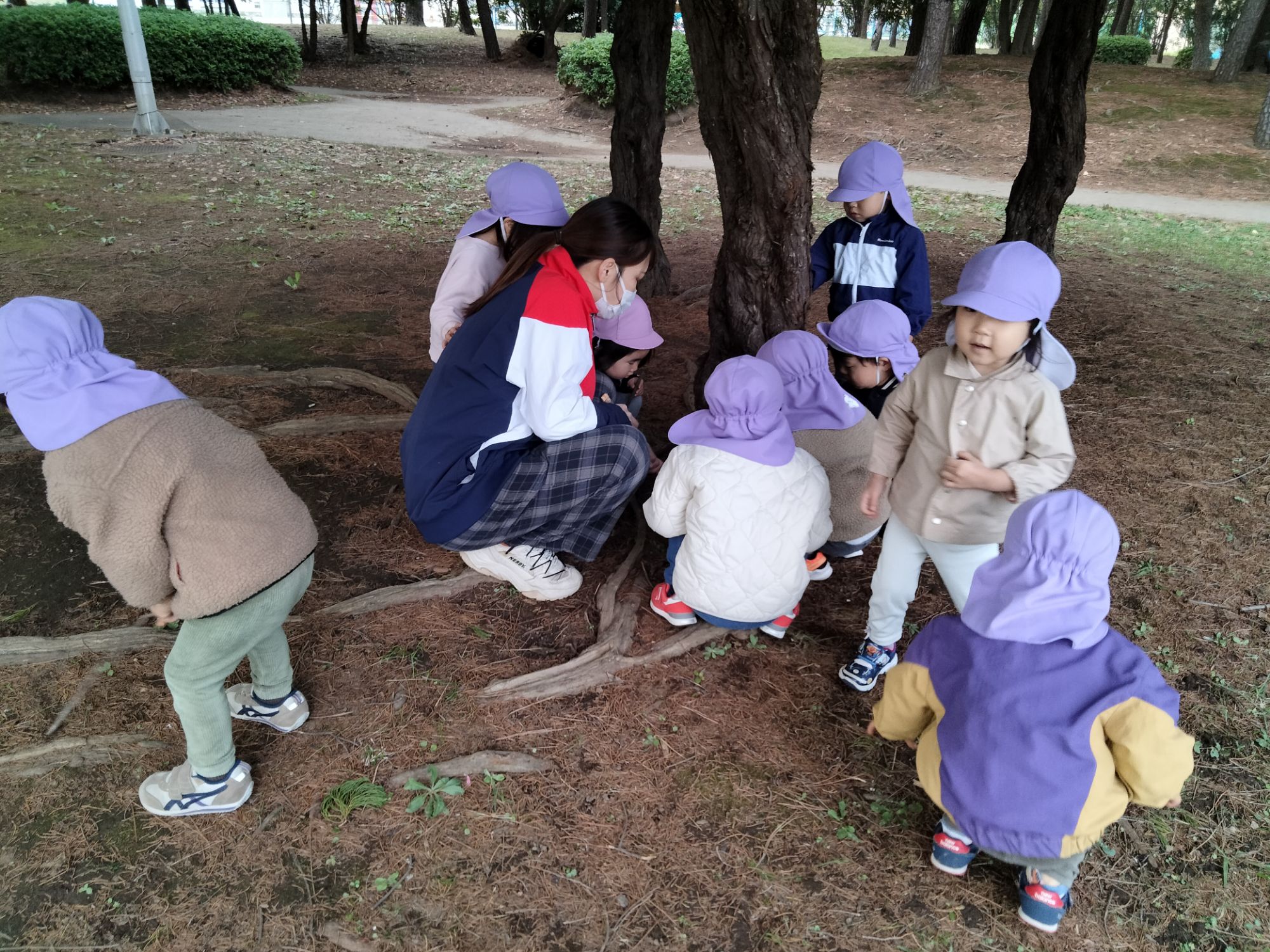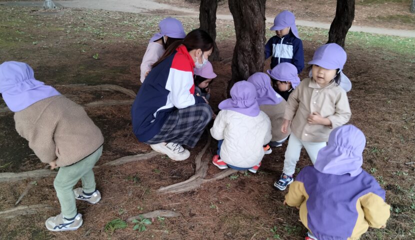 木の根元に、ダンゴムシや虫はいないか?覗いていました👀✨️「かくれんぼしてるかな〜?」「いないねー」と言って探していましたよ!