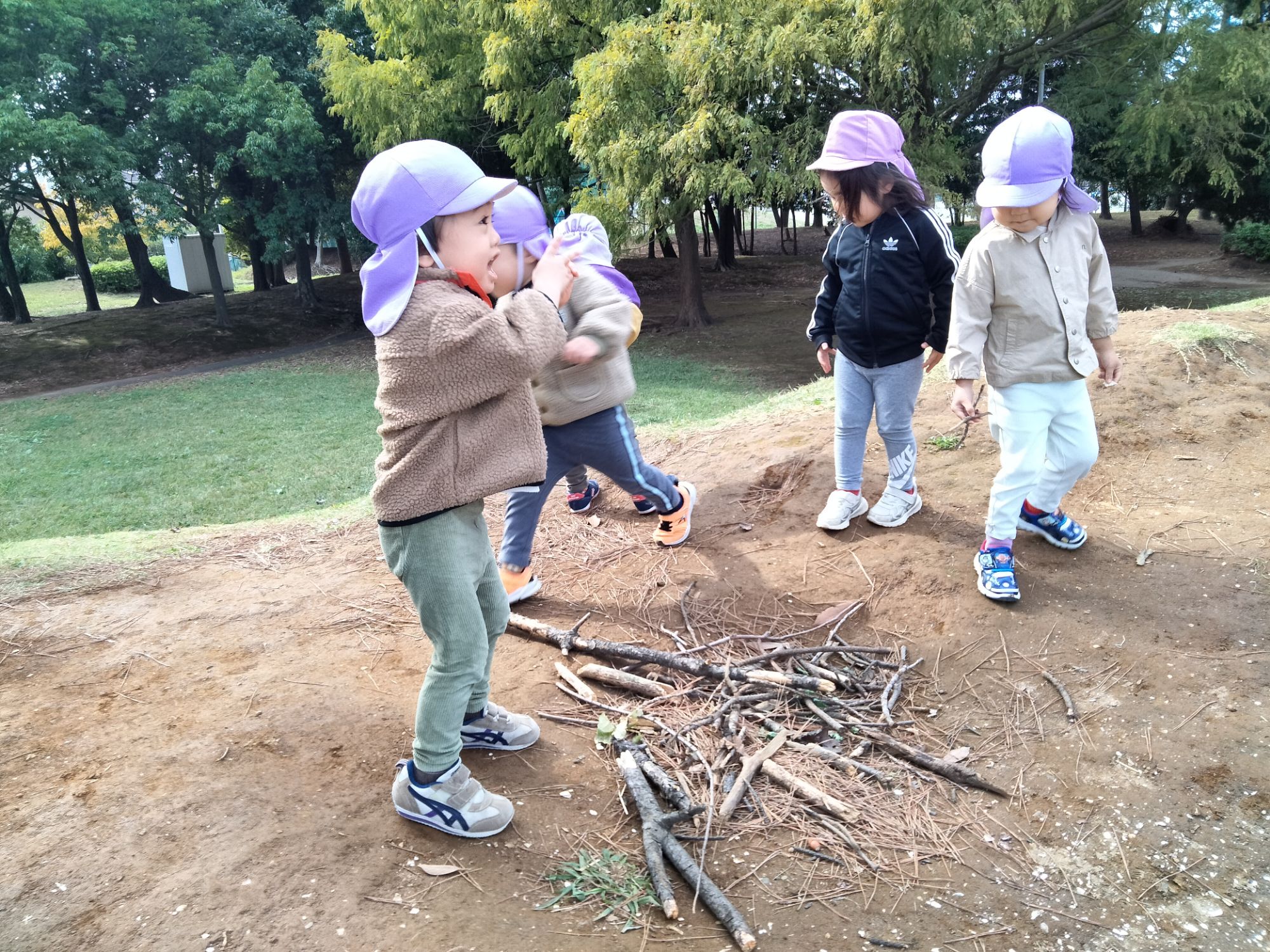 木の根元に埋めてあげるために、木の枝で穴を掘りました💨「これくらいかな?」「もう少し掘った方がいいかな?」とお話しながら、掘っていましたよ😊埋めた後は、ふかふかのお布団を…と落ち葉を上に乗せる姿が見られましたよ!