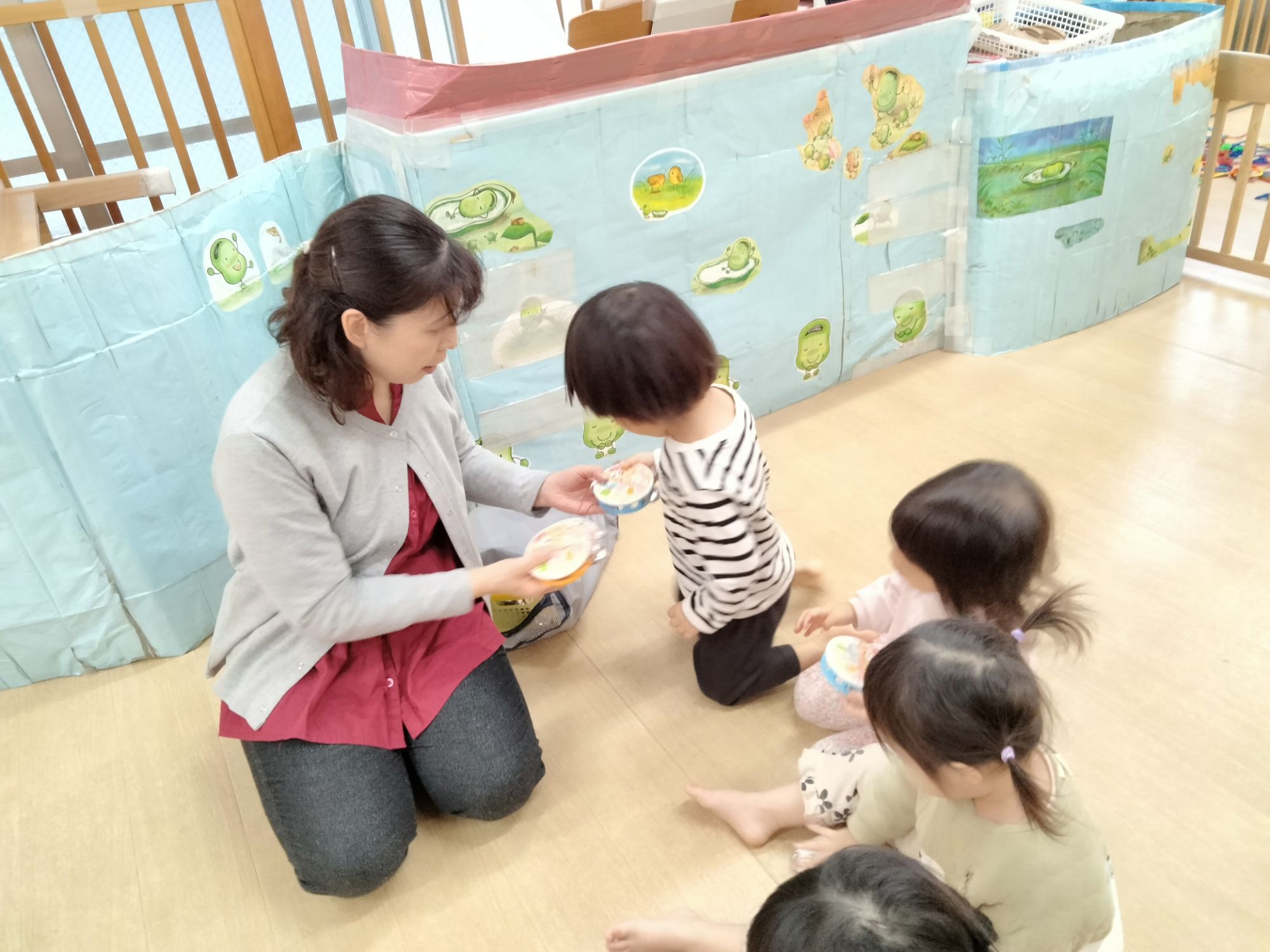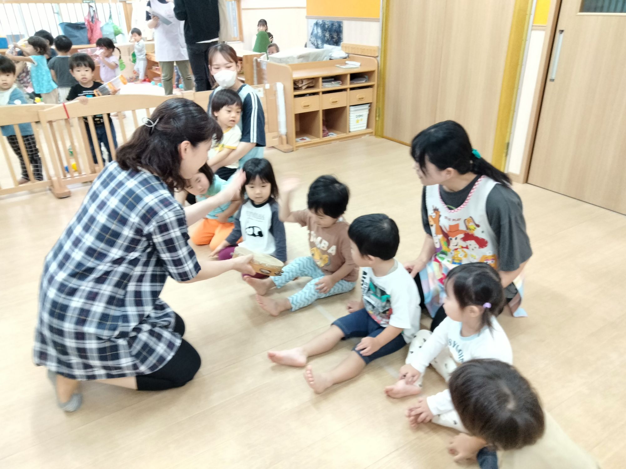 今度は、、好きな色のタンバリンを選び、一人ひとつずつ手に持って演奏しました!