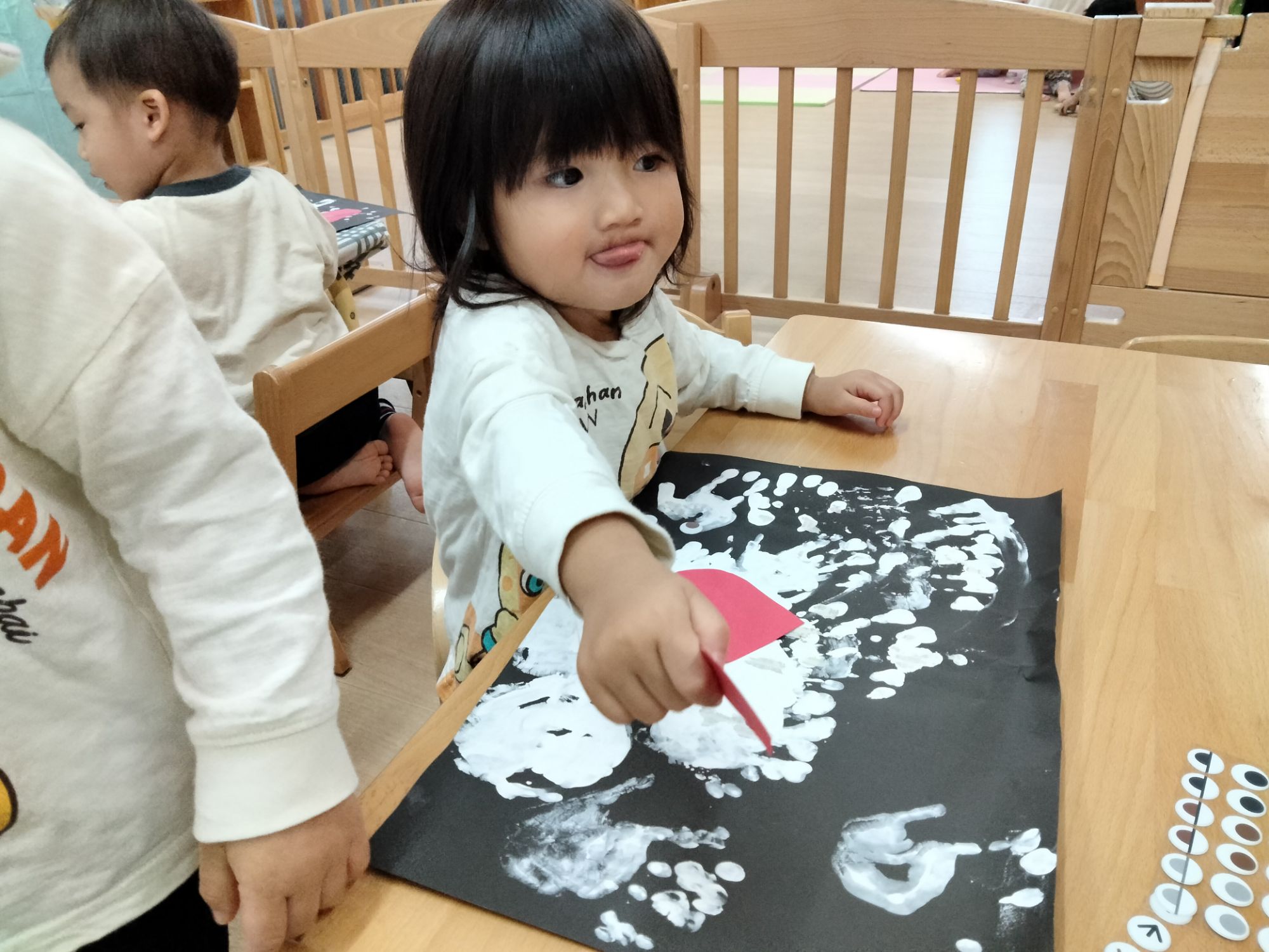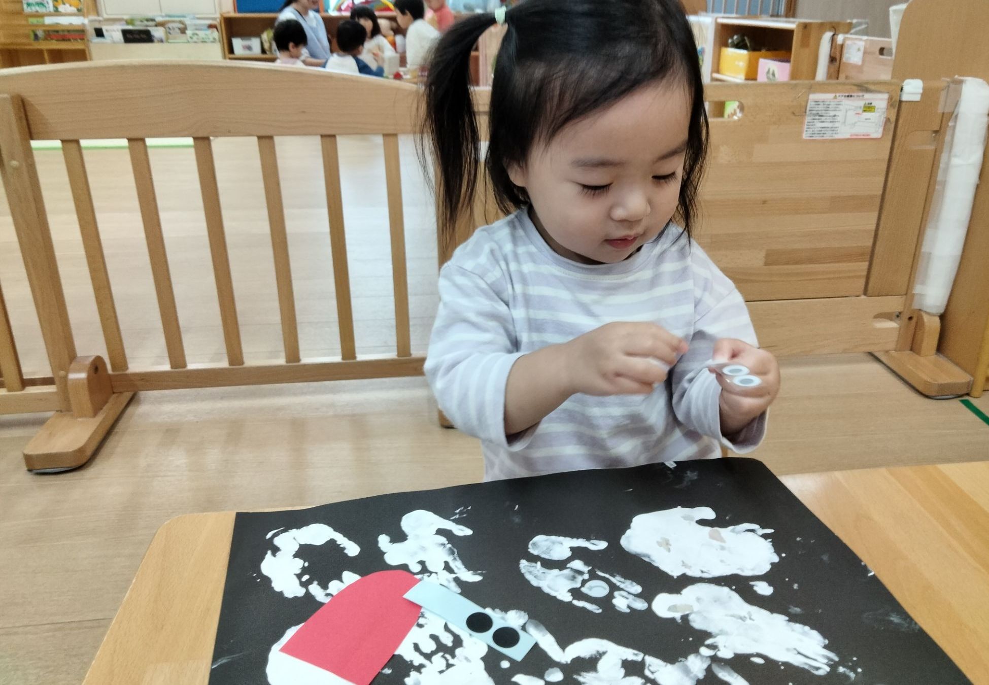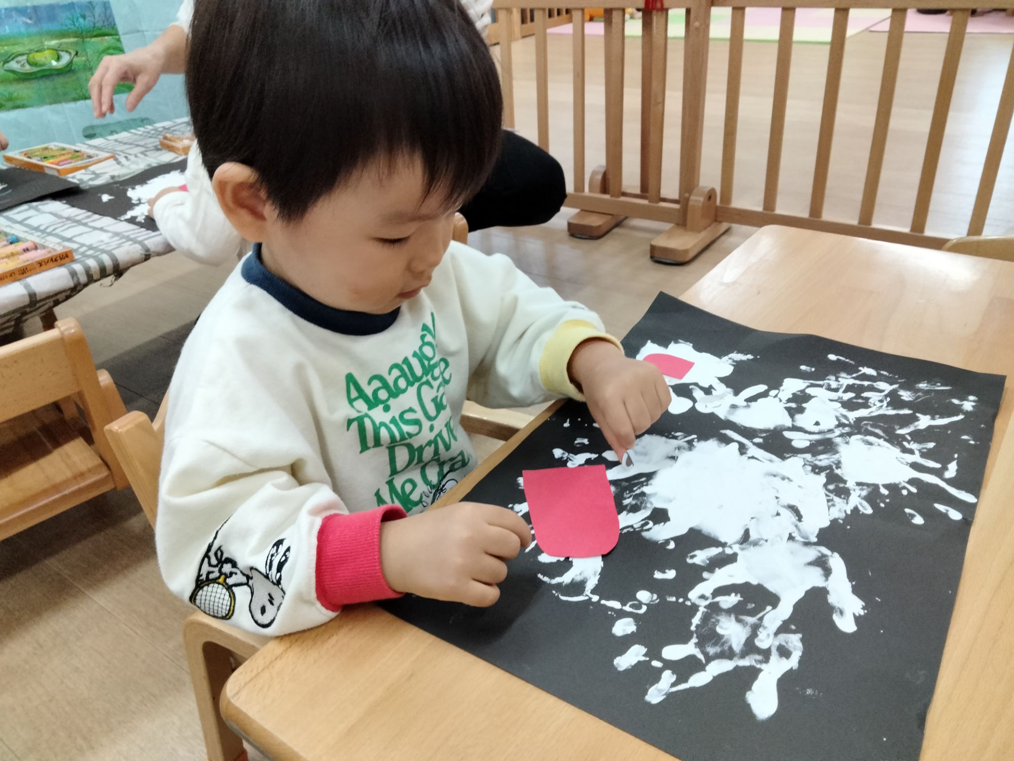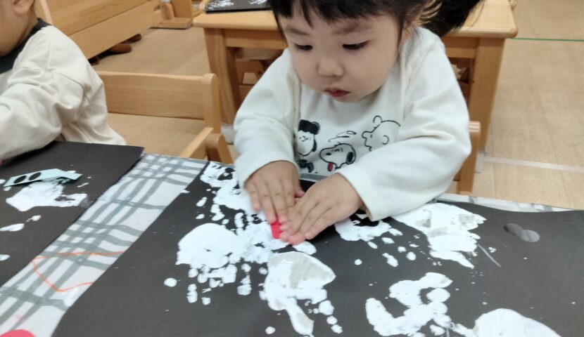 手先を使って貼ったり描いたりする中で、指先の動きや、集中力が育まれていきます。また、自分の思いを形にする喜びを感じながら、表現する楽しさも味わっていました🧐