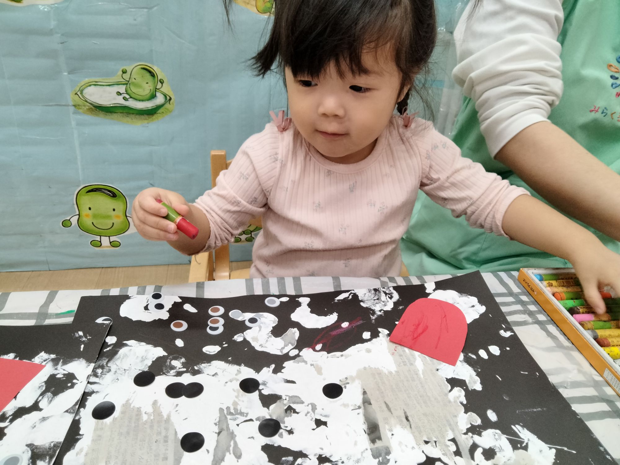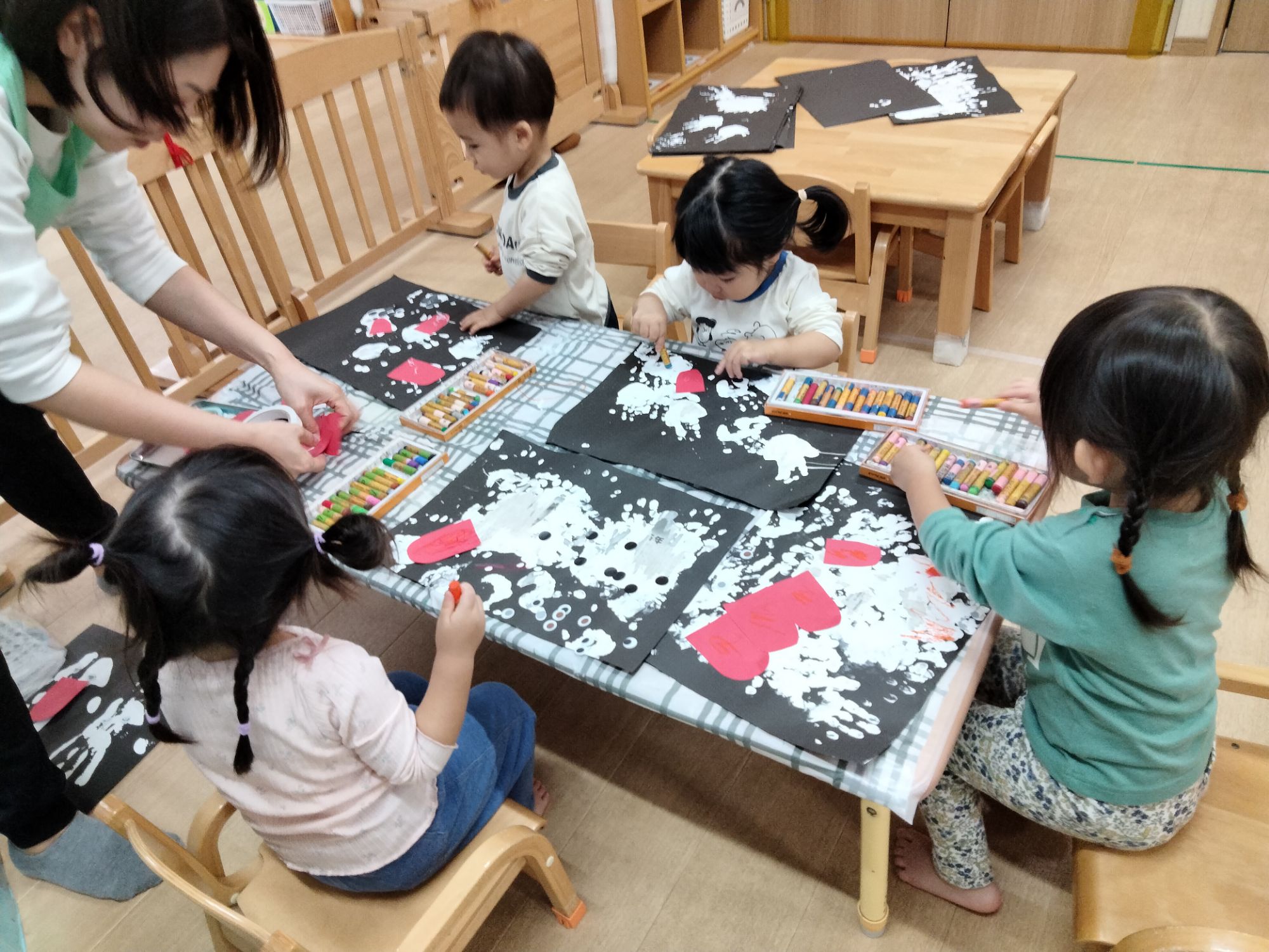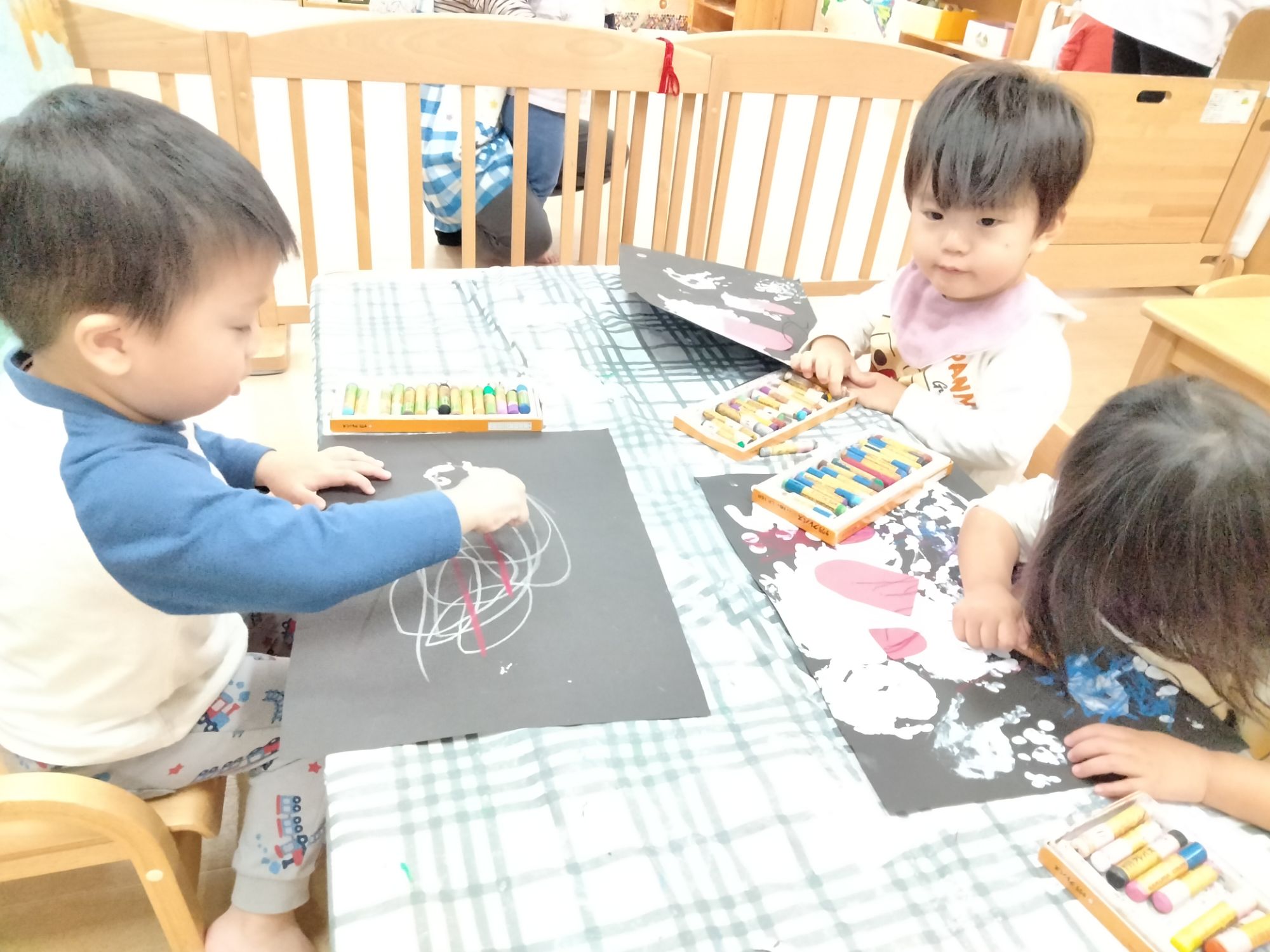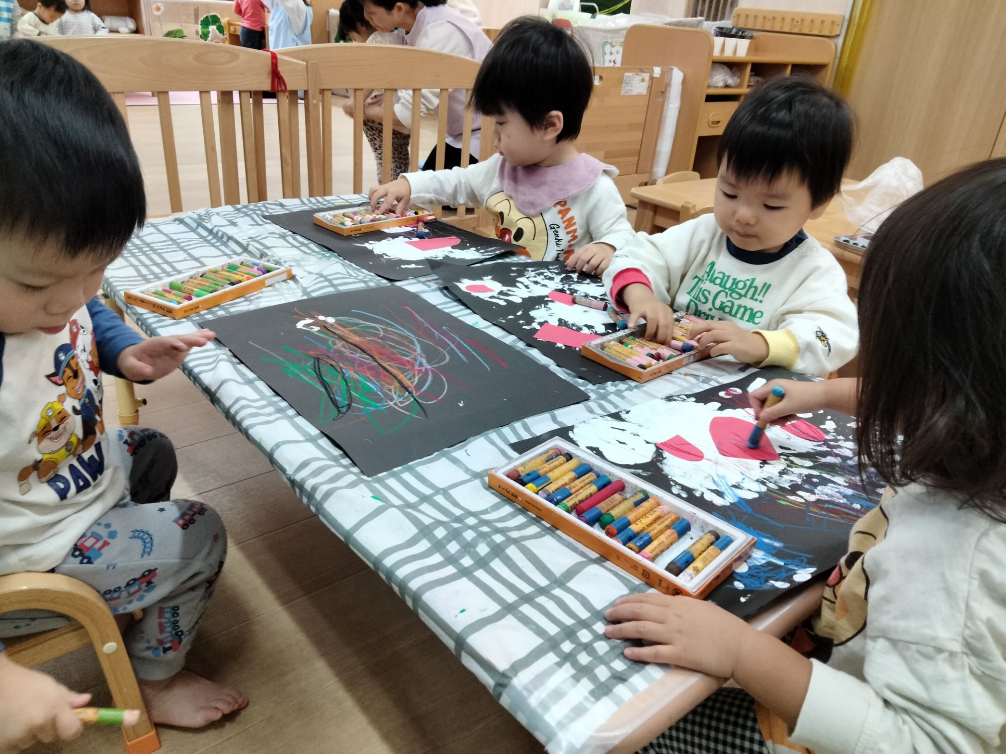 中には、絵の具の感触に少しドキドキしてぺったんはしなかったお友だちもいましたが、無理せずにクレヨンでお絵かきを楽しみました🤗