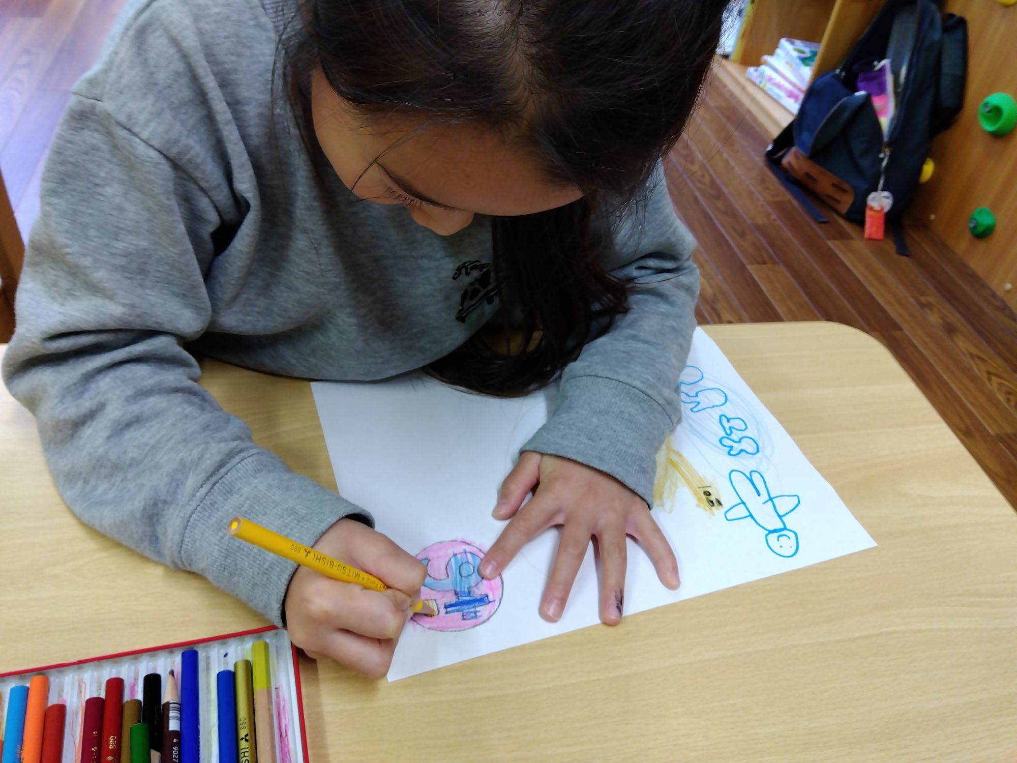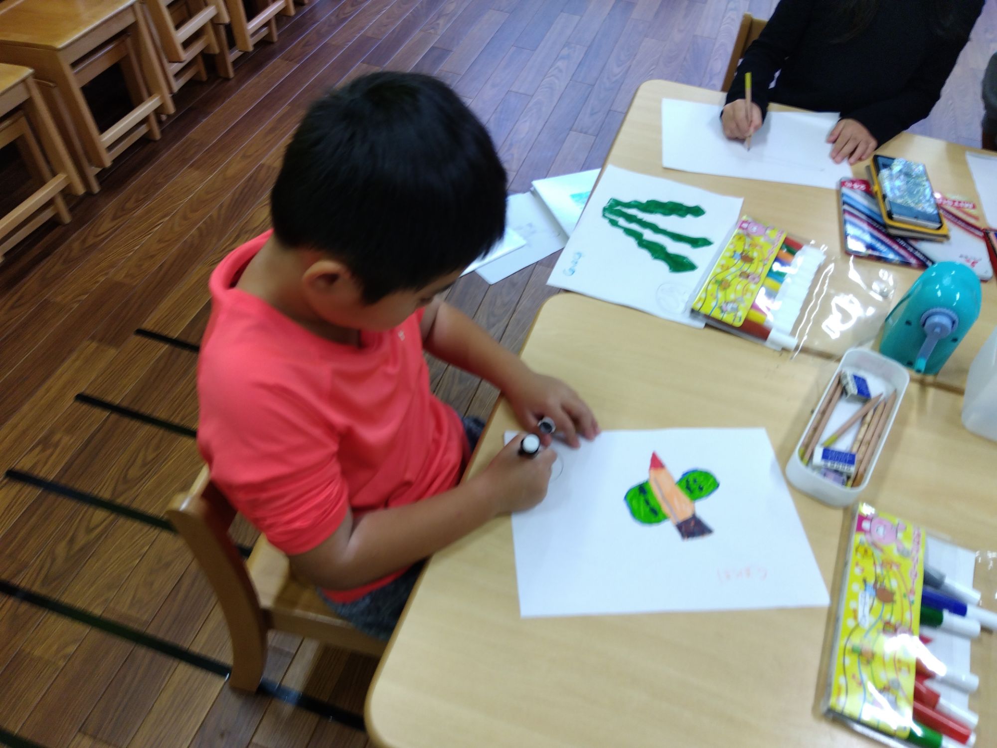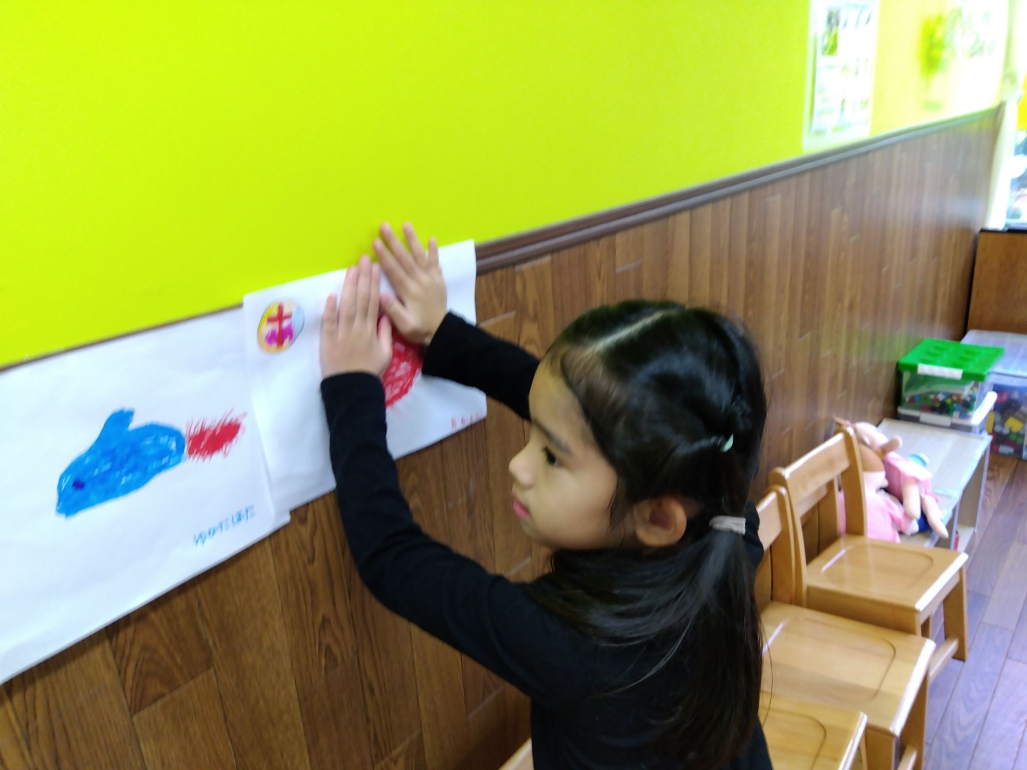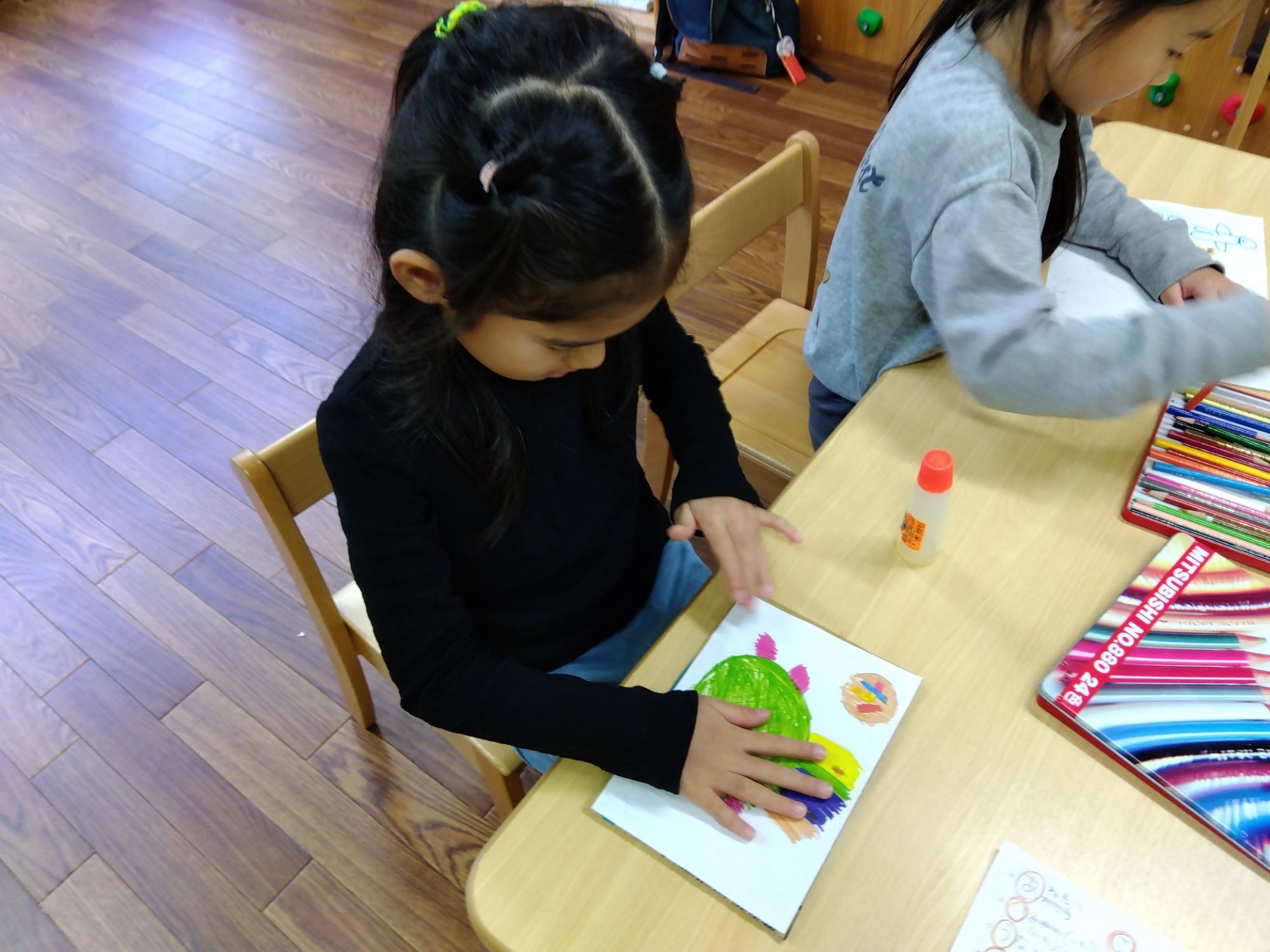 自分たちで描いた絵を台紙にのりで剥がれないように、ピッタリと貼ります。