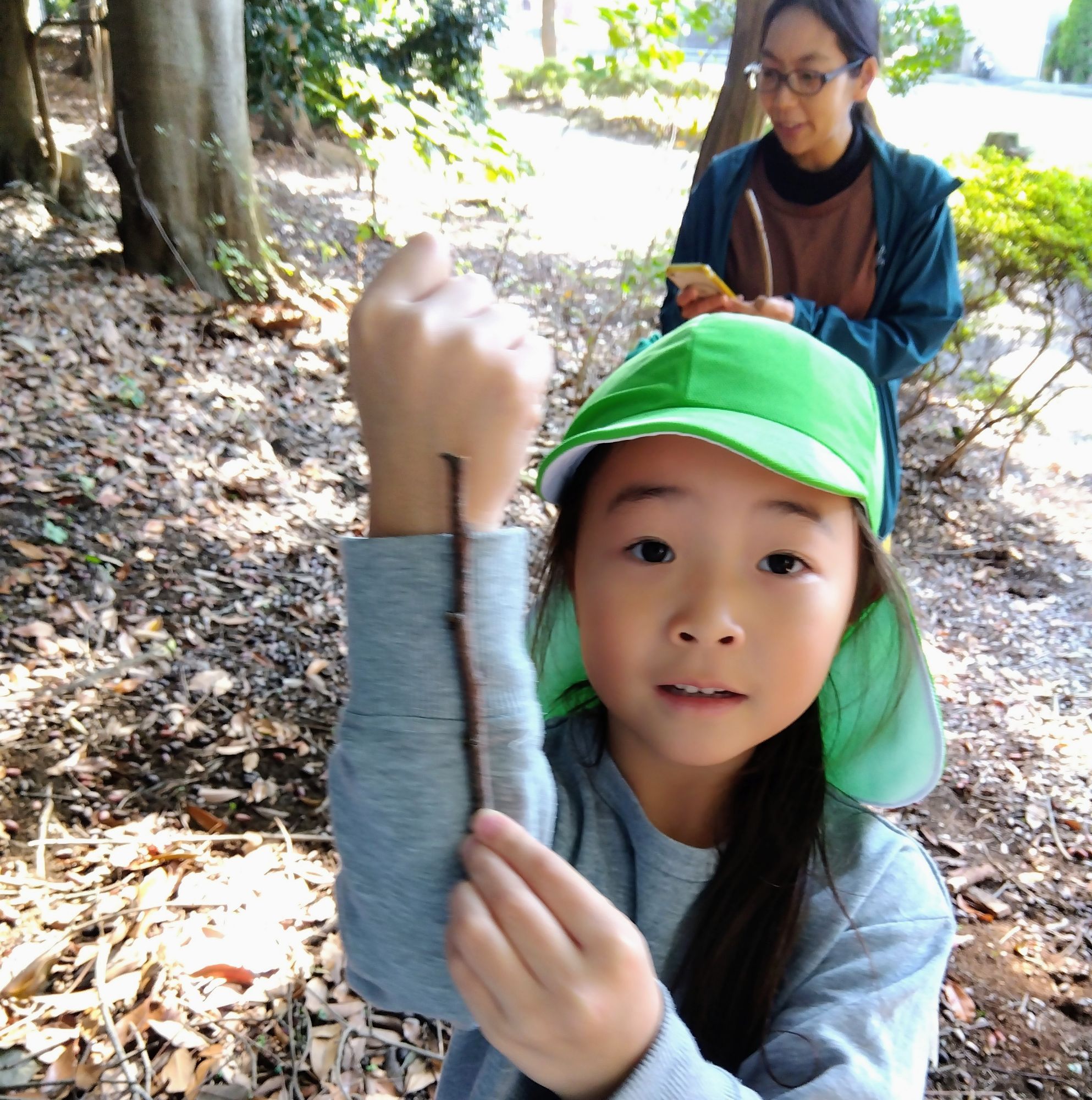 魚釣りの竿になる木の棒を緑地帯に探しに来ました。自分の腕の長さとくらべっこして、木の長さを測ります📏