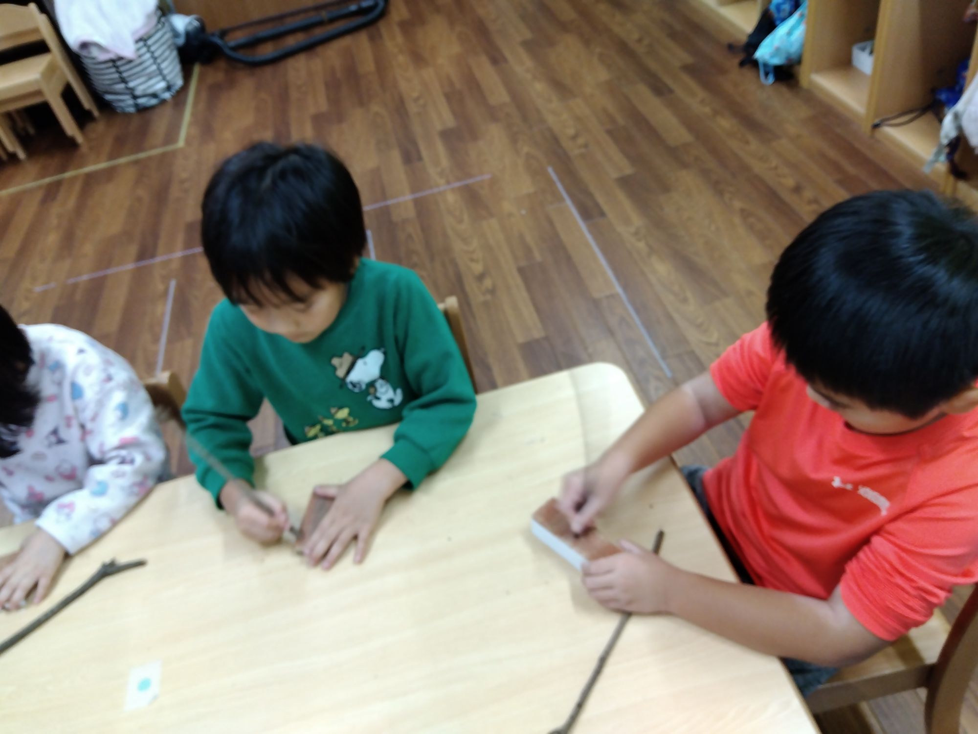 拾って来た木の棒をヤスリをかけて滑らかに。真剣なお顔🤨