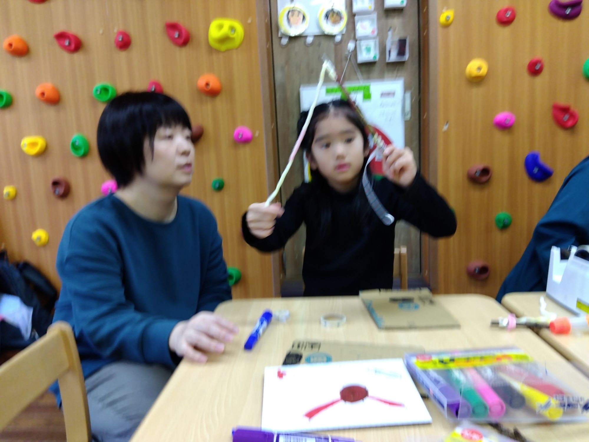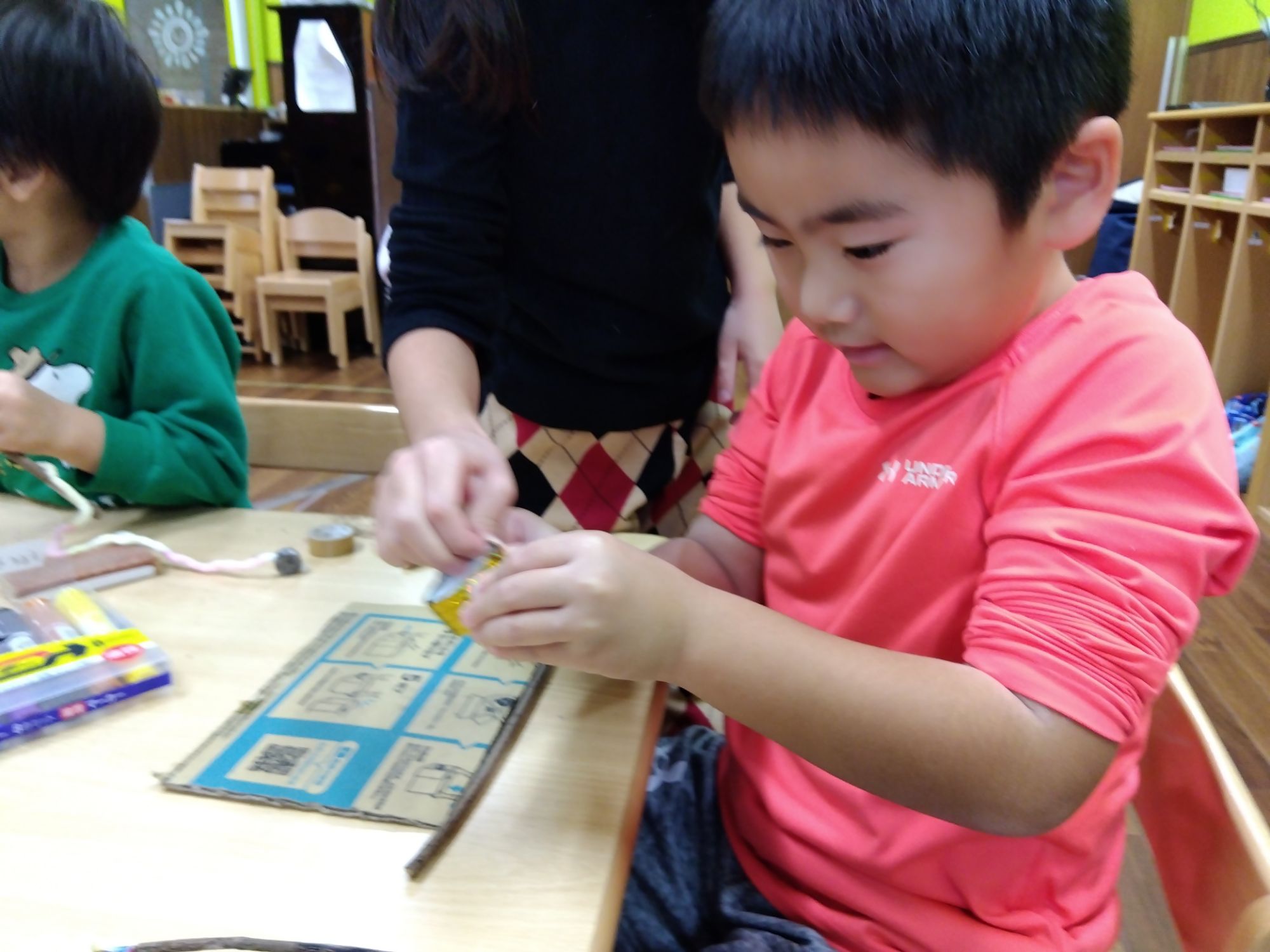 紐や磁石を工夫して貼ります。どうしたら釣りやすいのかなぁ…考えて付ける!さすがみらい組さんです。