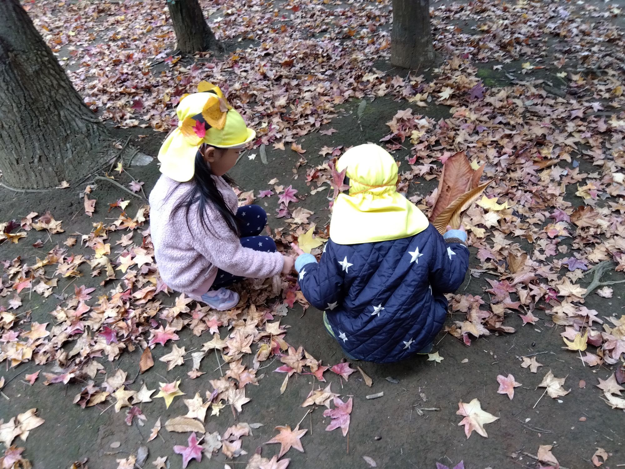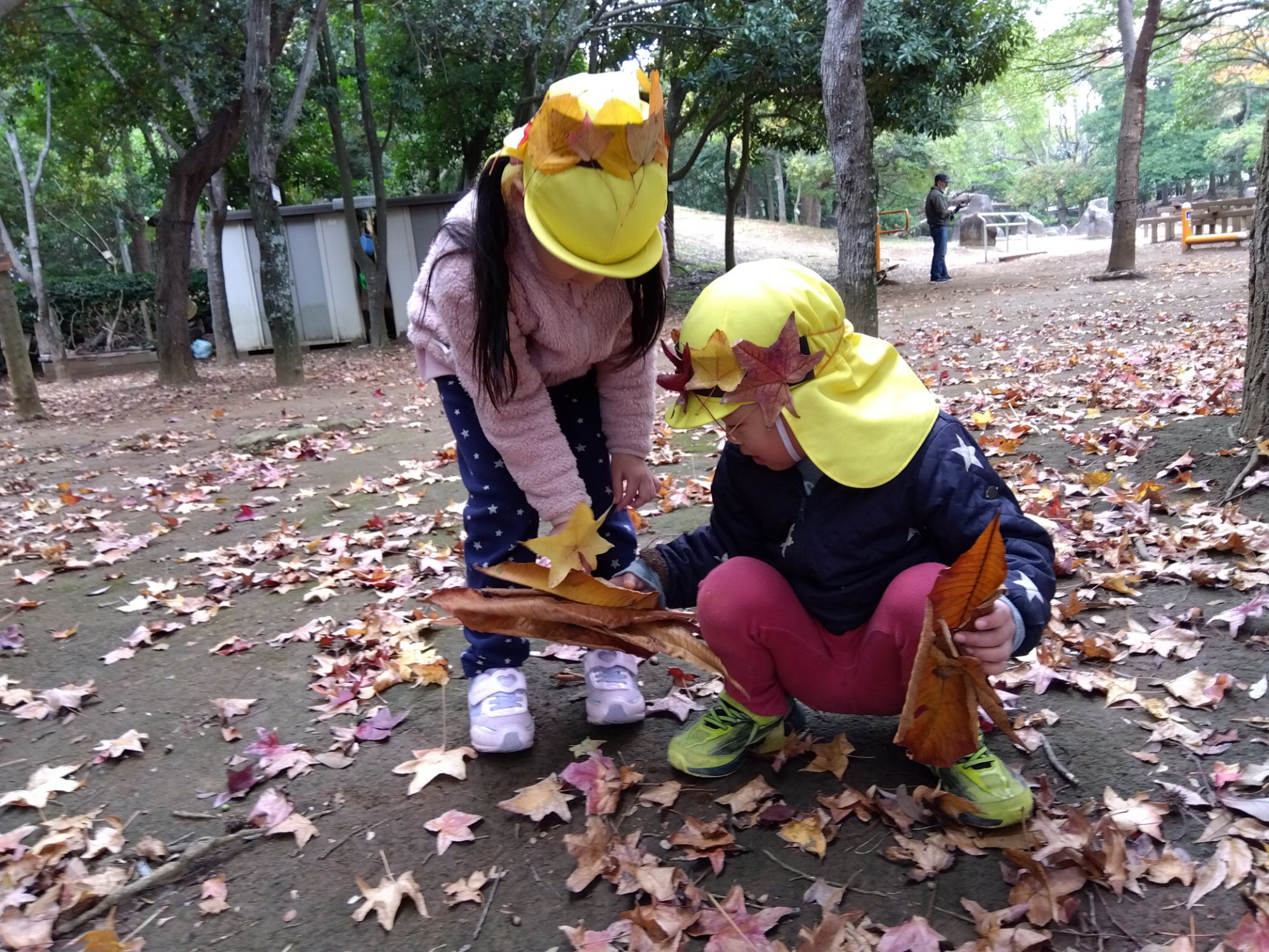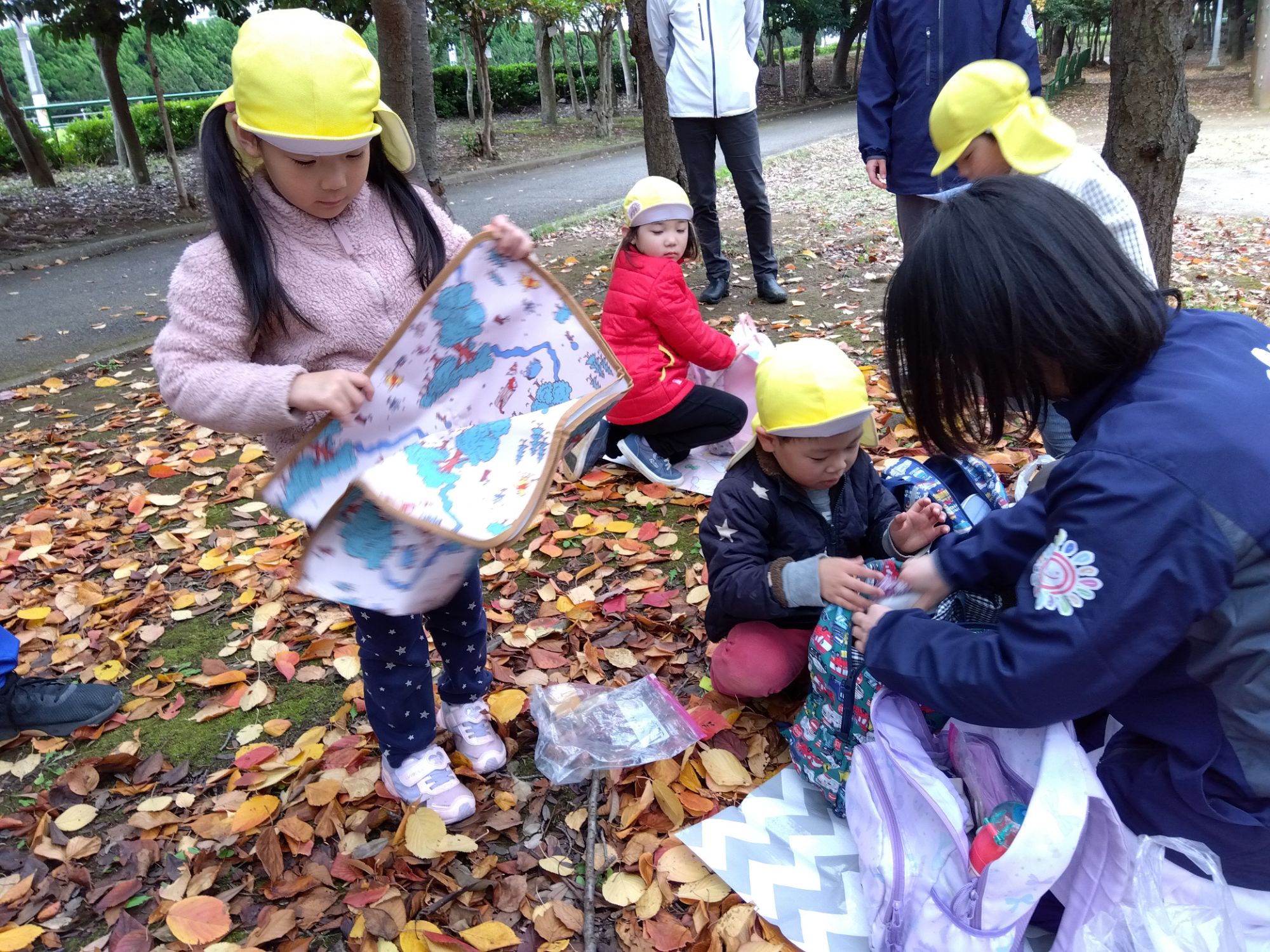 様々な葉っぱを見つけては、目で見たまま…思ったこと、気がついた事を言葉にして表現!秋の自然にたっぷり触れながら、お友達や先生達との言葉での伝え合いも楽しむ事が出来ました!