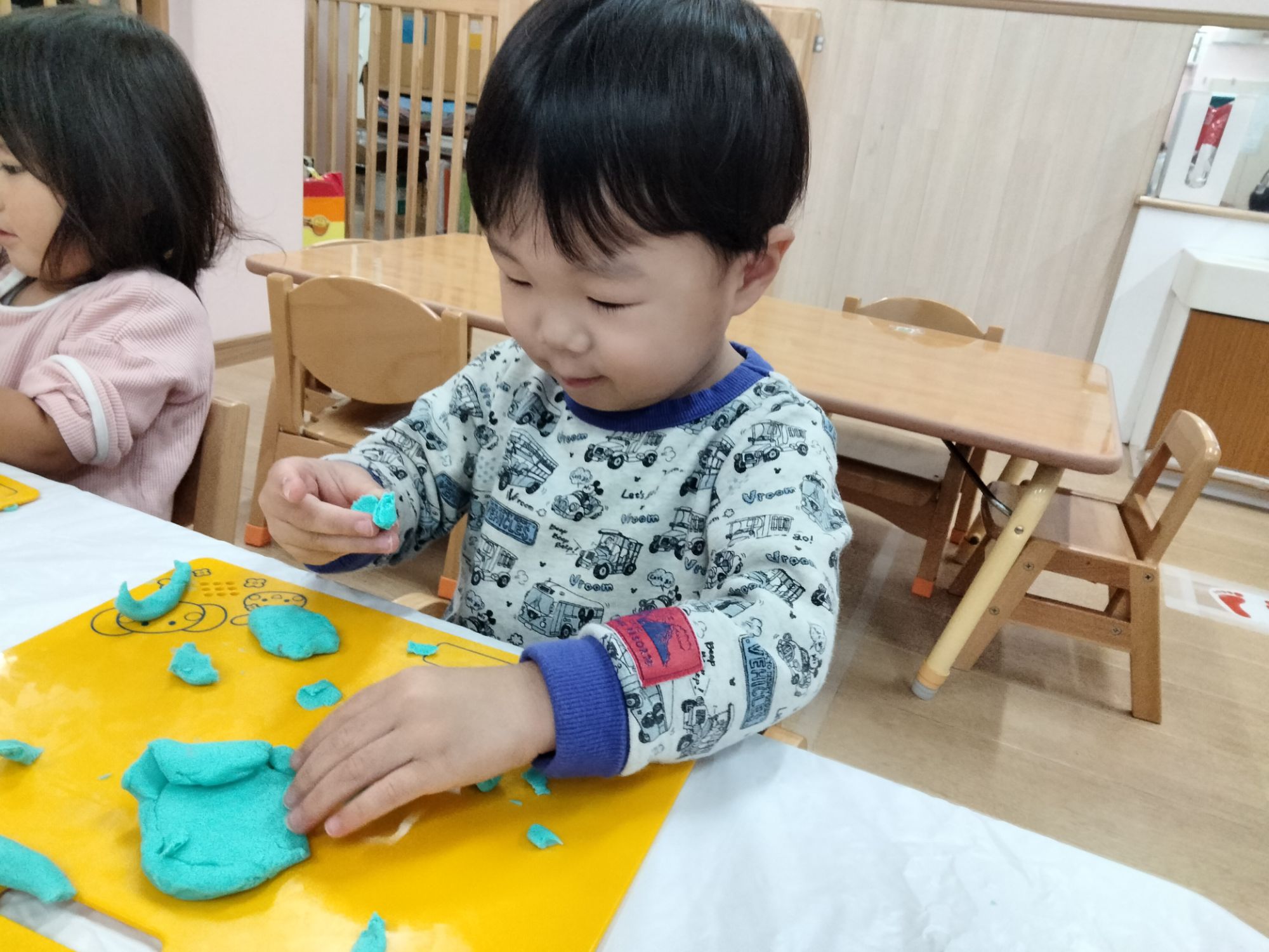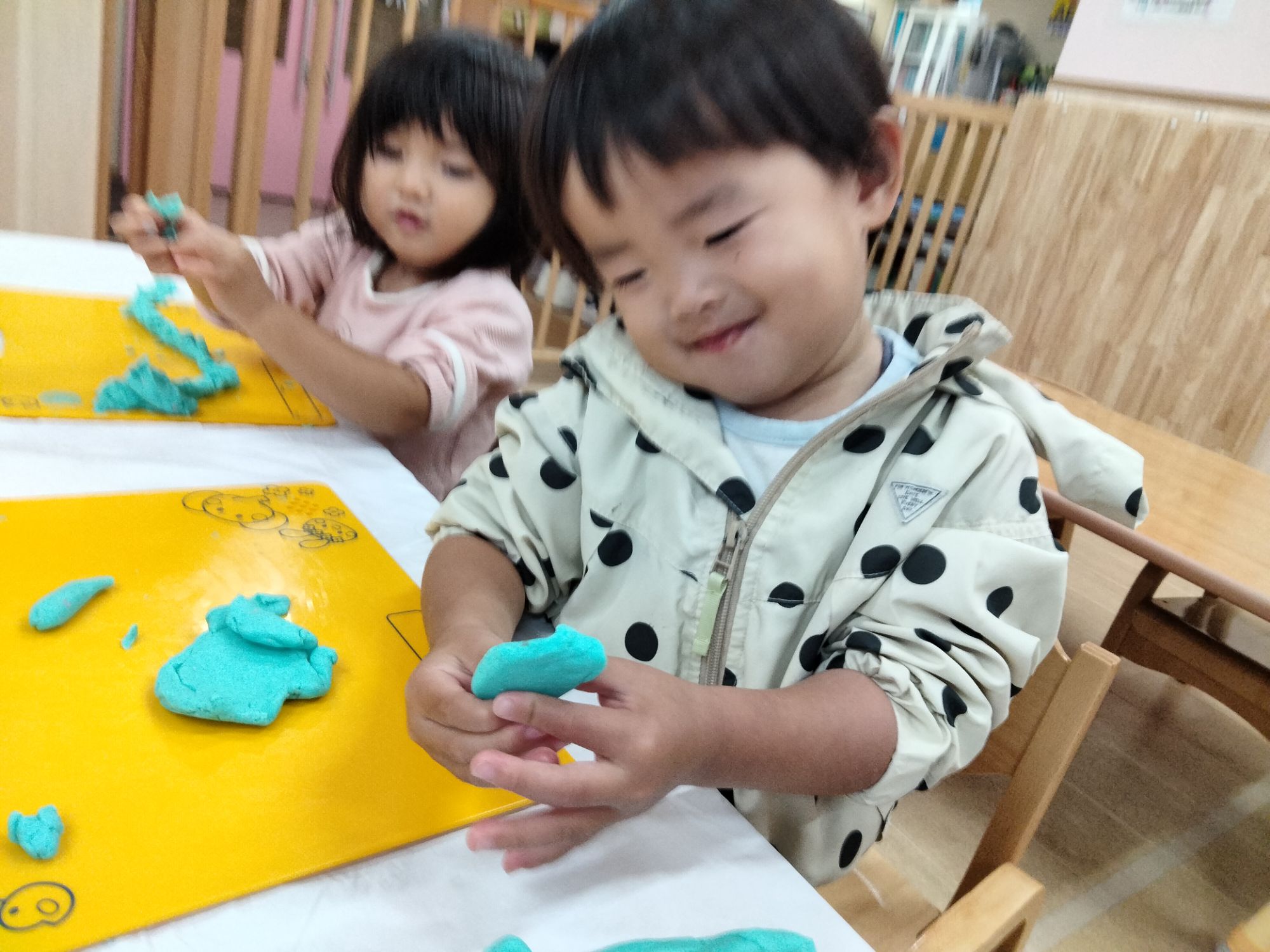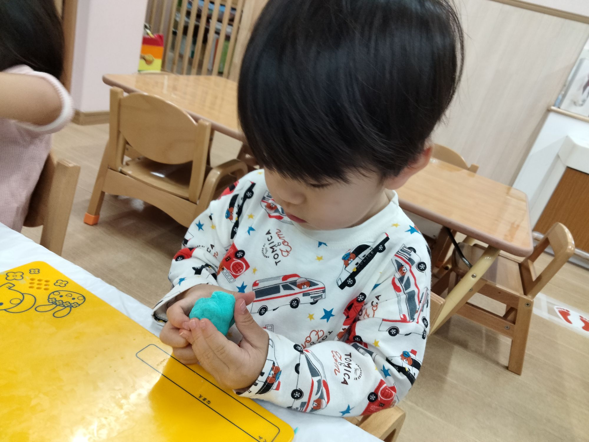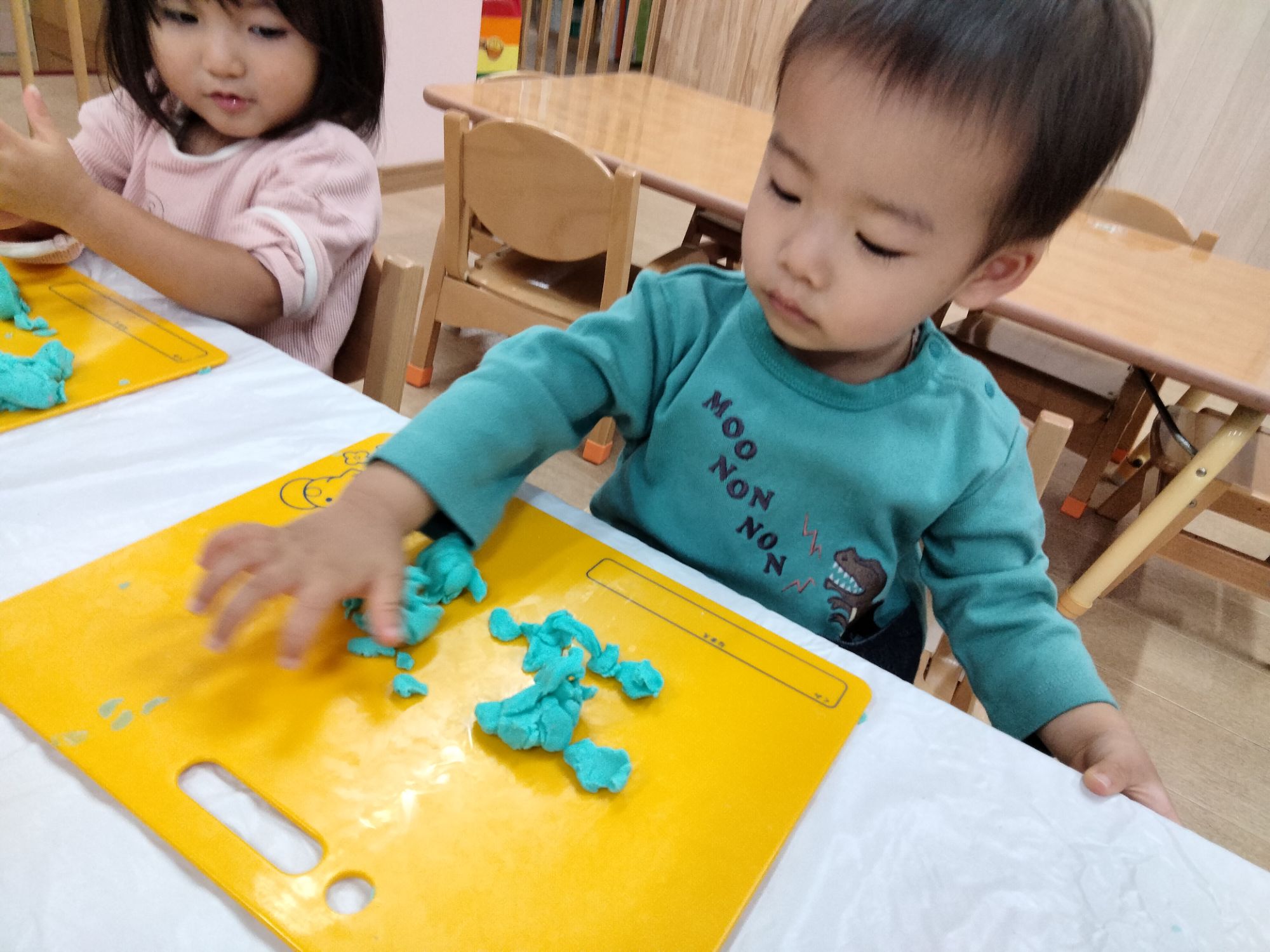 柔らかい粘土の感触を通して、手指の発達だけでなく、感じたことを表現する力や友だちとのやりとりも育っています。これからも、いろいろな素材に触れながら、感性や表現の芽を大切にしていきたいと思います👍🏻