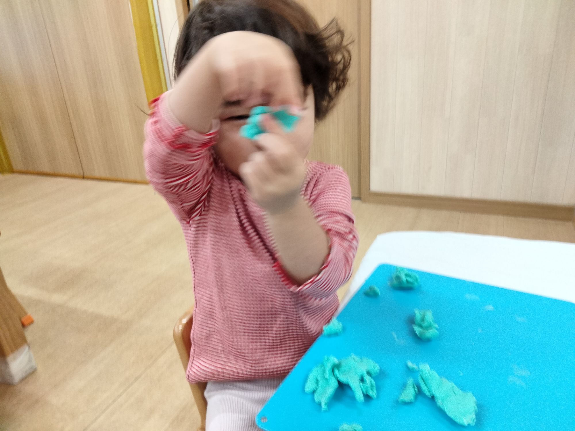 指先でつまんだり、両手でこねたりしながら感触を楽しみ、「やわらか〜い」「びよーん!」と声を出して嬉しそうにする姿が見られました。