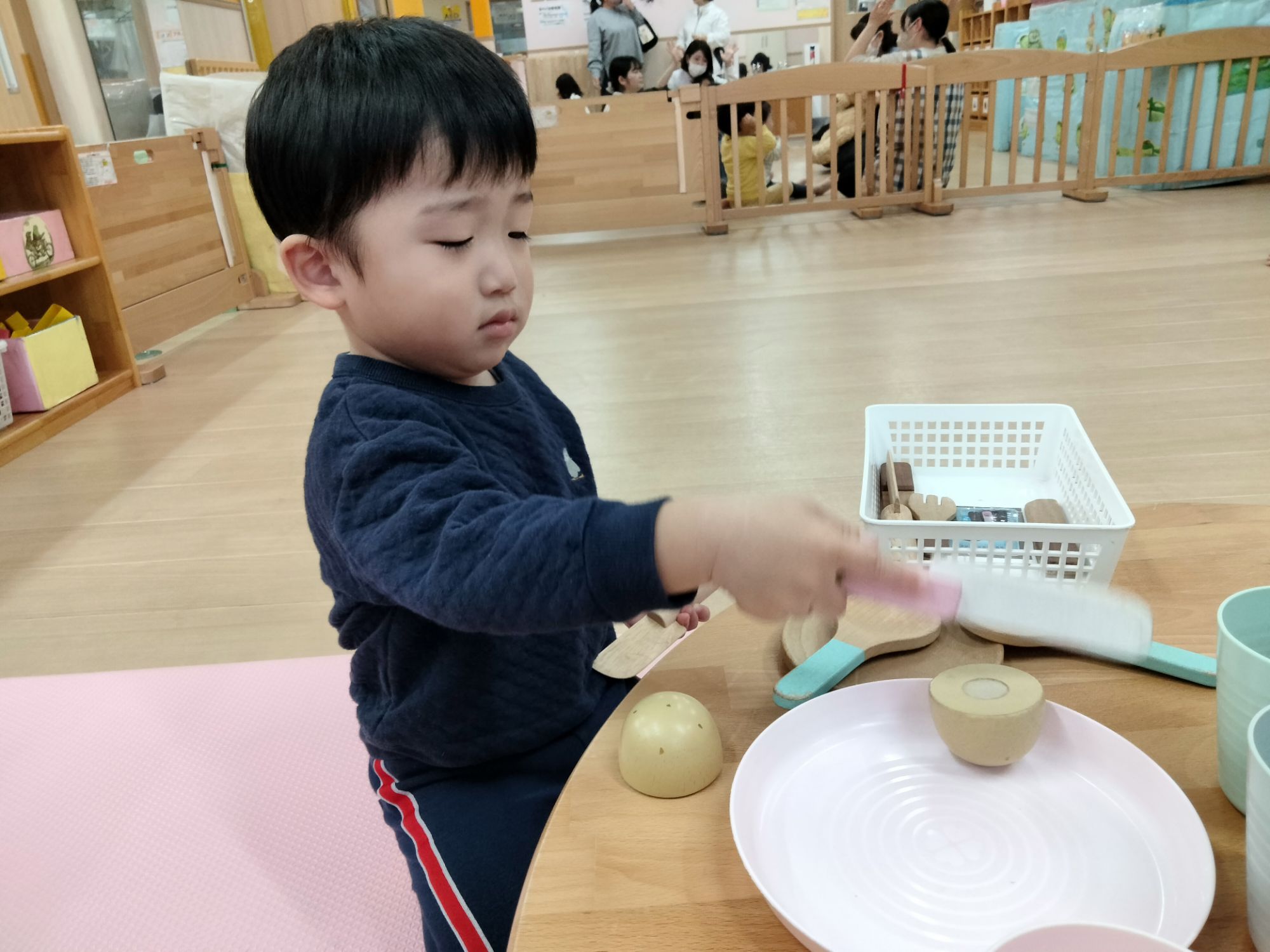 テーブルを出すと自然とテーブルの上にお皿やコップを並べ始めていました!好きな食材をお皿にのせて、包丁でトントンと切ってお料理をしていました(*^^*)