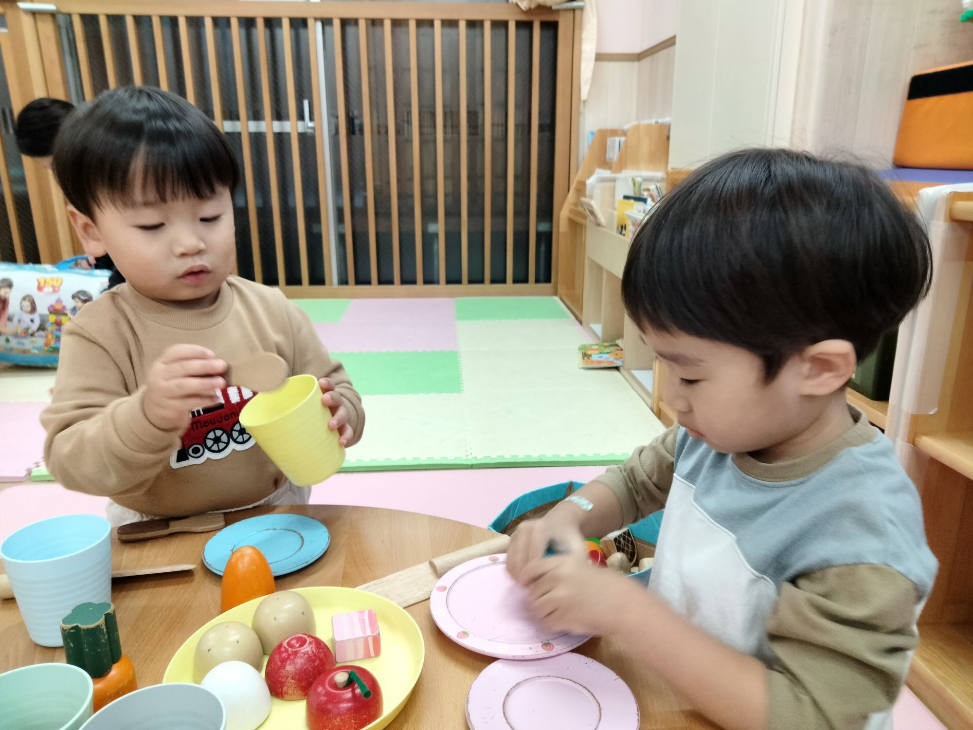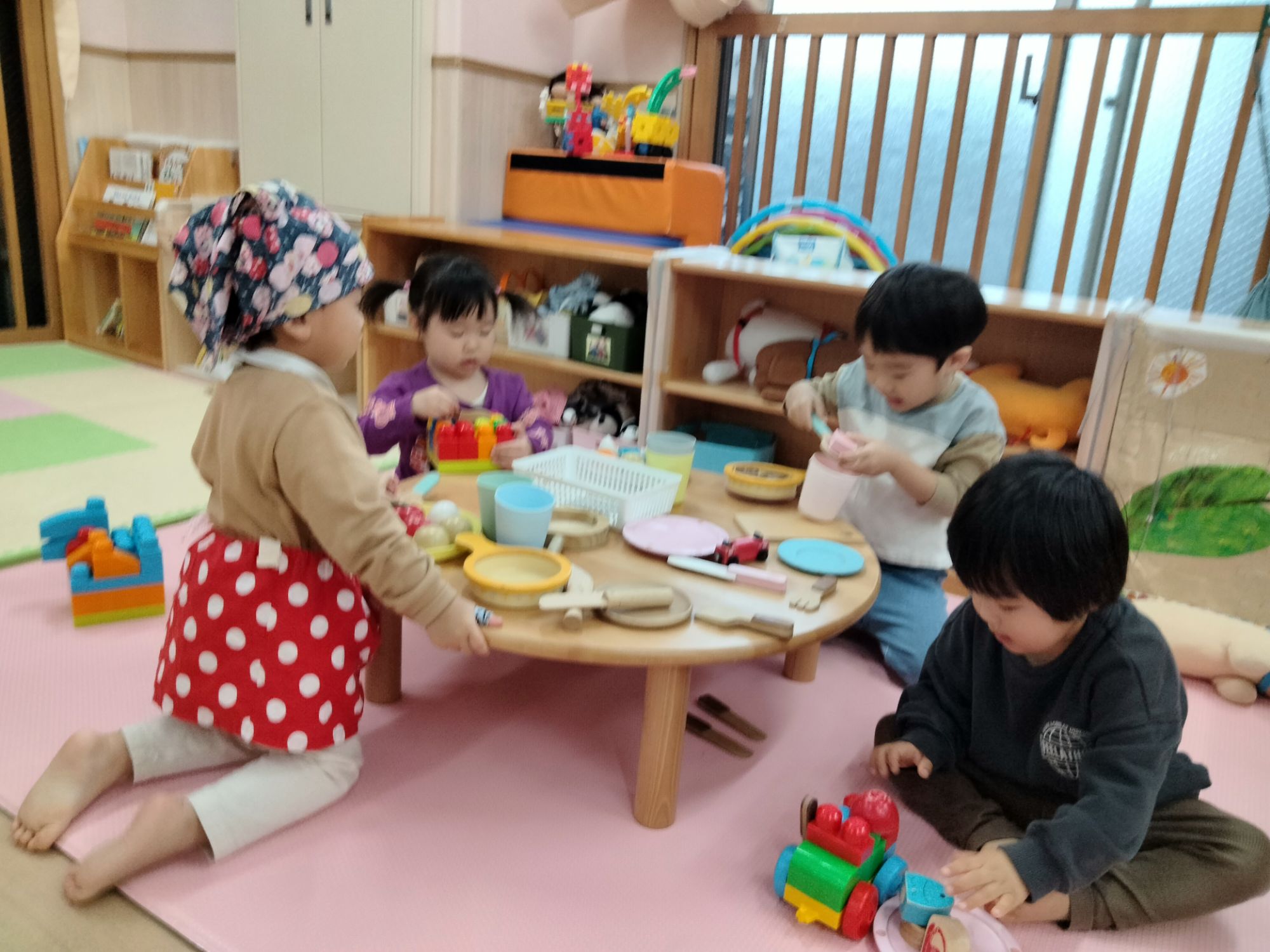 保育者が仲立ちをしなくても、こどもたち同士でやり取りする姿も増えてきました😊相手がいることも意識し始めたにじ組🌈さんです!