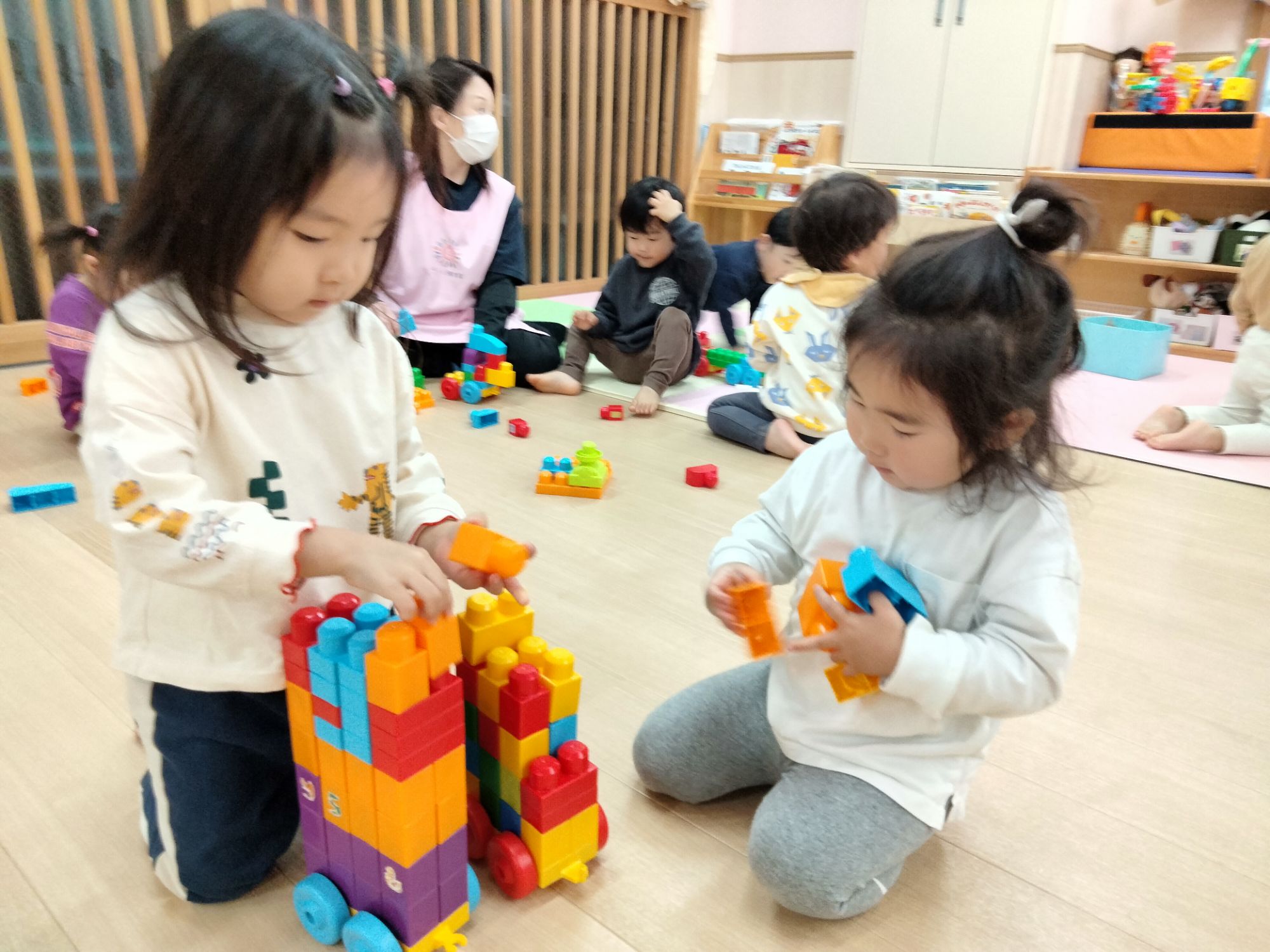 「一緒にやろ〜」と誘って、ブロックを友だちと一緒に高く積み上げたり