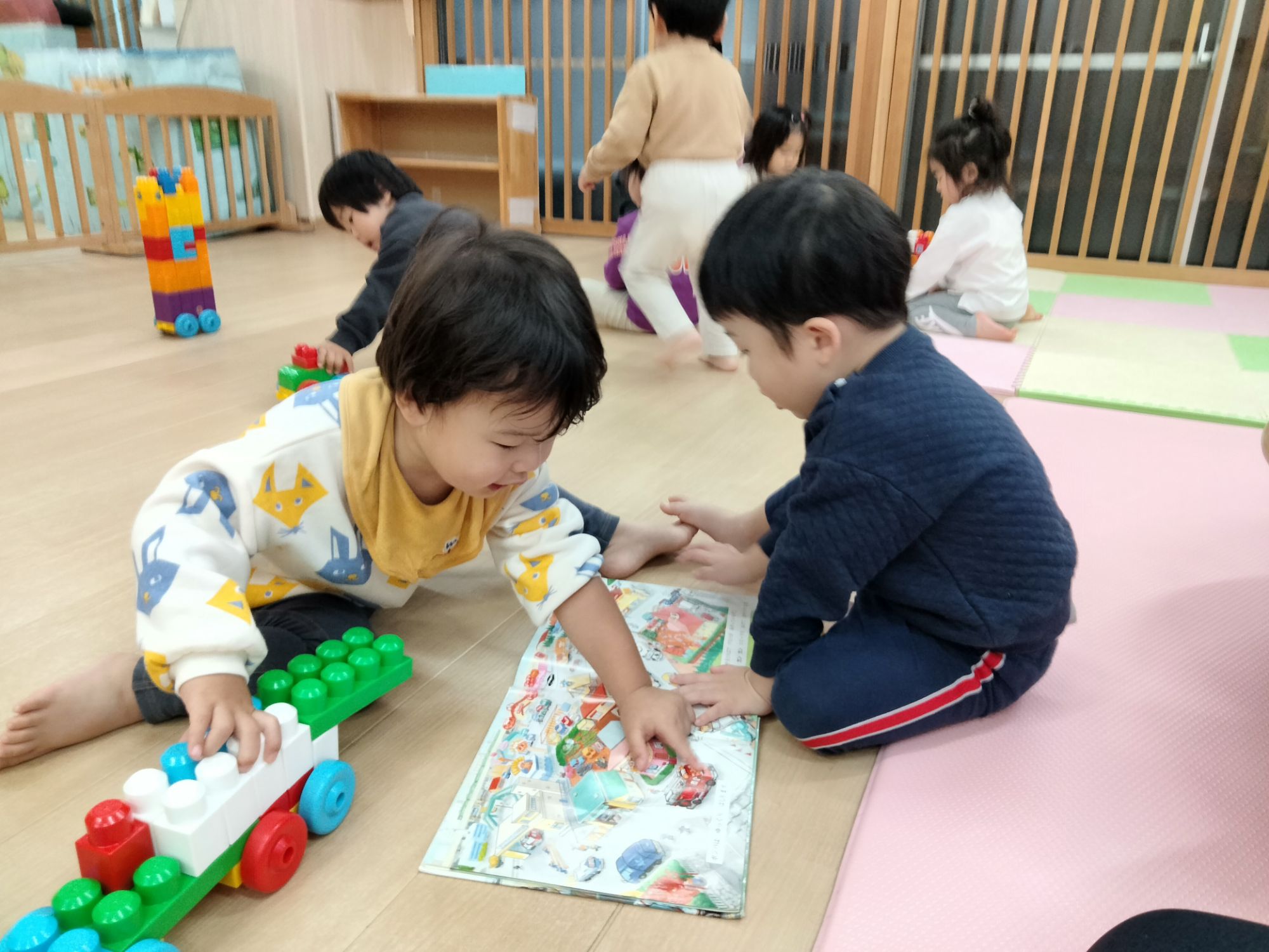 「これ、消防車🚒だね」「そうだね」「こっちは?」と絵本を友だちと一緒に見ながら、やり取りをしている姿が見られましたよ✨️