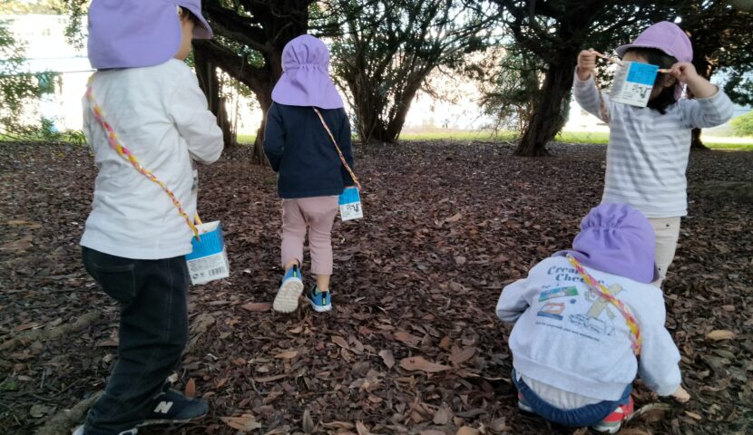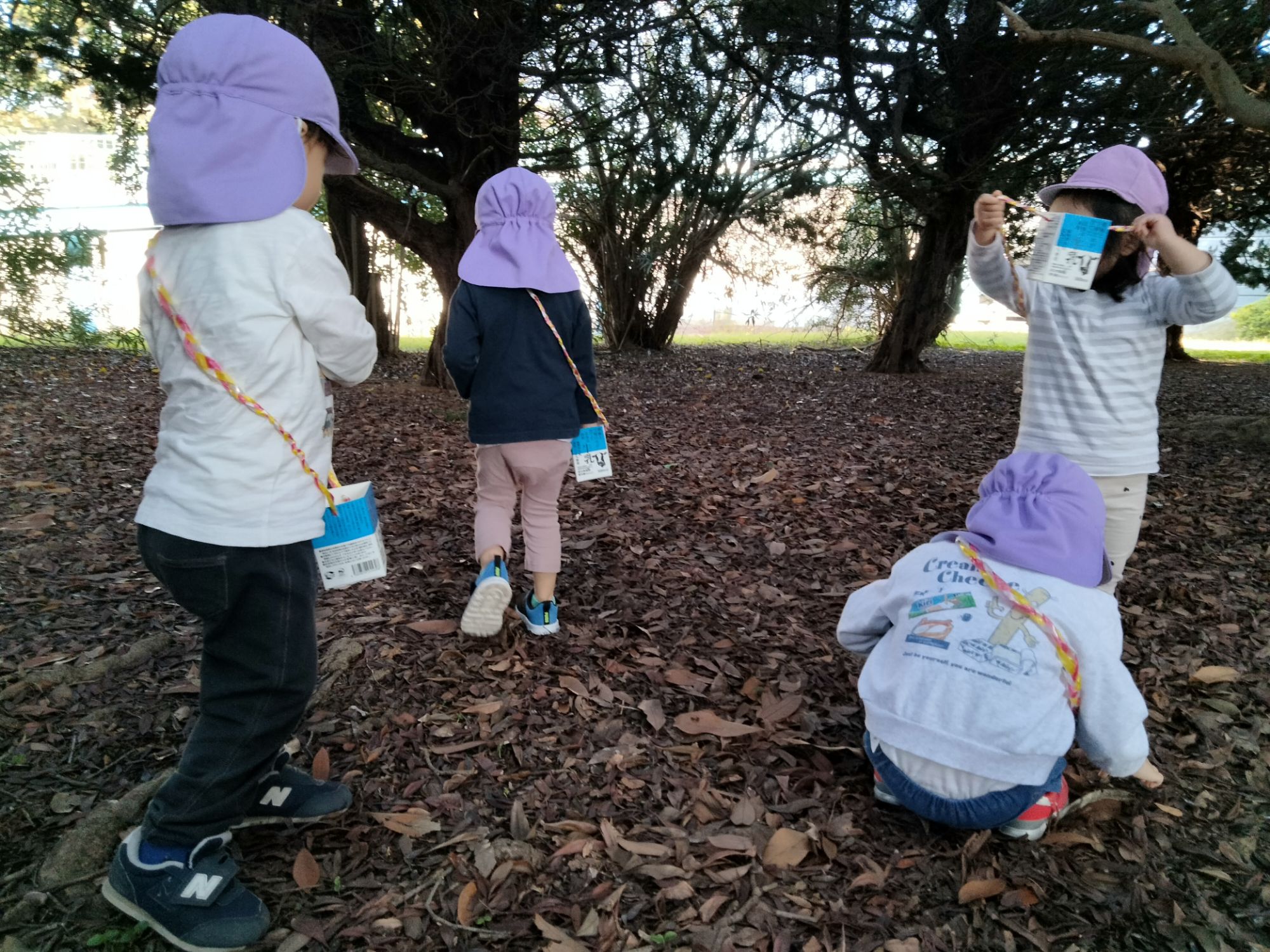 どんぐりだけを集めたり、石や葉っぱなど色々な種類を集めたりとそれぞれのお気に入りをバッグに詰めていました😊
