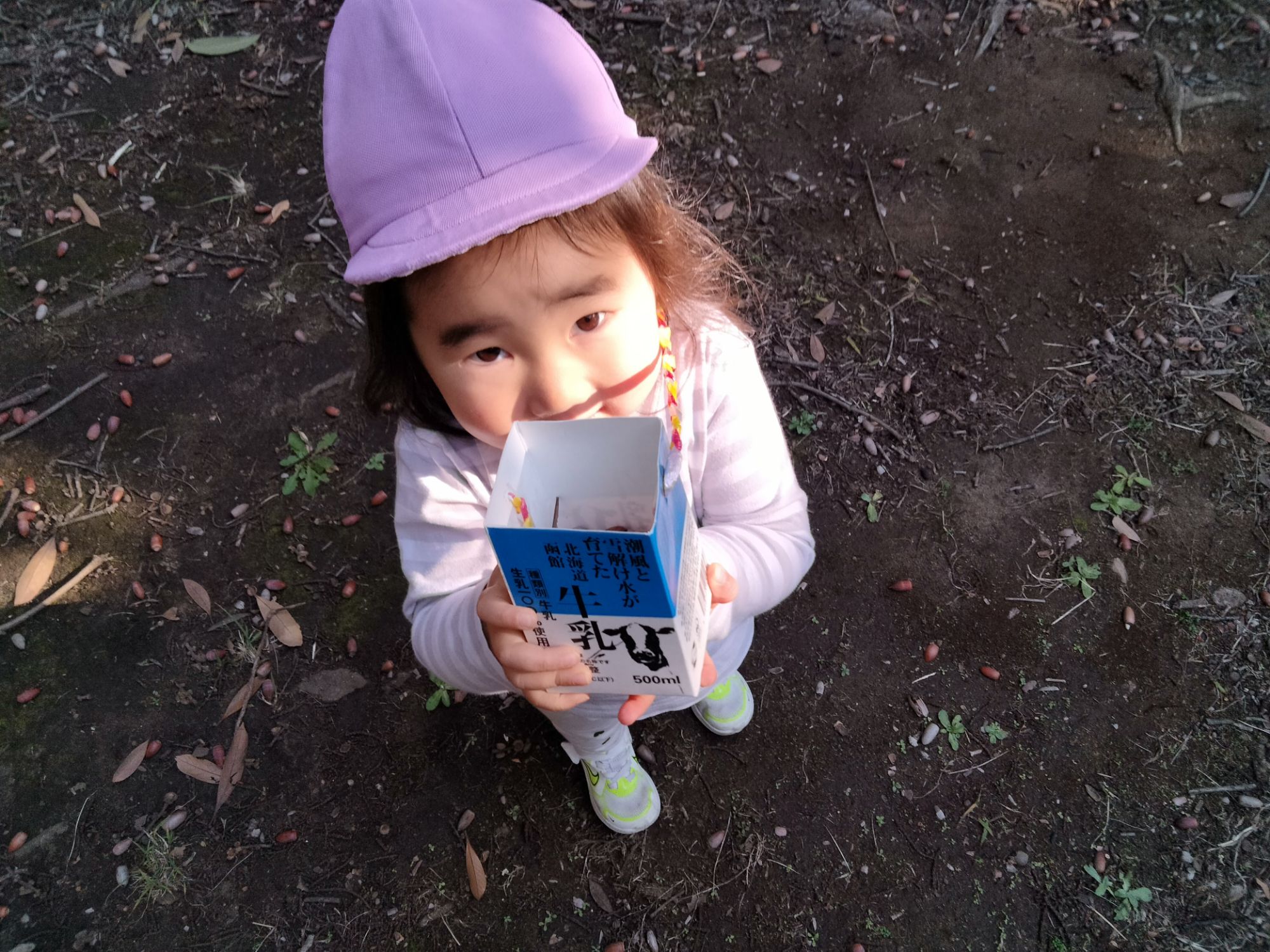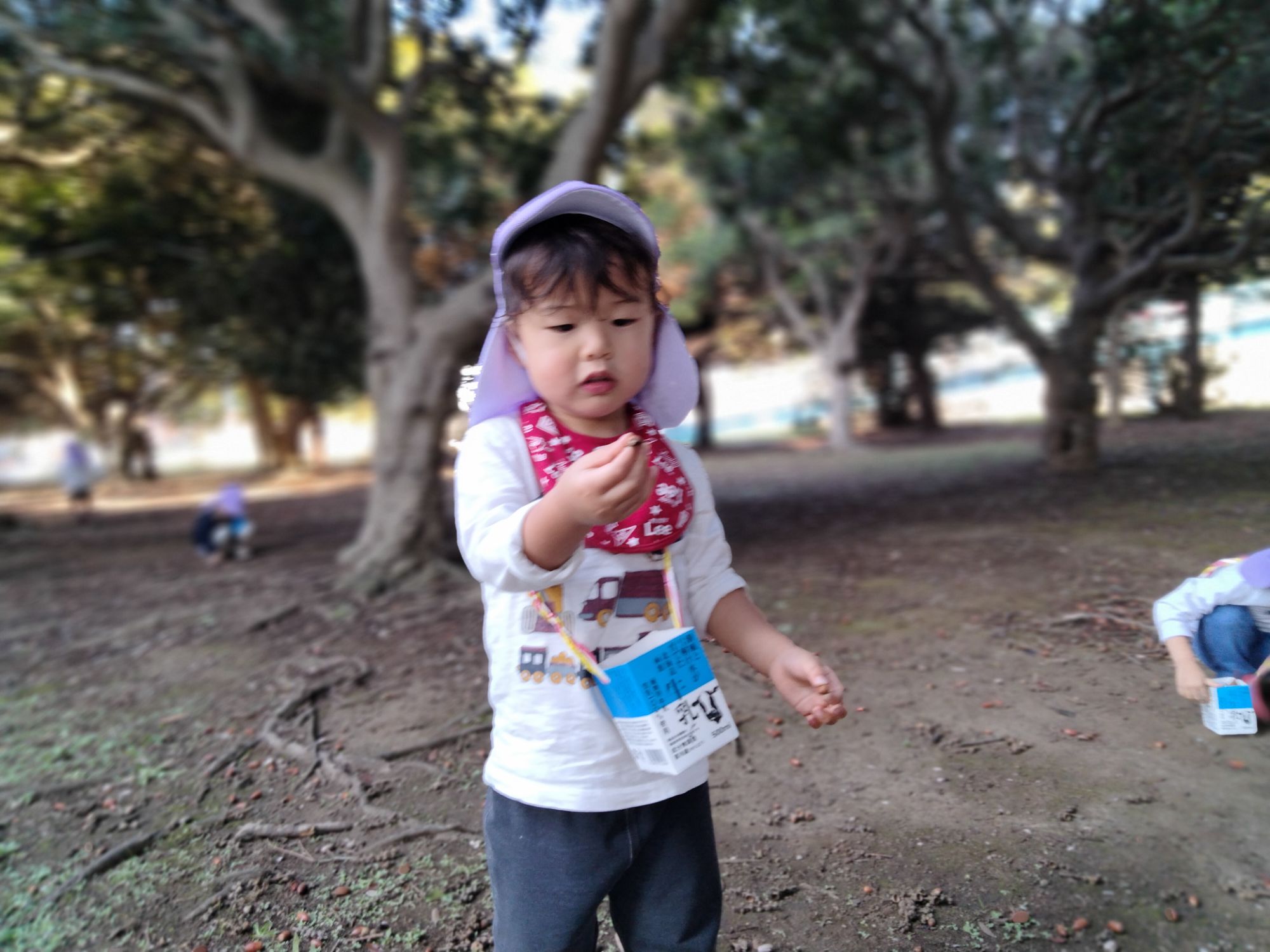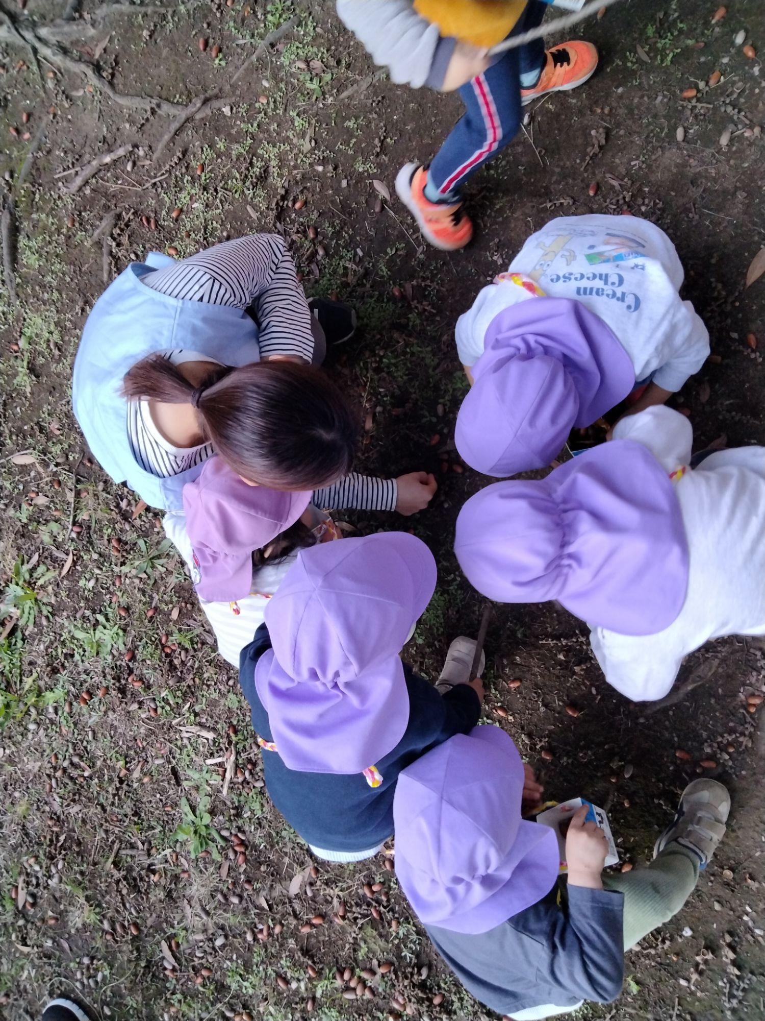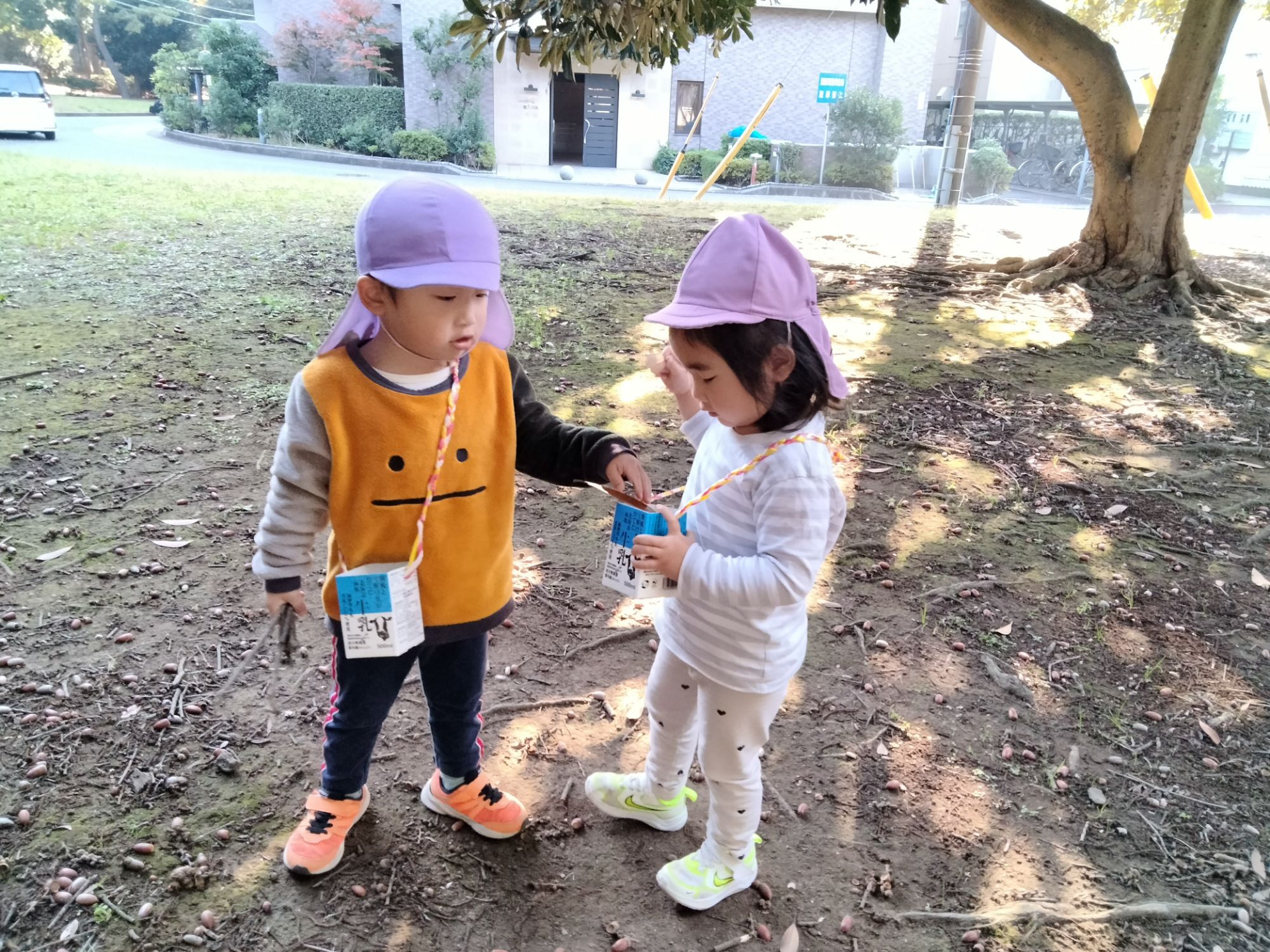 緑地帯にはどんぐりや葉っぱ、石や枝などいろいろな自然物があり見つけると「見て〜!」と持ってきてくれる子どもたち。