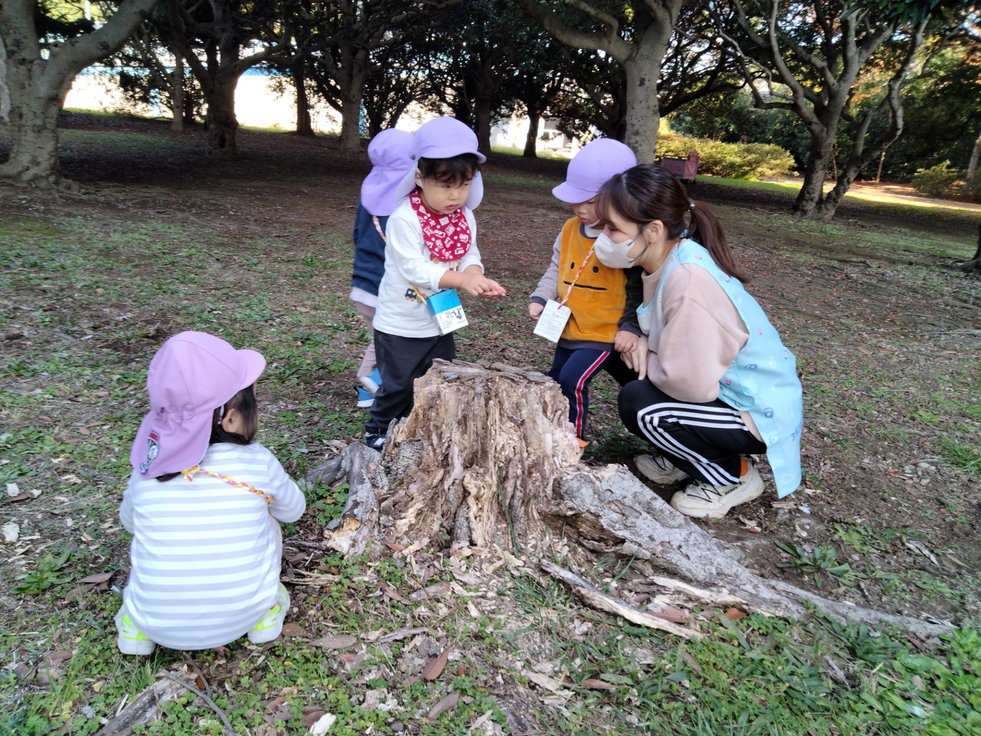 木の幹にもアリを見つけ、拾ったどんぐりを「おやつだよ〜!」と配達してくれる優しいにじ組さんでした🤭