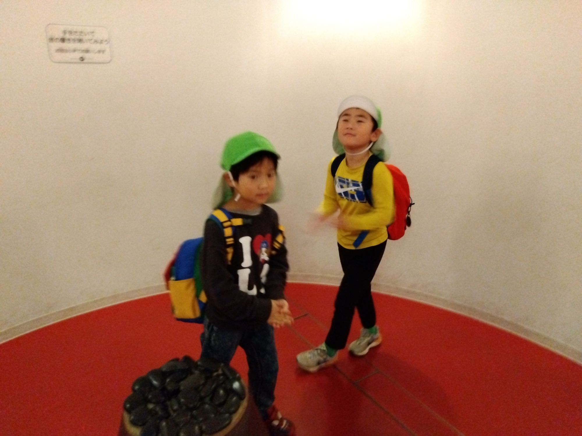 錯覚の部屋。寝転がり目をつぶって10数えて目を開けると…『あれ?』床の畳は真っすぐなはずなのに、畳が斜めに落ちてしまいそうな感覚。『なんで??』『こわーい』と感じたことを友達と伝え合い、体験したことを共有。