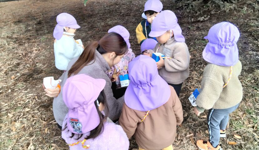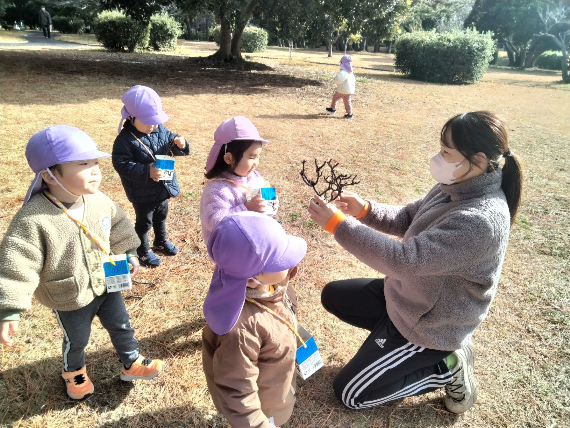 公園に到着後は、見つけた木の実や枝、葉っぱをかばんの中に入れる前に保育者へ見せにきてくれたり