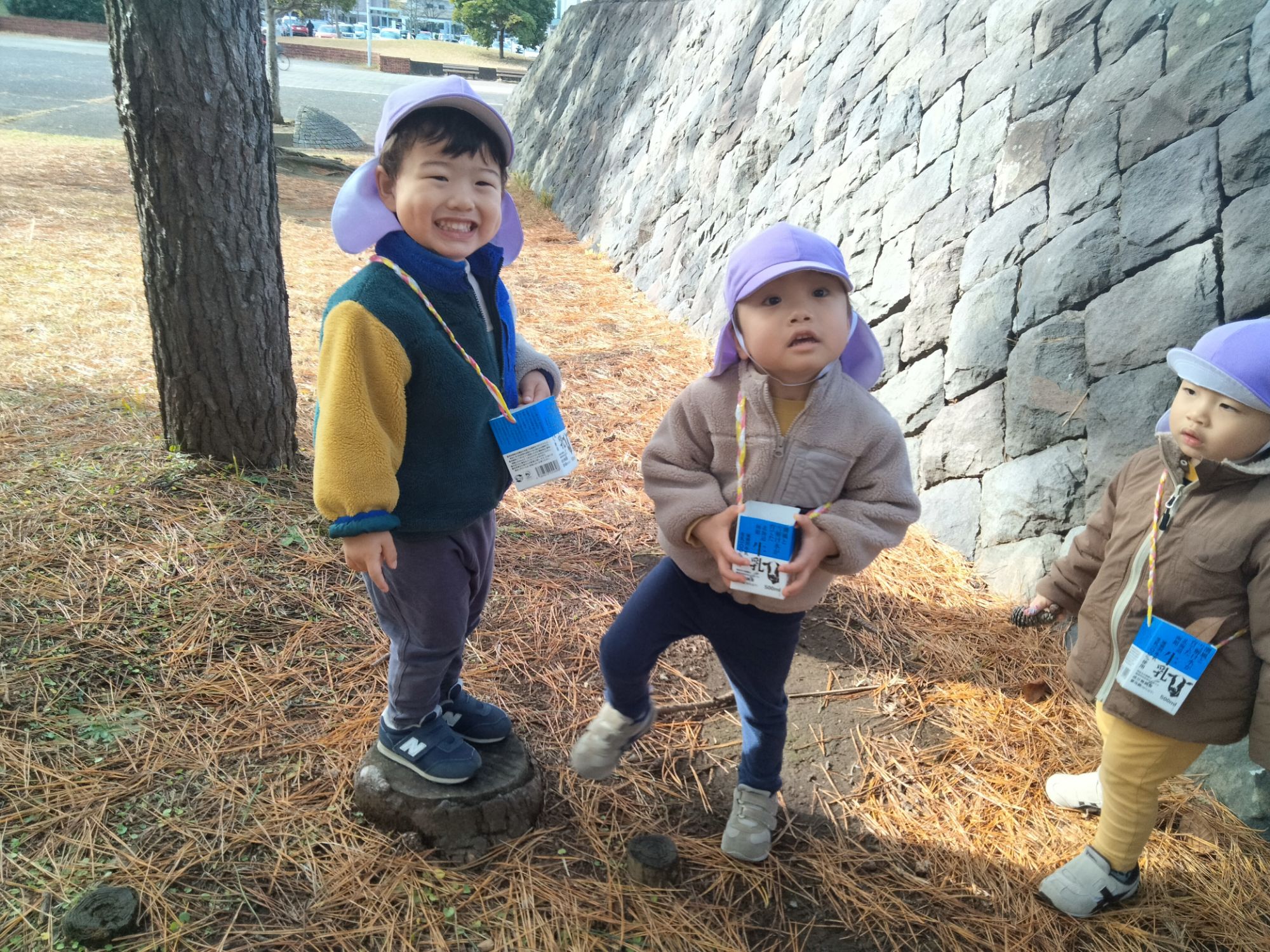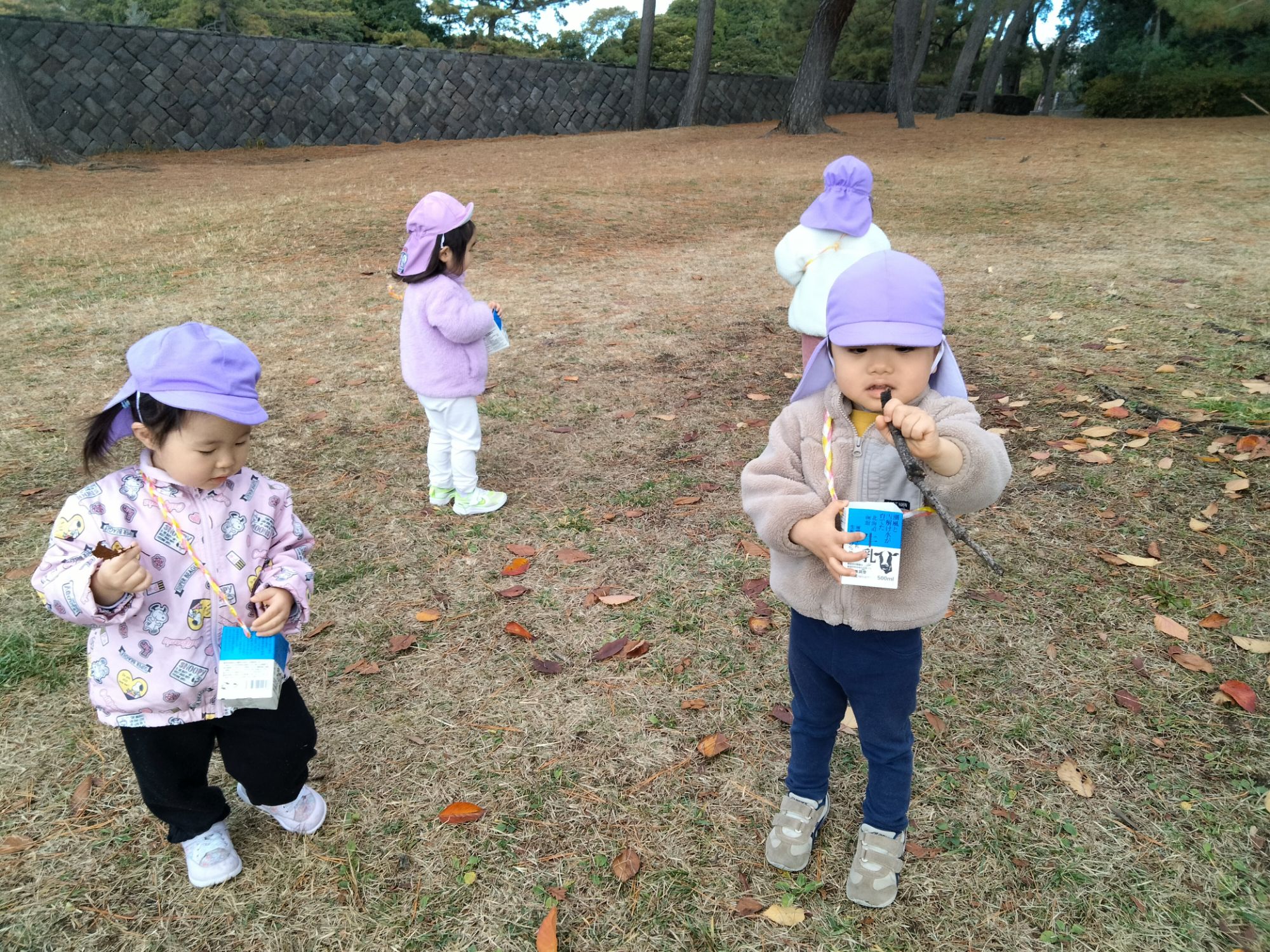 どんぐりの木の下にたくさん落ちていたどんぐりを見て「どんぐり大きいね」「帽子だけ落ちてるね」とお話しながら拾っていました🍂🍁