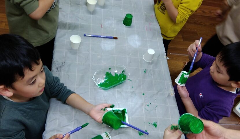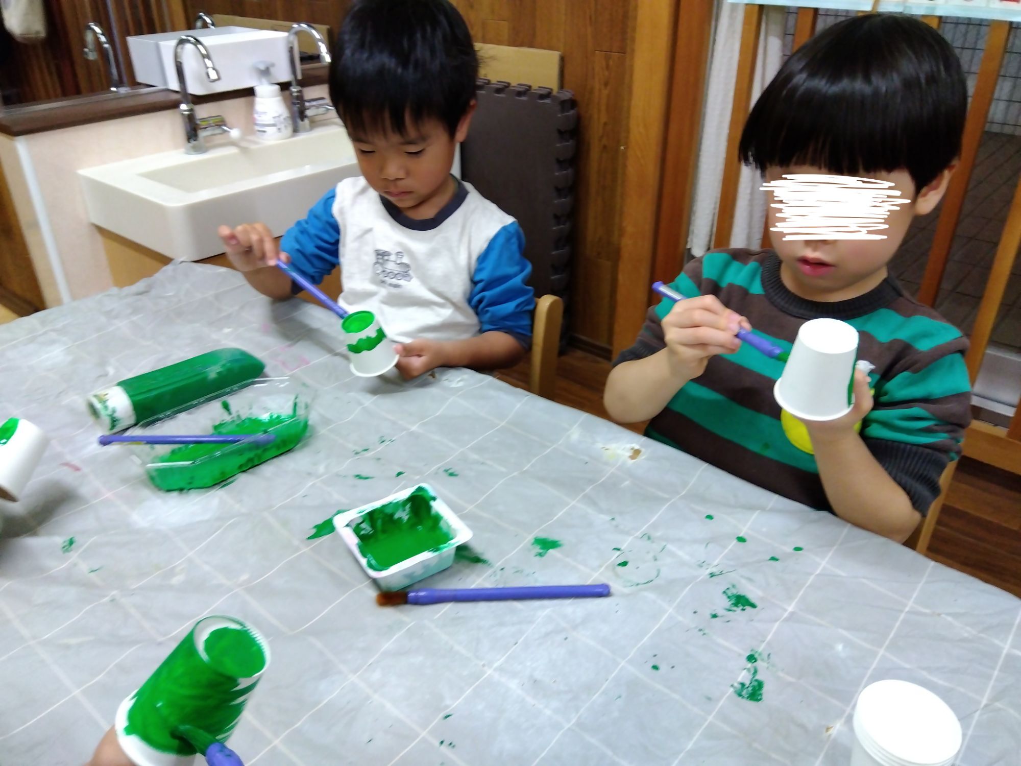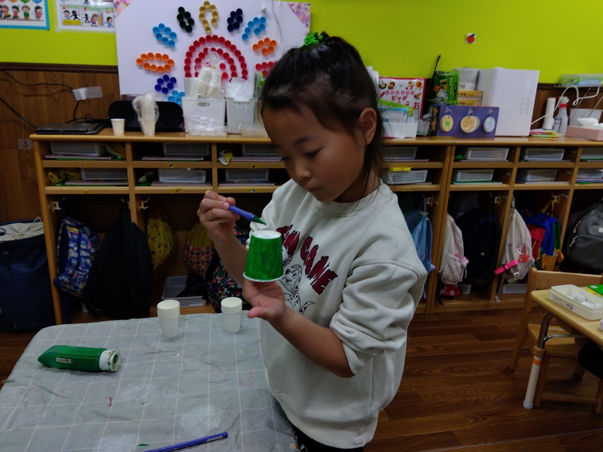 平面ではなく不安定な立体物に色づけ…紙コップを動かしながら全体に色を塗る…見た目以上に難しい作業になります!