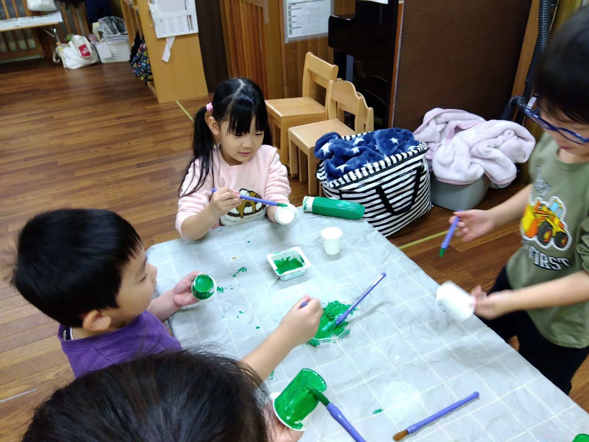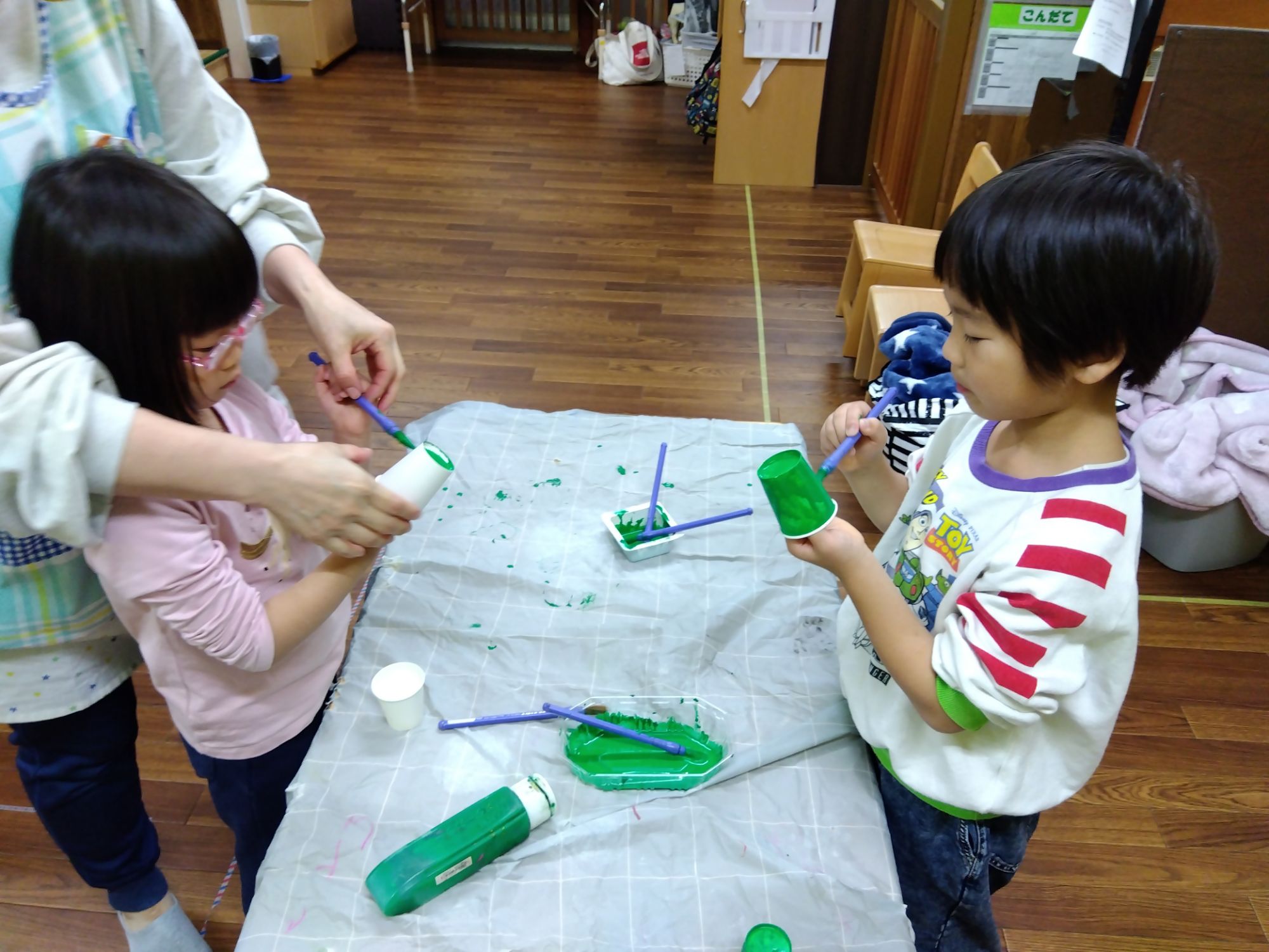 真剣に絵の具を塗ります『白い所ないかなぁ…』よく見て塗ります。